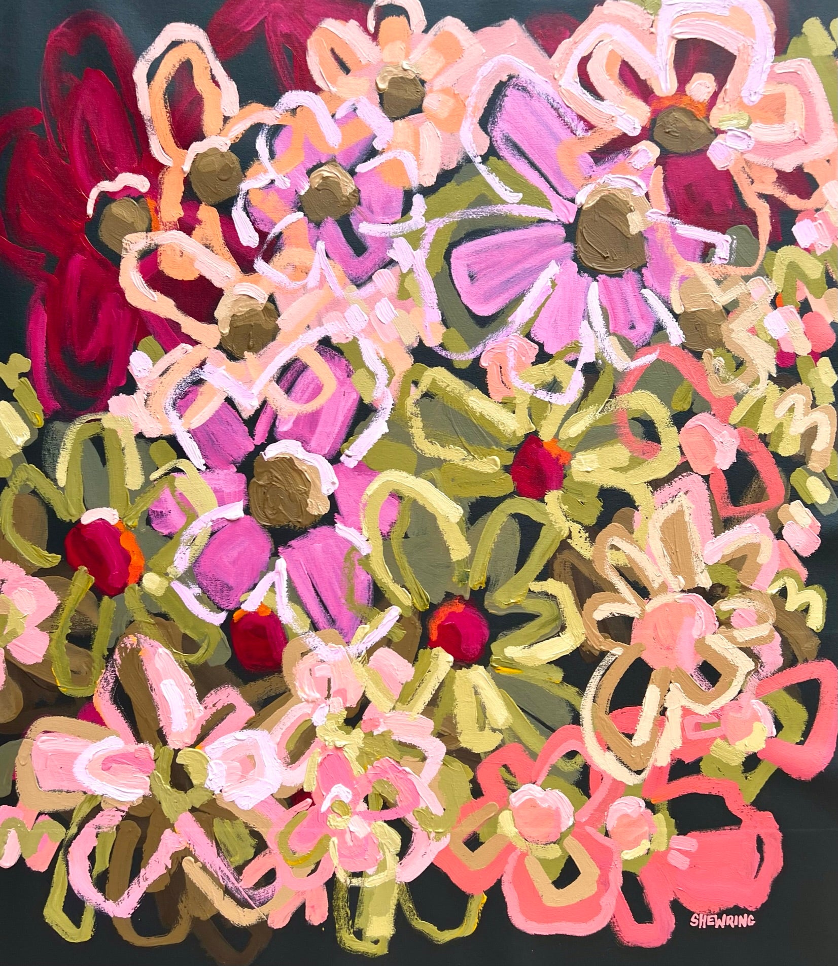 This artwork is full of life, movement and colour with joyous flowers.