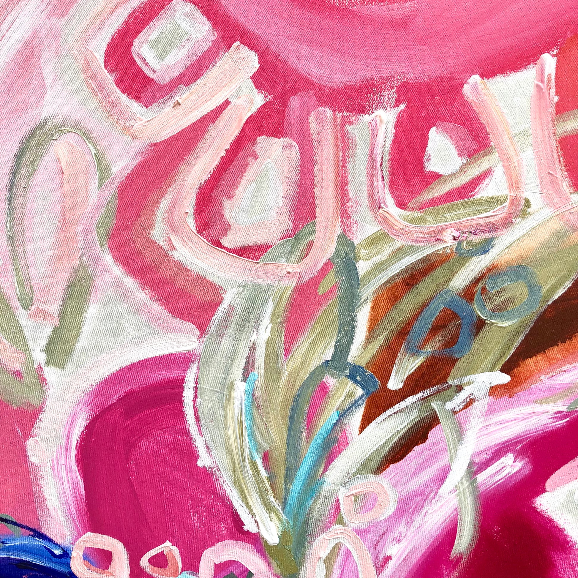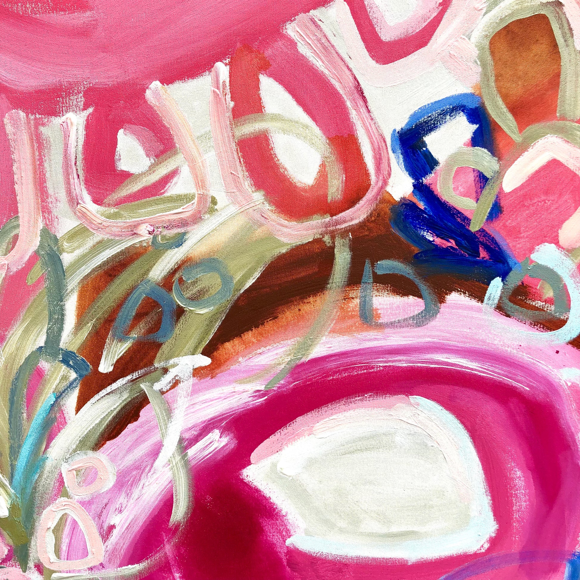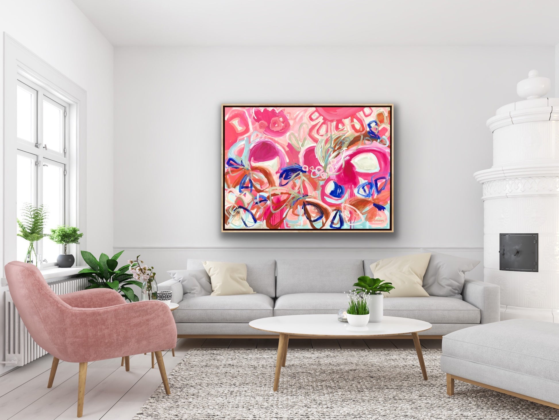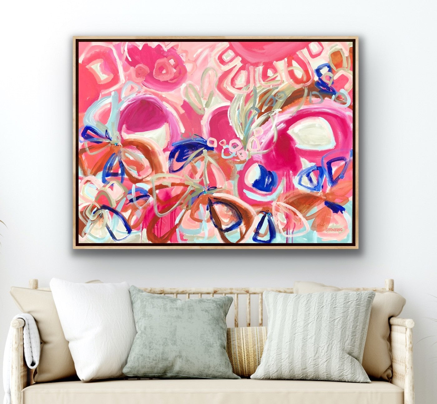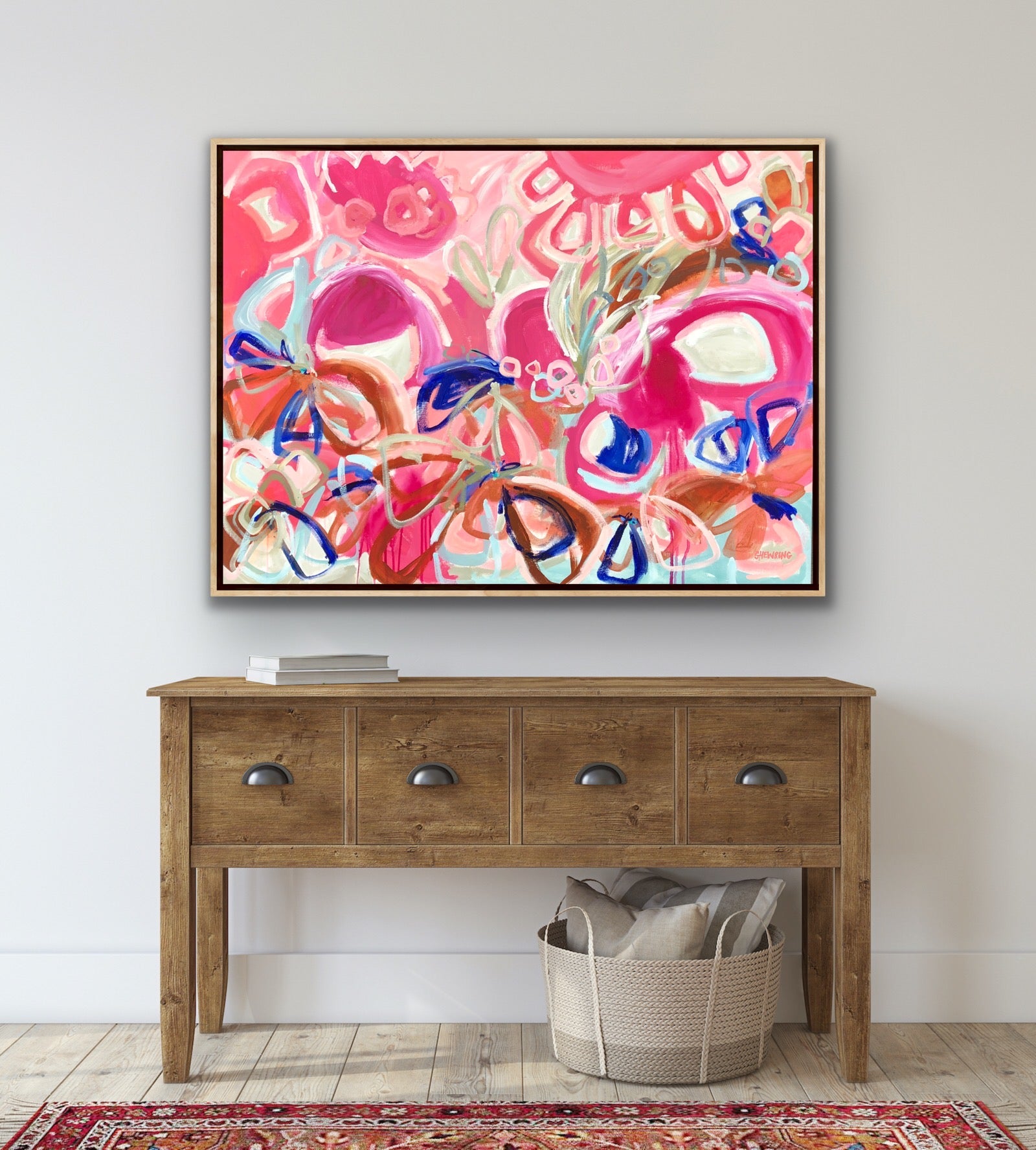 Lovers Forever is a bright and really happy flower abstract with delicious melons, pinks and berry colours inspired by the beautiful petals in my garden along with a splash of warm earth tones and a sparkle of copper paint. The impressionistic style of the organic shapes were created from my many sketches of foliage and painted in olive greens, navy blues and a touch of turquoise.