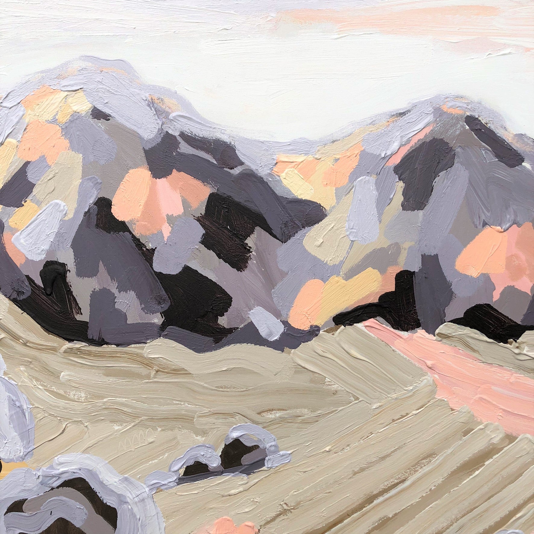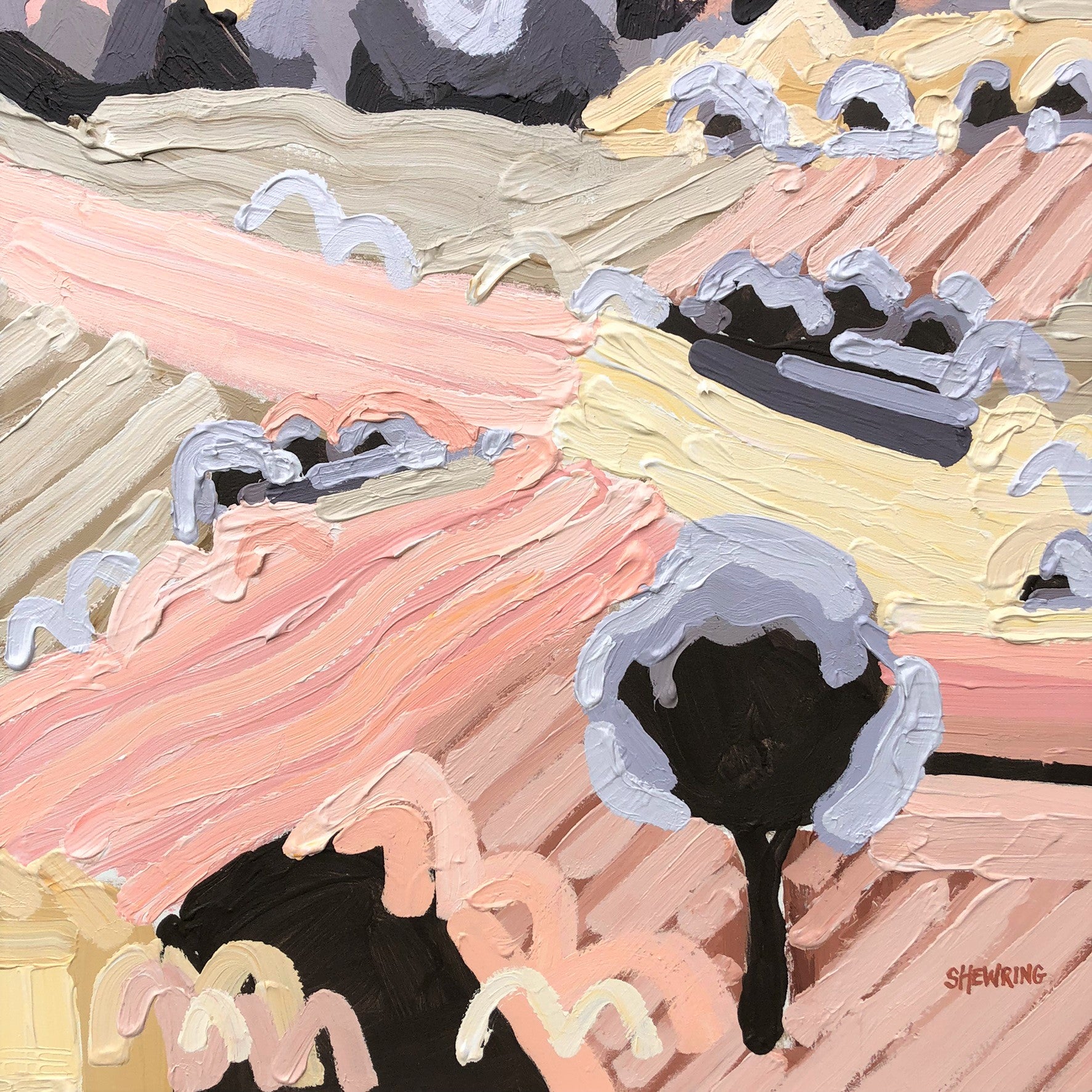 Macedon Mist was inspired by my visit to the beautiful Victorian countryside around Mount Macedon in Australia. From the property where we were staying was a view straight out to the majestic misty mountaintop and the lush grasslands below were covered in kangaroos basking in the sunshine. I wandered into these fields and found that the kangaroos all stopped eating and grooming to stare at me! It was a wonderful moment. I've tried to capture the warmth of the day and the peaceful feeling of the countryside into this painting.