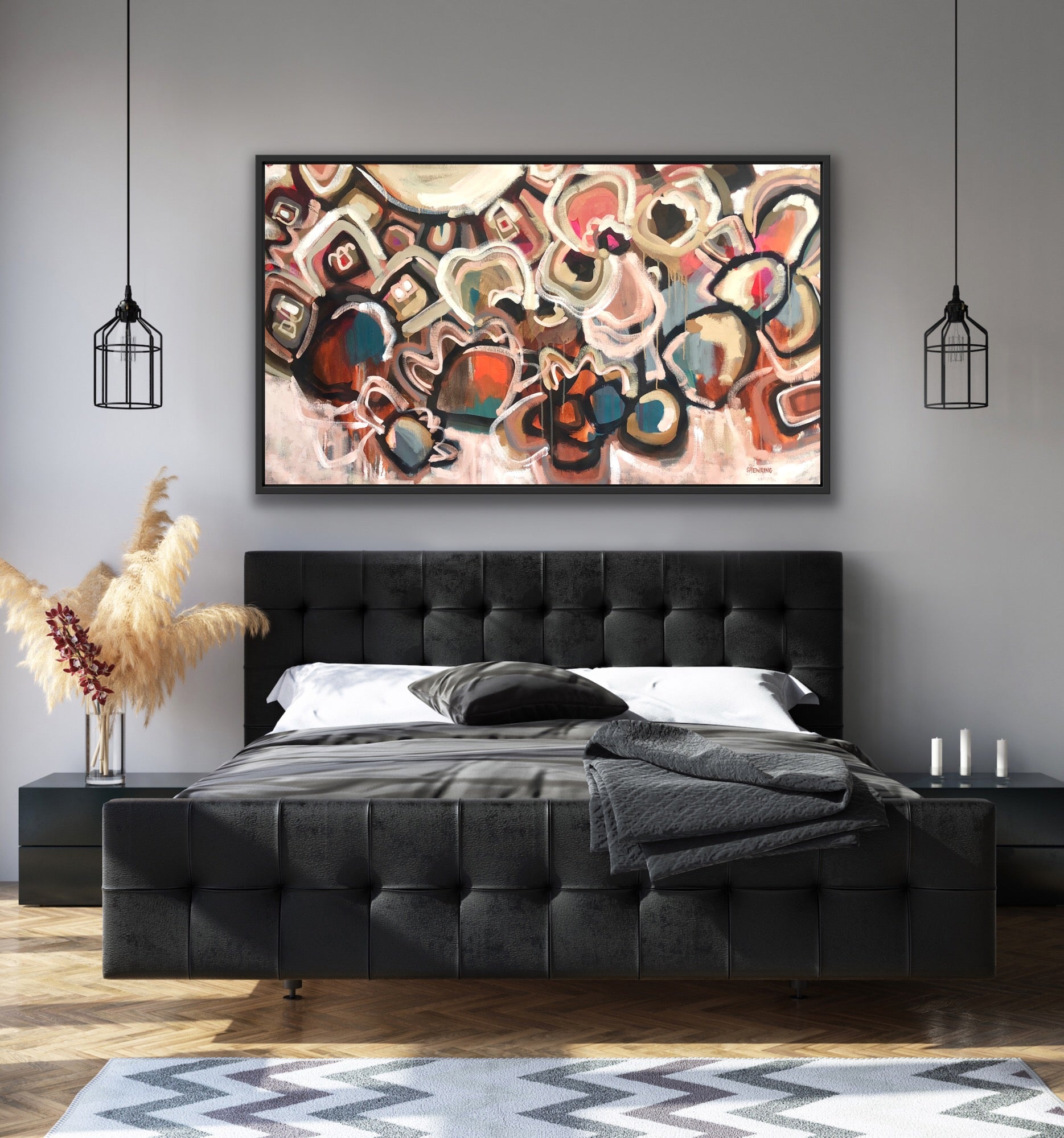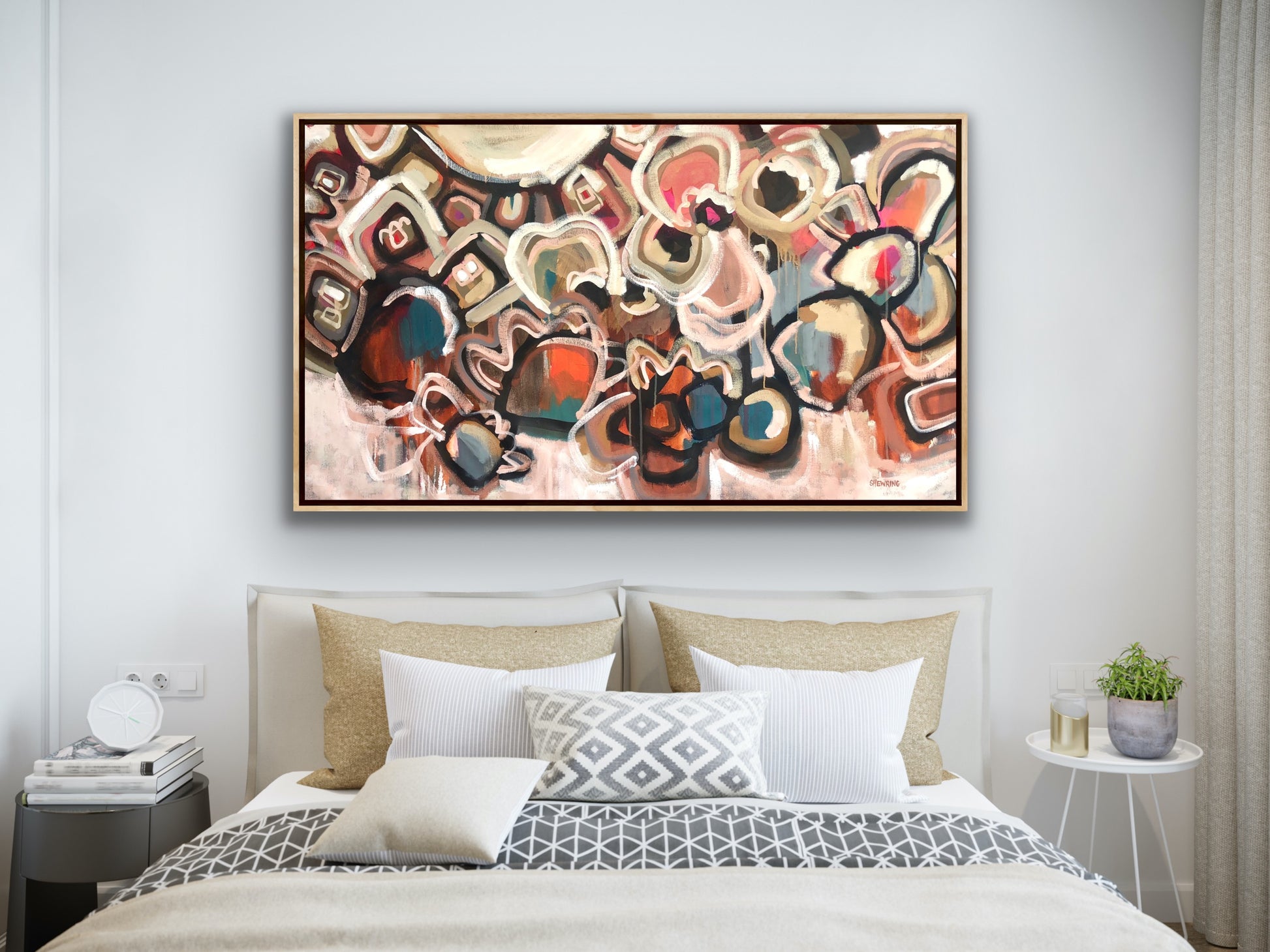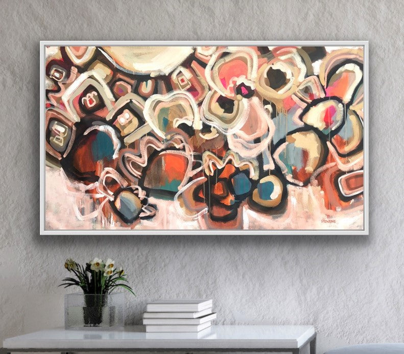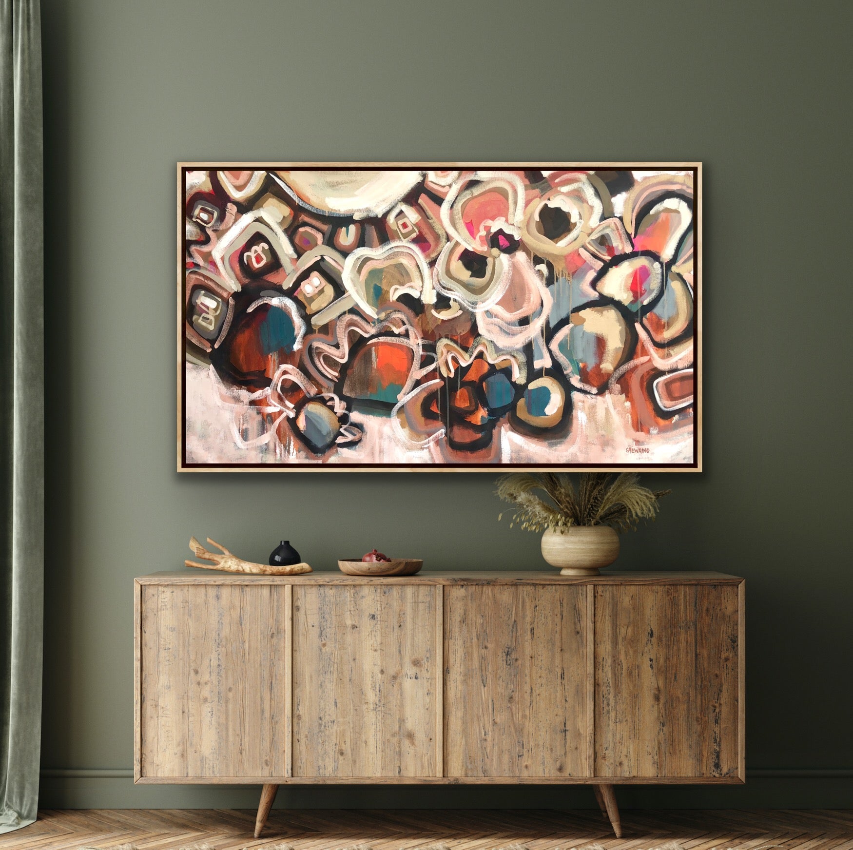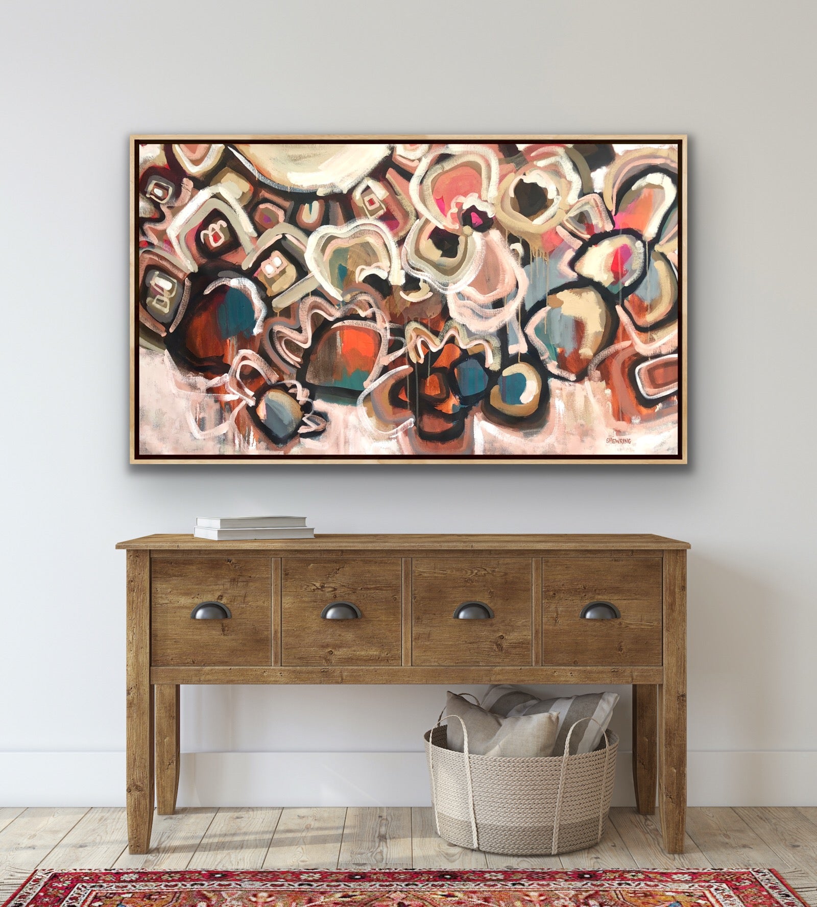 Moroccan Nights packs a big bright punch of bold Moroccan inspired colour! Powerful abstract with bright creams, earthy tones, emerald greens, burnt orange, bright red and pink highlights. This painting has expressive individual brushstrokes that bring it to life!