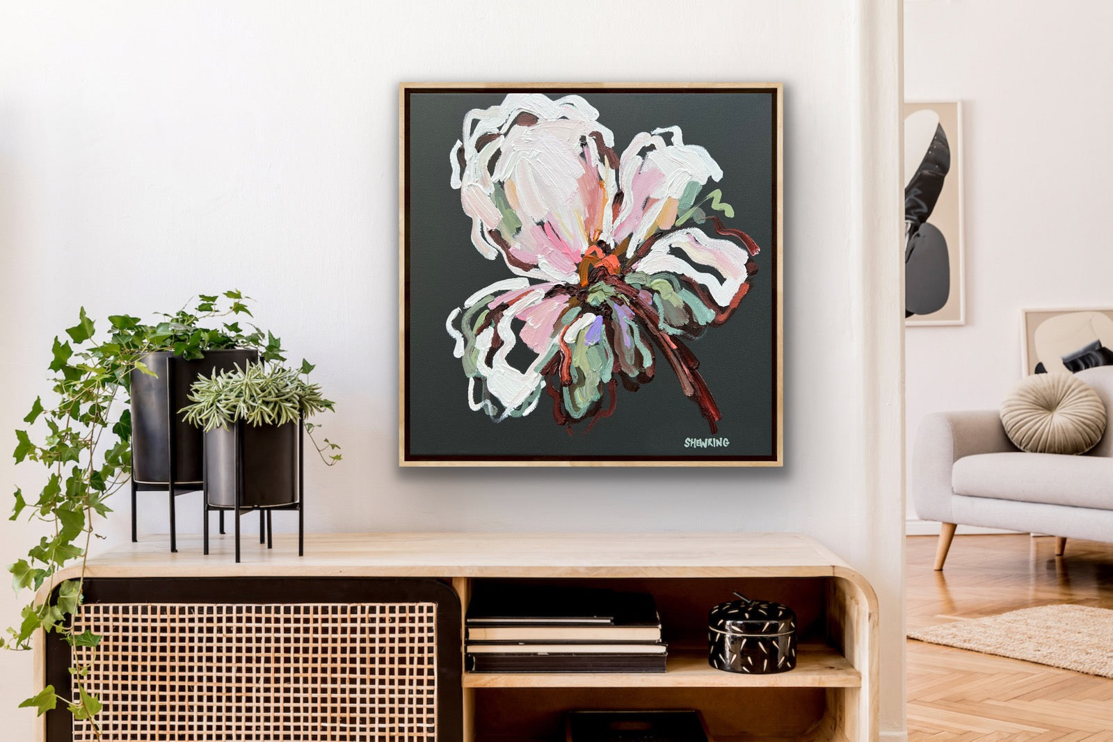 Framed in oak natural timber float frame.
