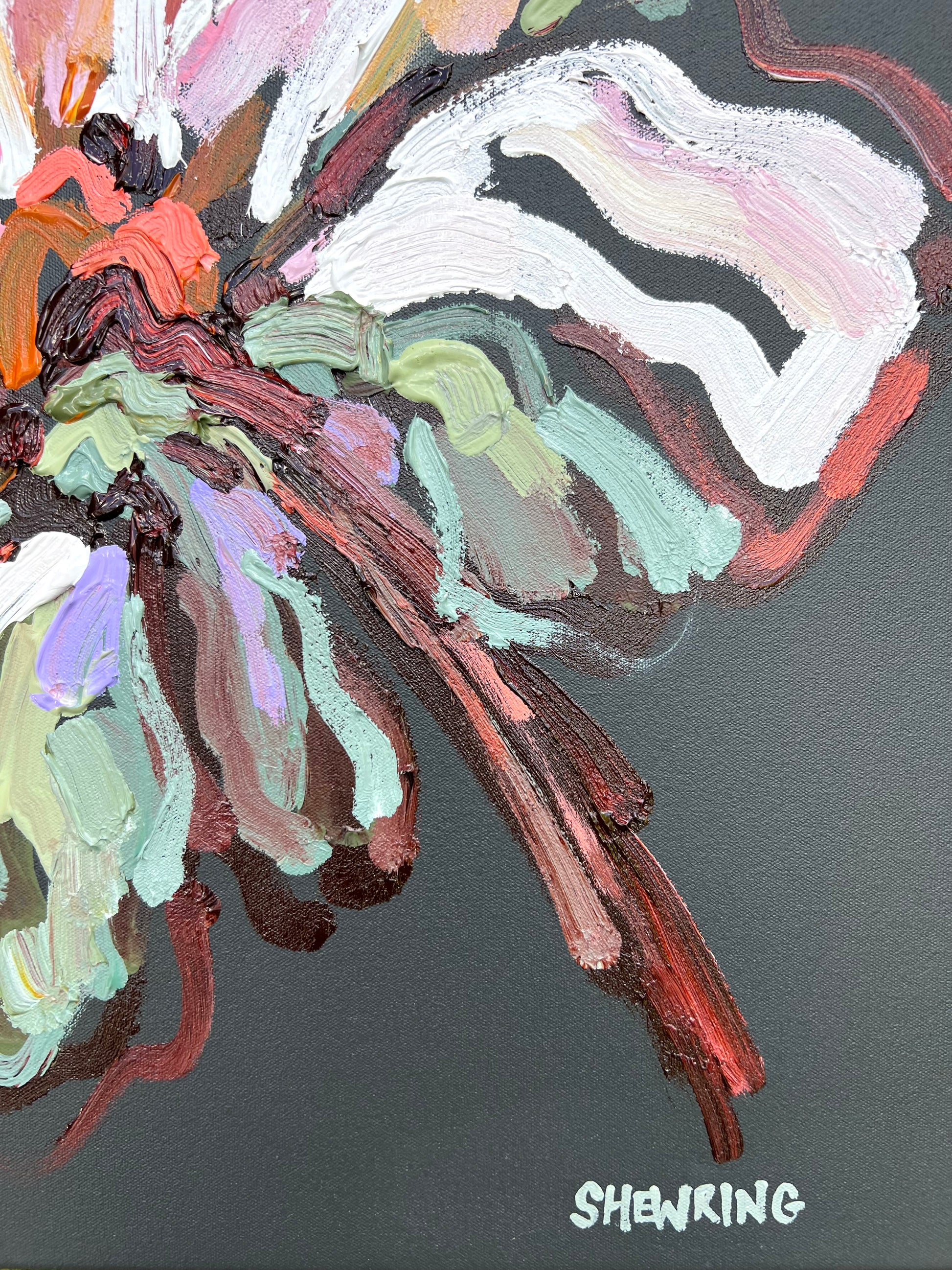 This artwork is full of life, movement and colour with a joyous flower.