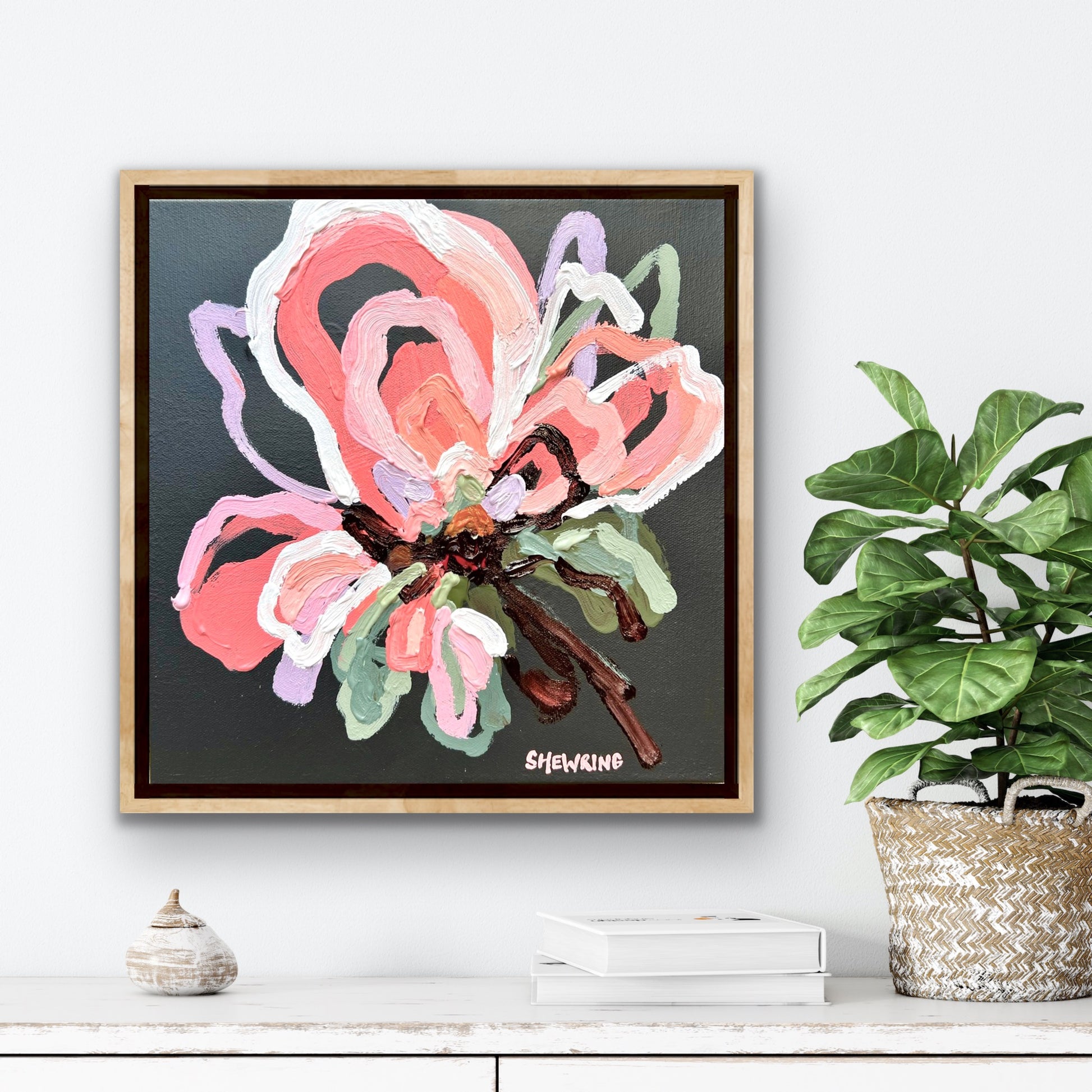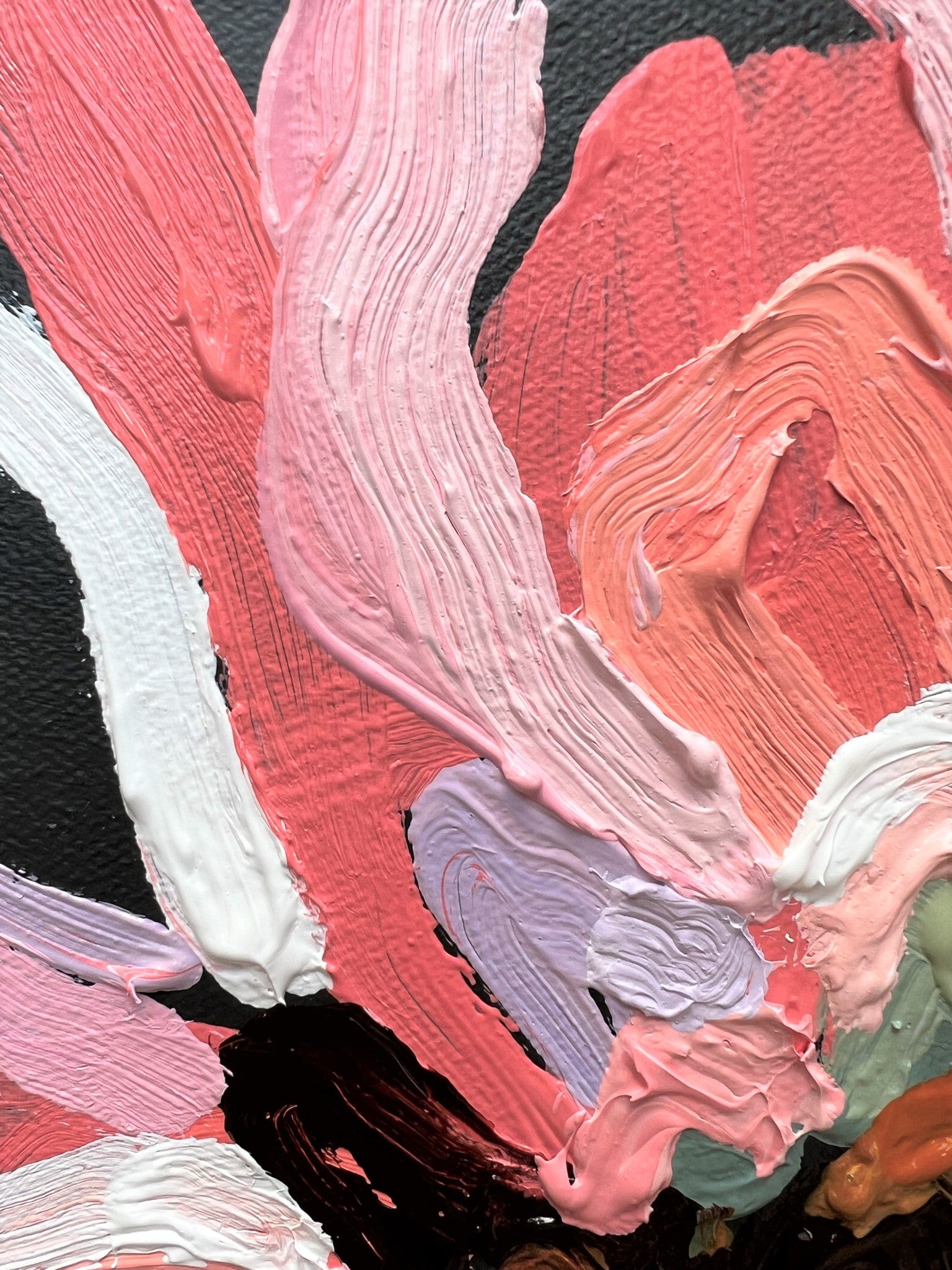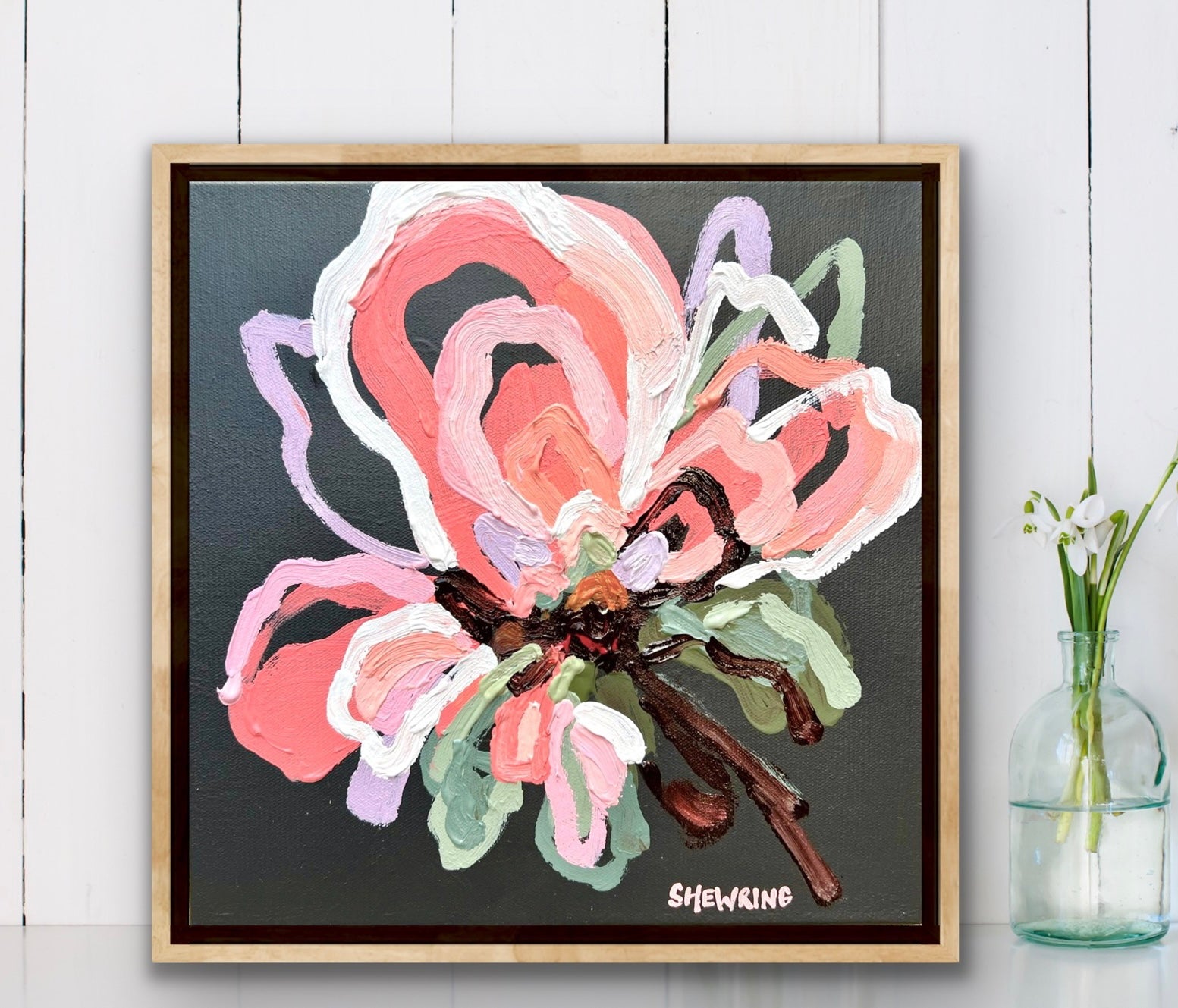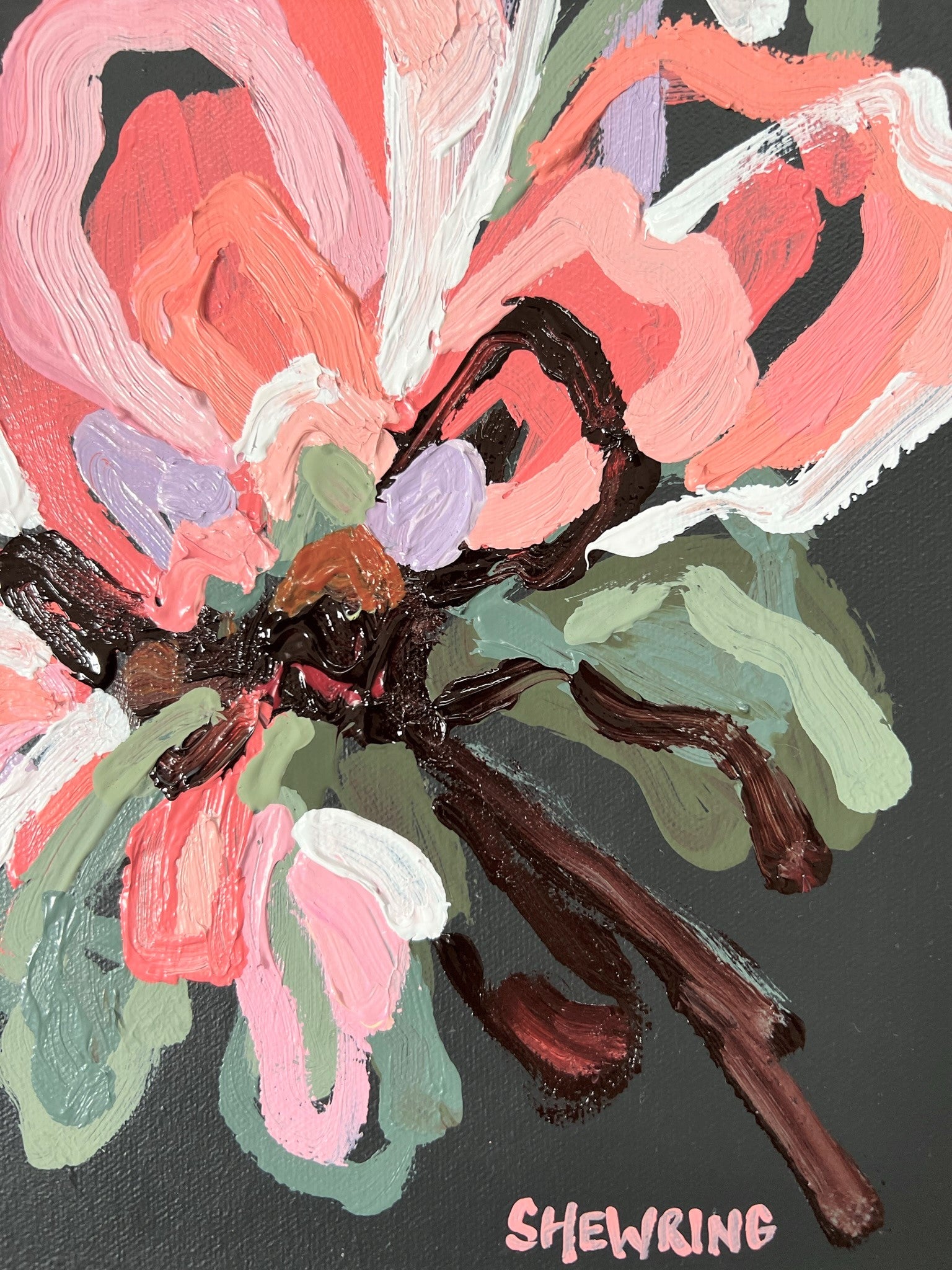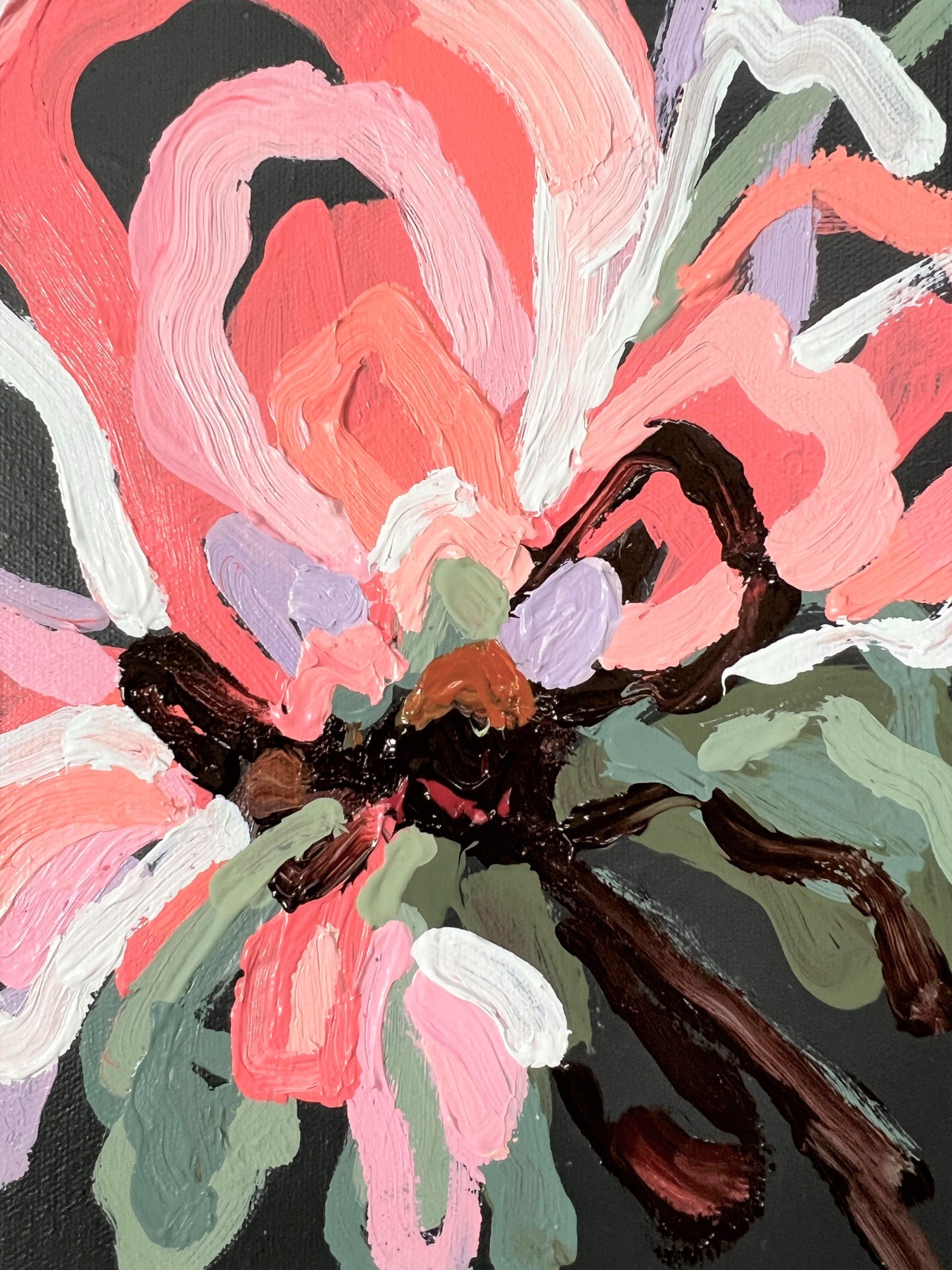 Night Garden is a beautifully textured flower abstract with gorgeous peach, apricot, watermelon and dusty pinks with a touch of lilac. Chocolate coloured impressions of leaves with bursts of sage and olive greens. This painting has expressive individual brushstrokes that bring it to life!