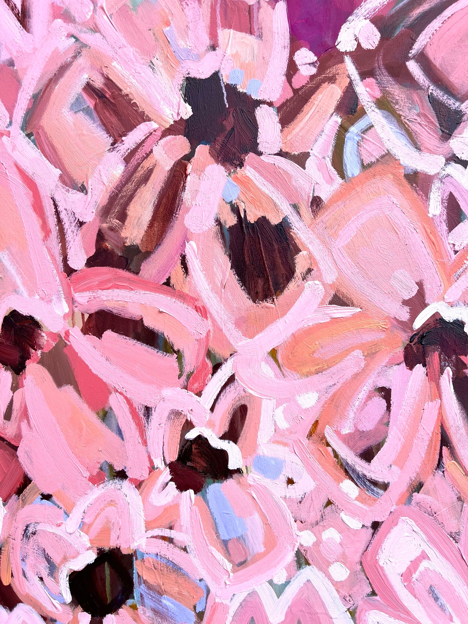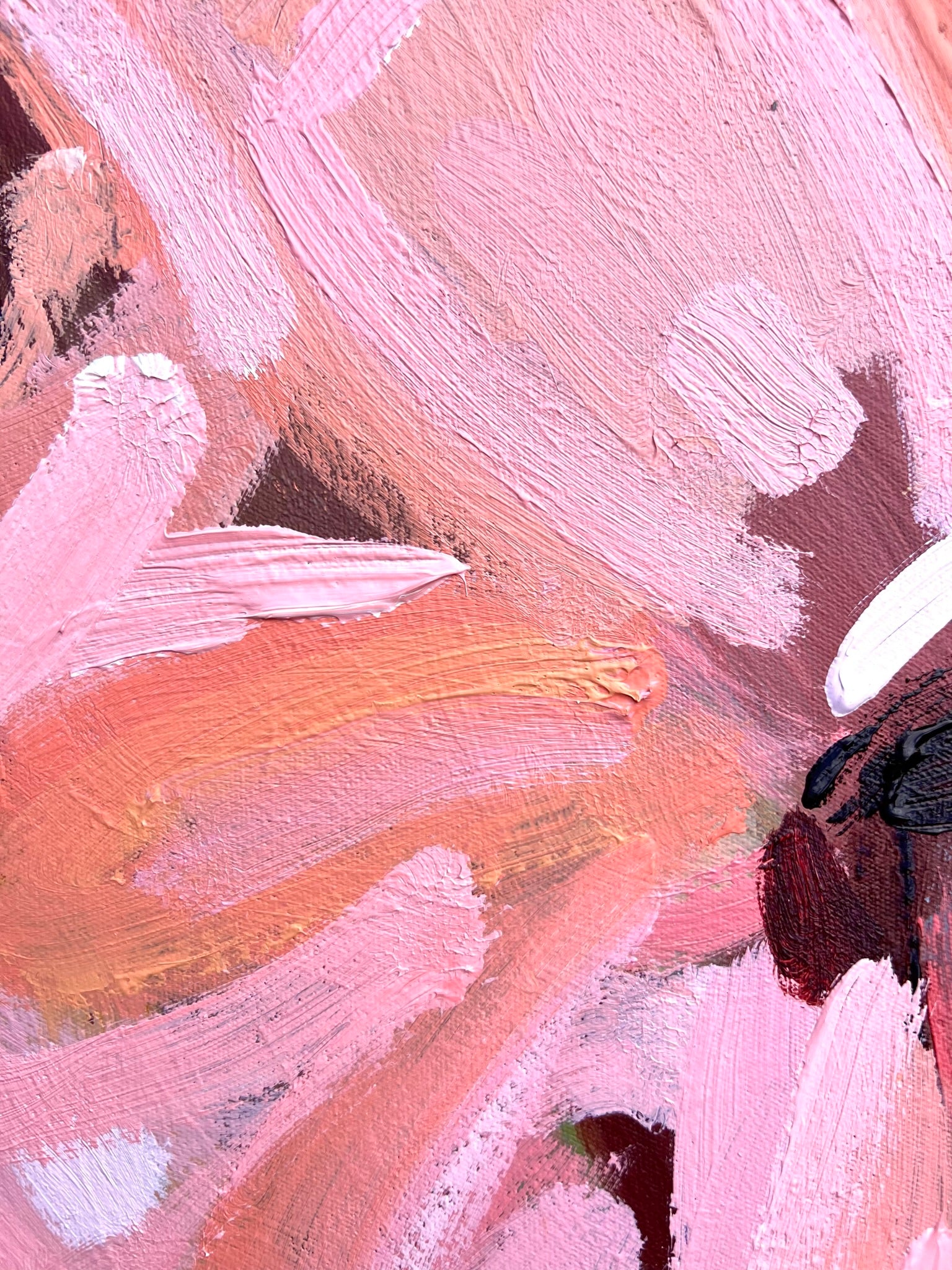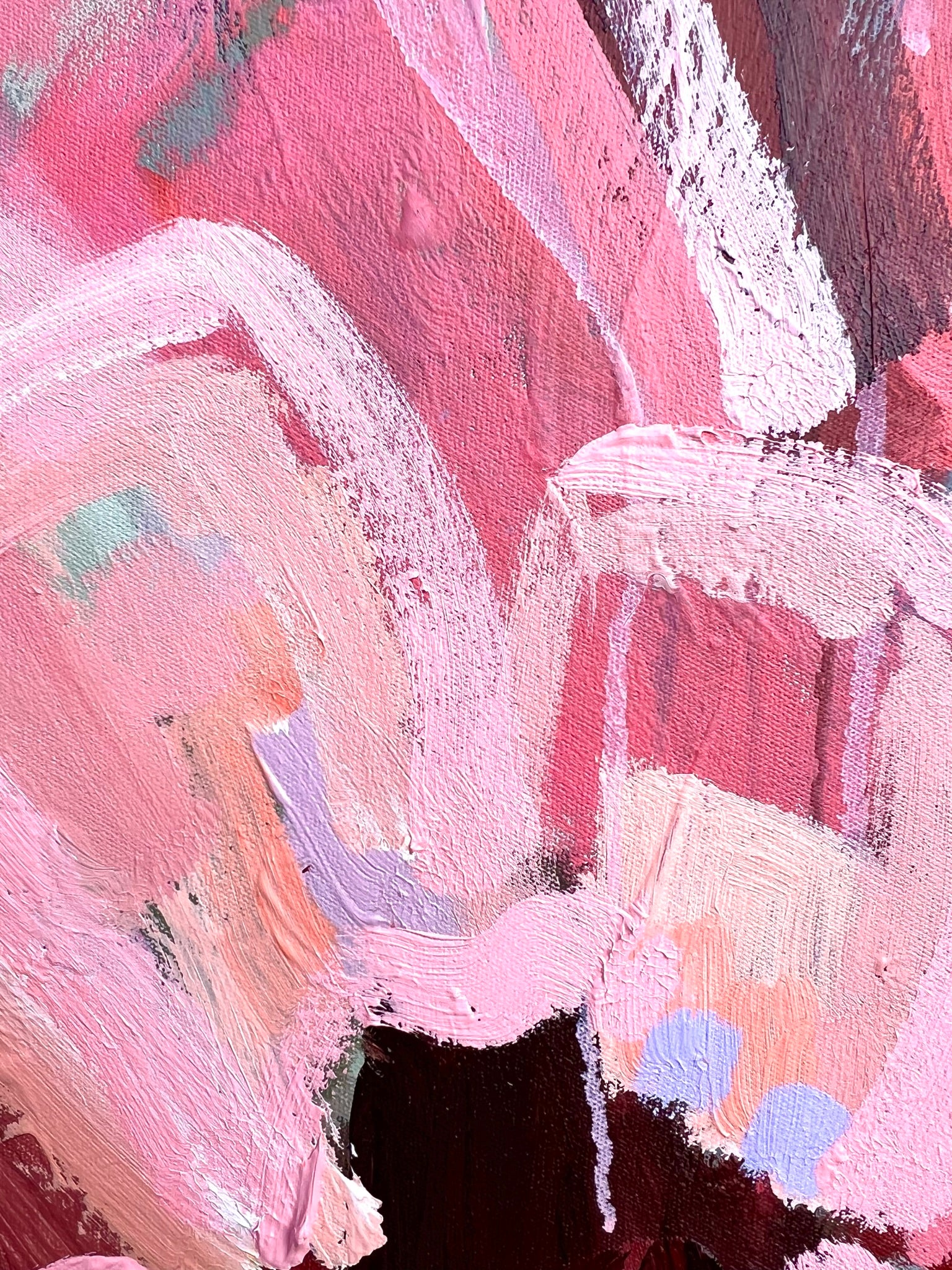 One True Love is a big powerful flower abstract with gorgeous pinks and apricots, leather coloured impressions of leaves with bursts of terracotta, raspberry, melons, mauve and earthy tones. This painting has beautiful texture and expressive individual brushstrokes that bring it to life!