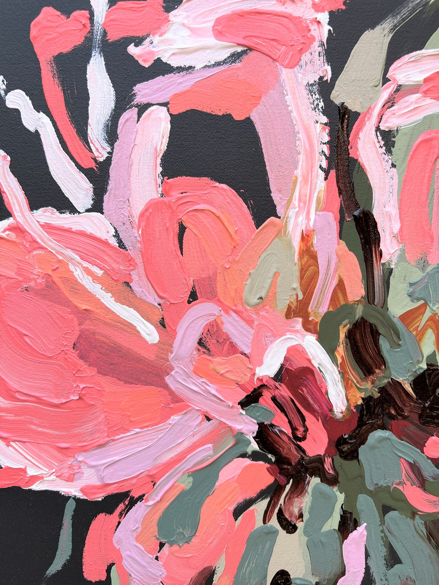 Our True Love is a beautiful flower abstract with gorgeous watermelon, lilac, peach and mauve colours with a touch of earthy tones and golden yellow. Chocolate coloured impressions of leaves and foliage with bursts of sage and olive greens.