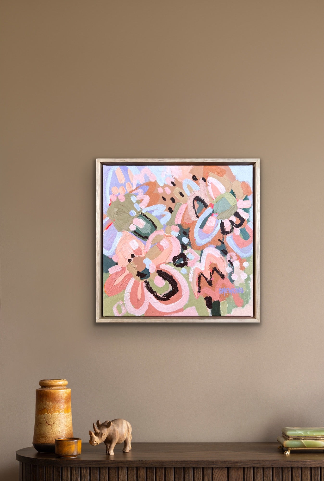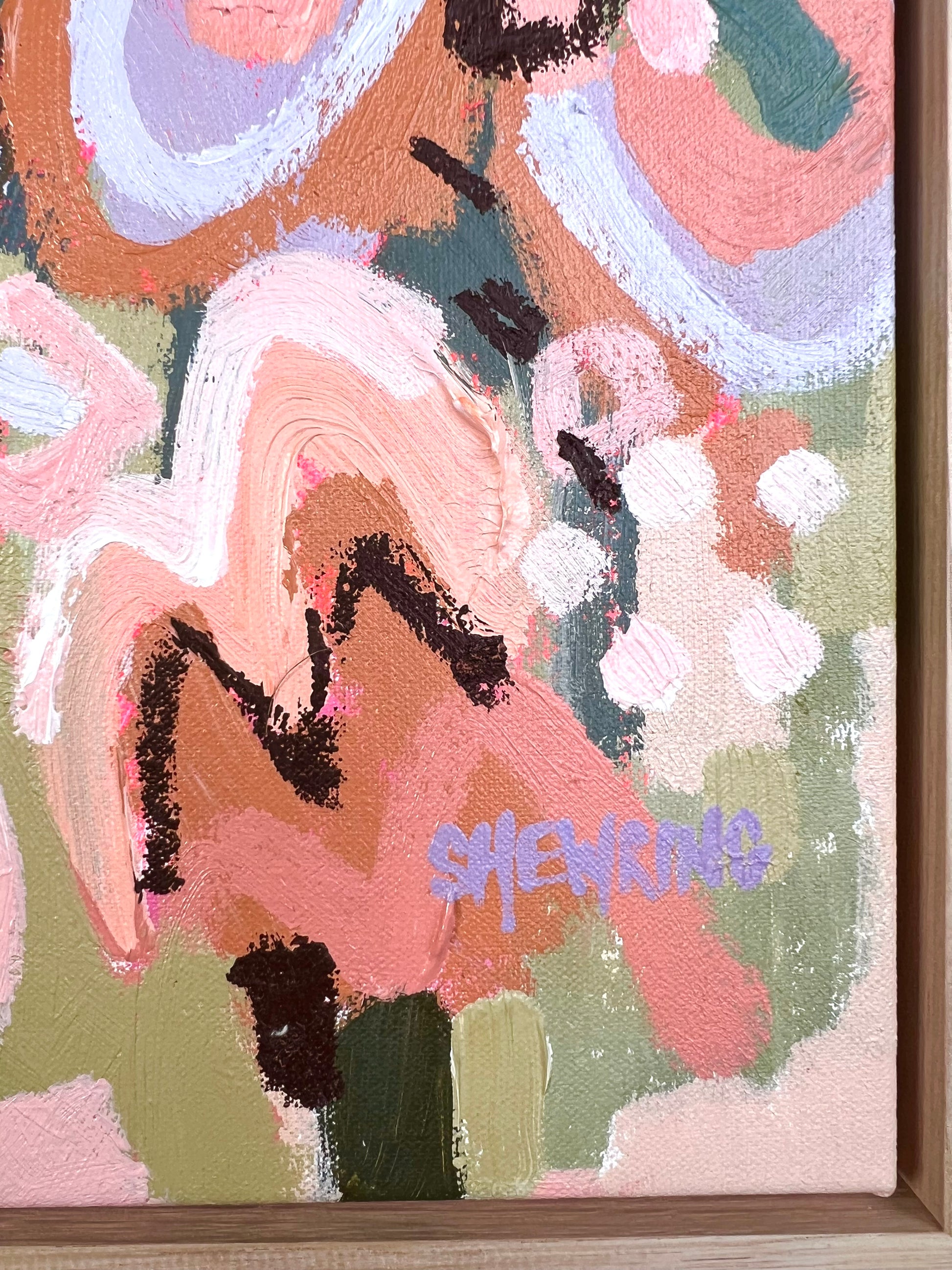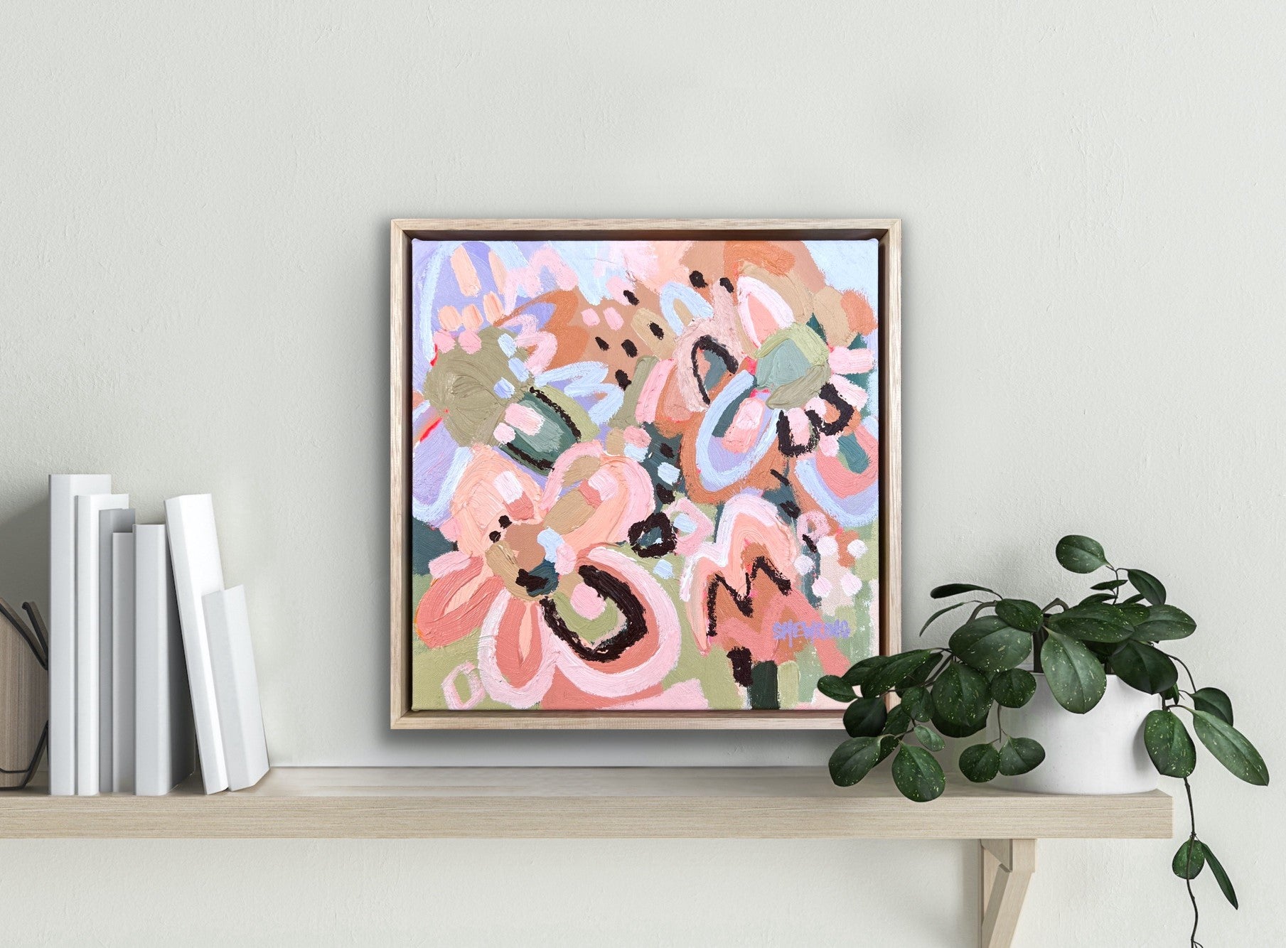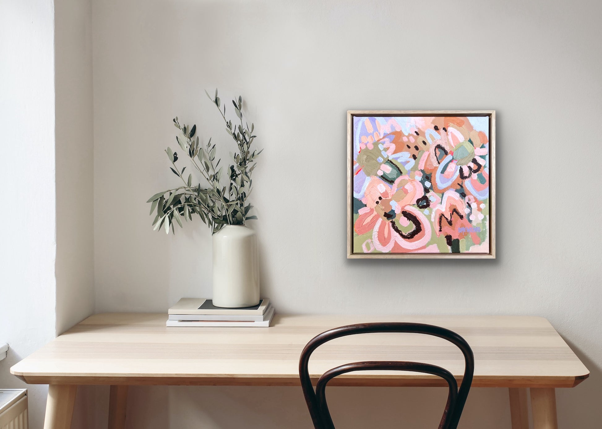 Framed in oak natural timber float frame 35 x 35 cm (canvas 32 x 32 cm). Sold