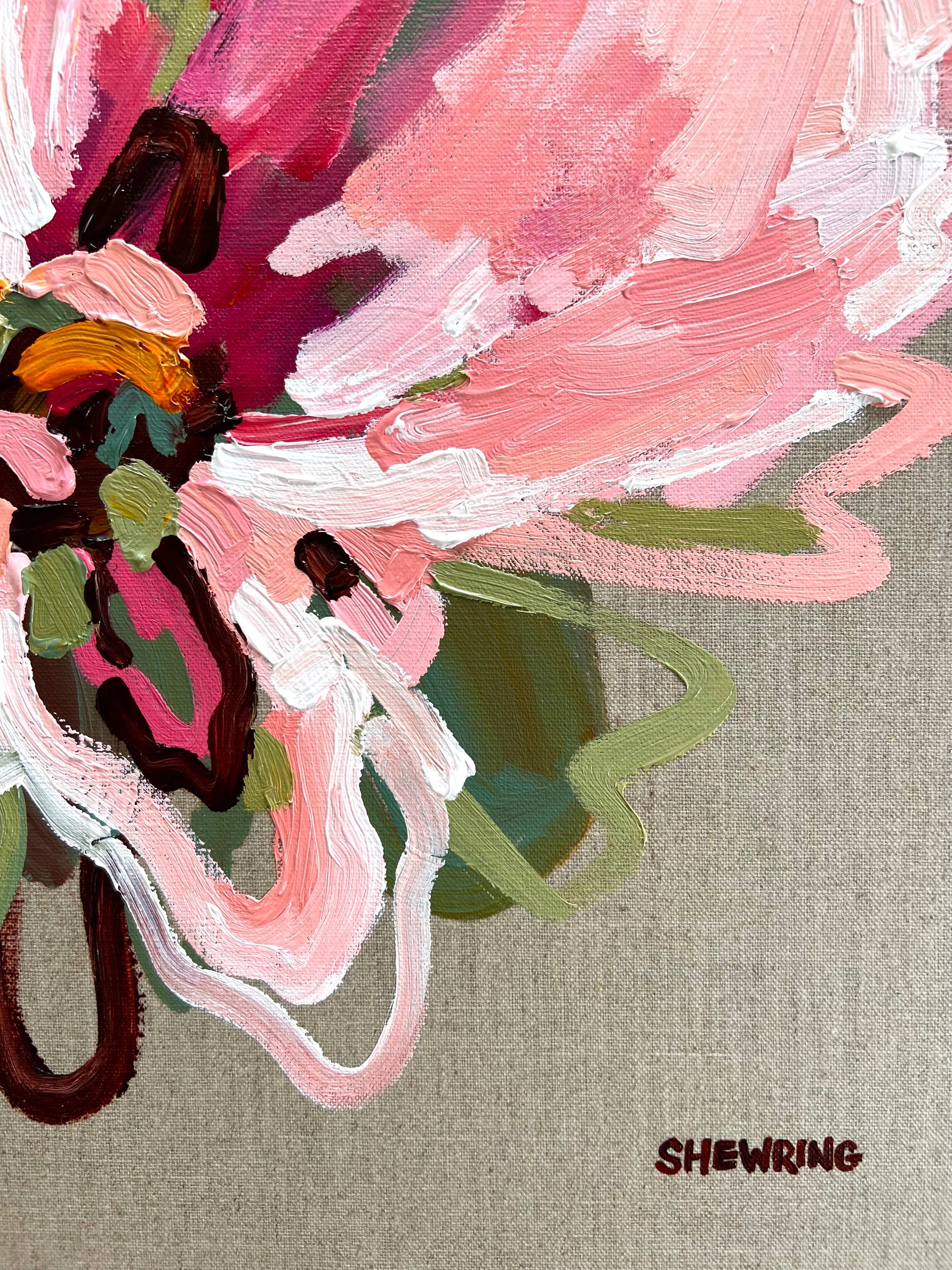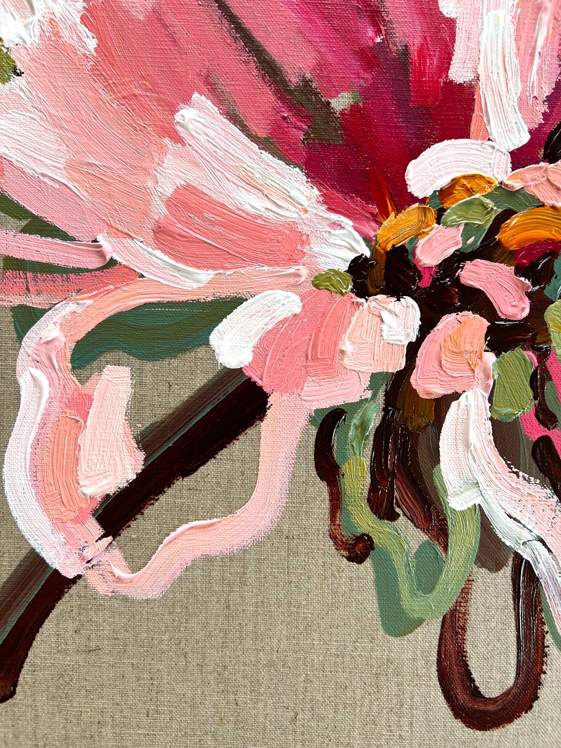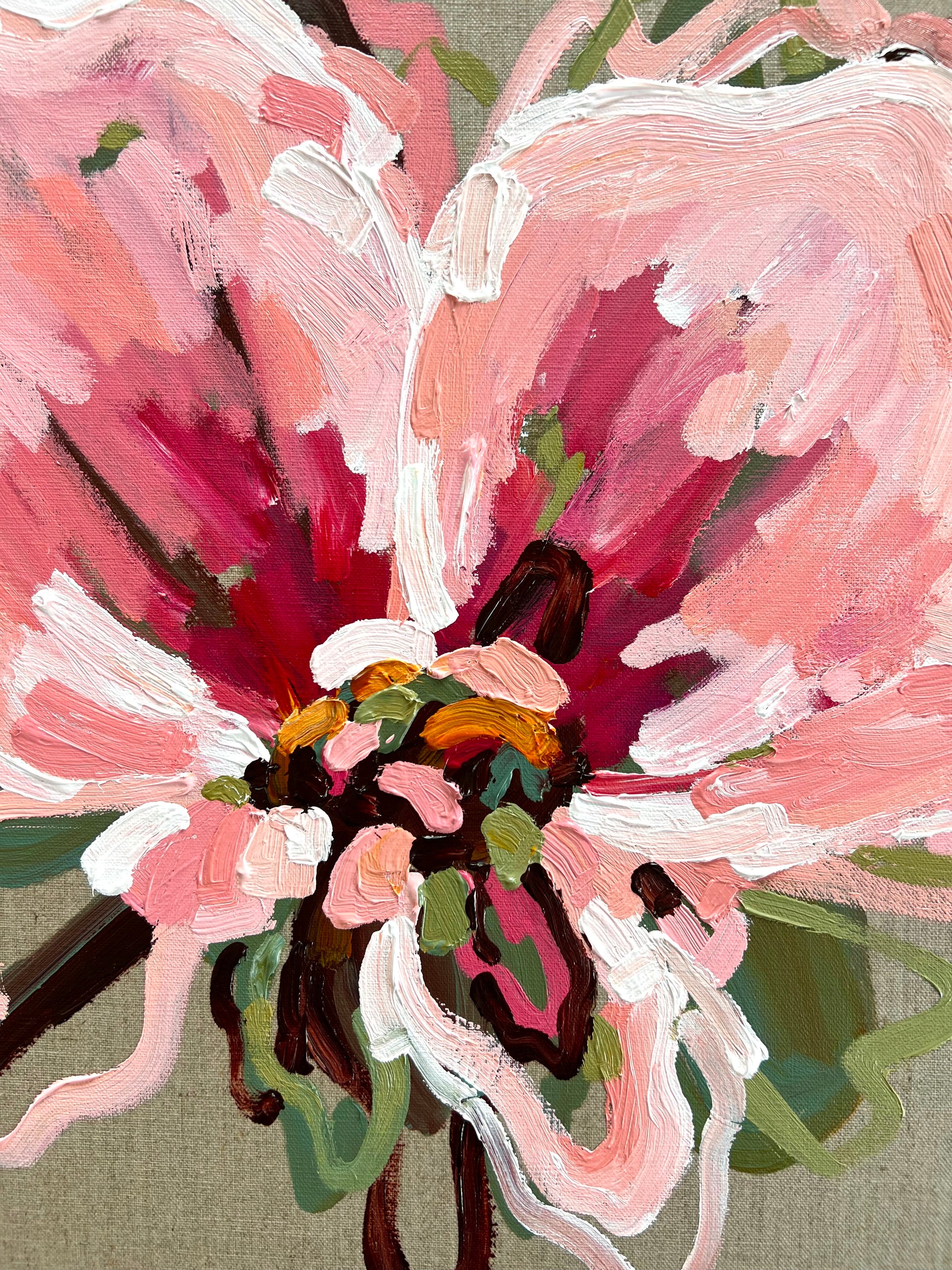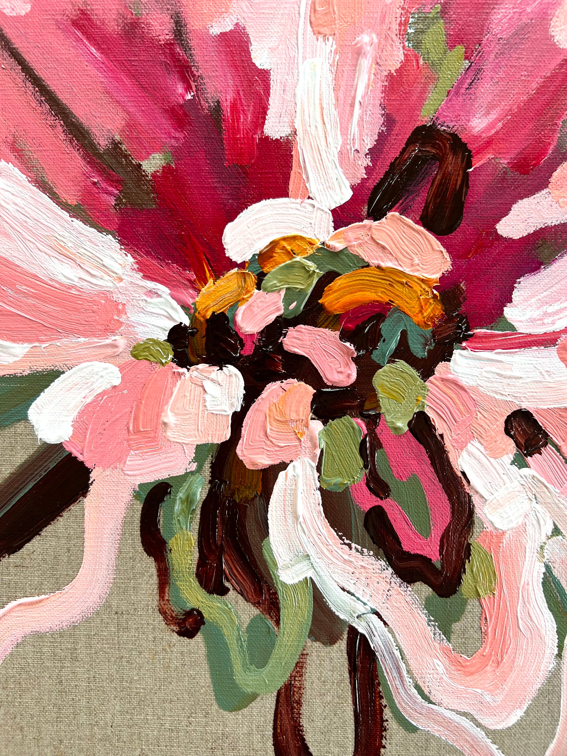 Pink On Linen is a beautifully textured flower abstract on linen canvas. This painting has expressive individual brushstrokes that bring it to life!