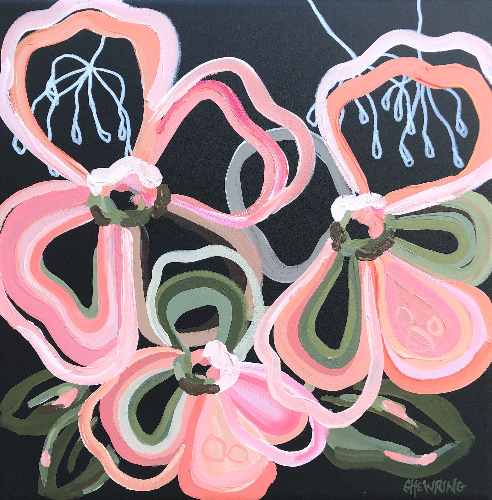 These flowers are painted in an expressive style in soft pinks and apricots and warm olive and earth colours that would suit a range of different decors.