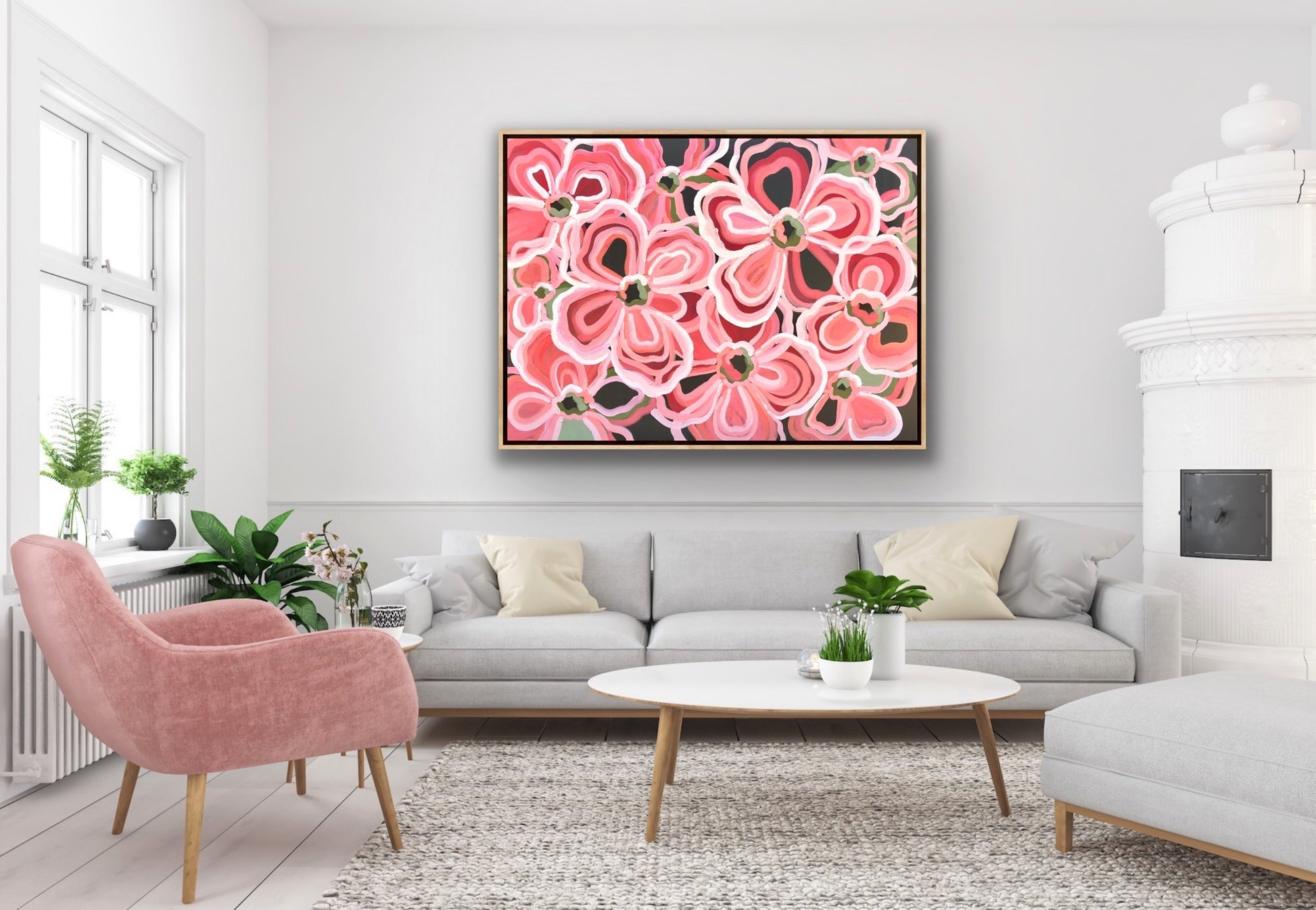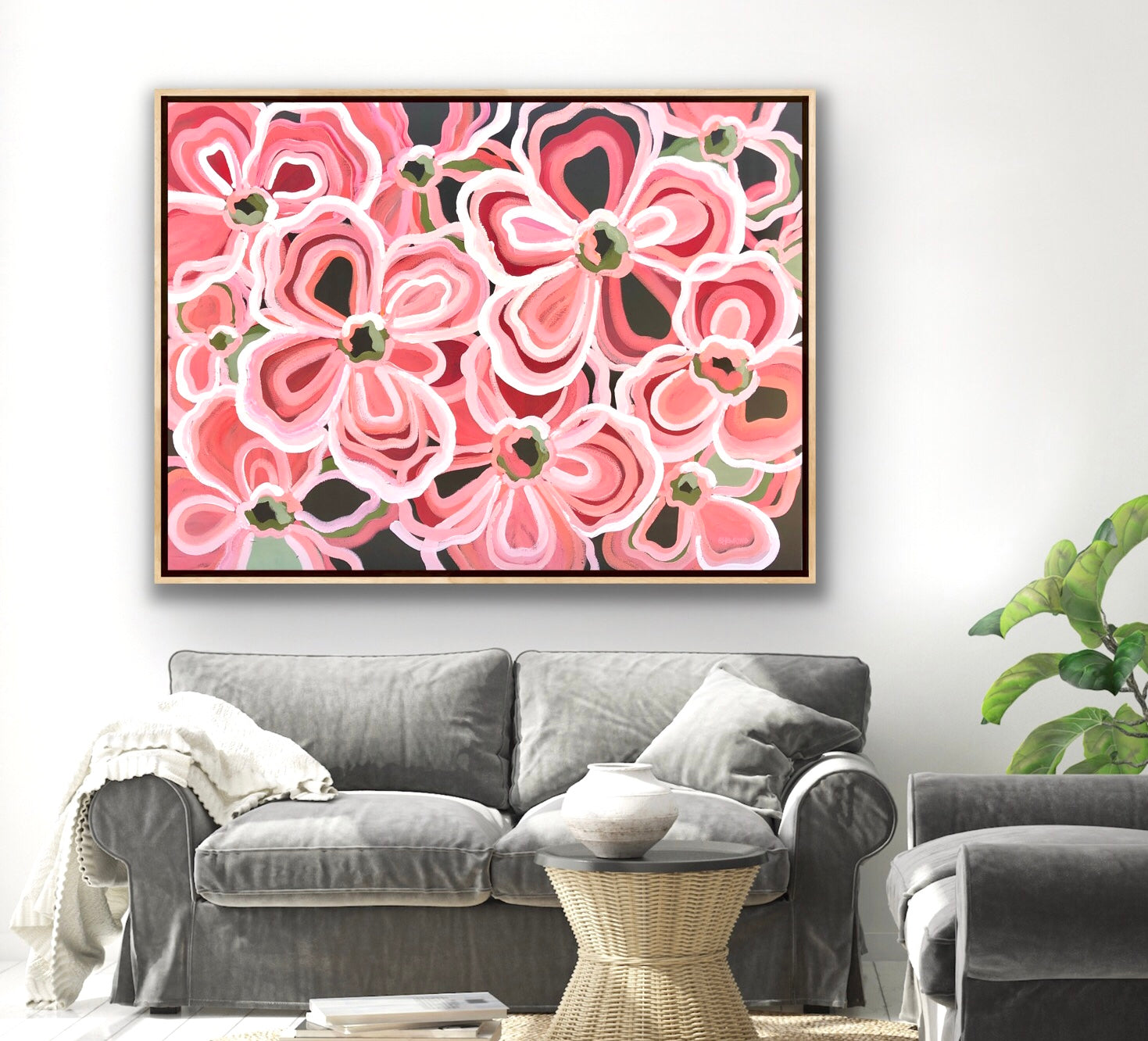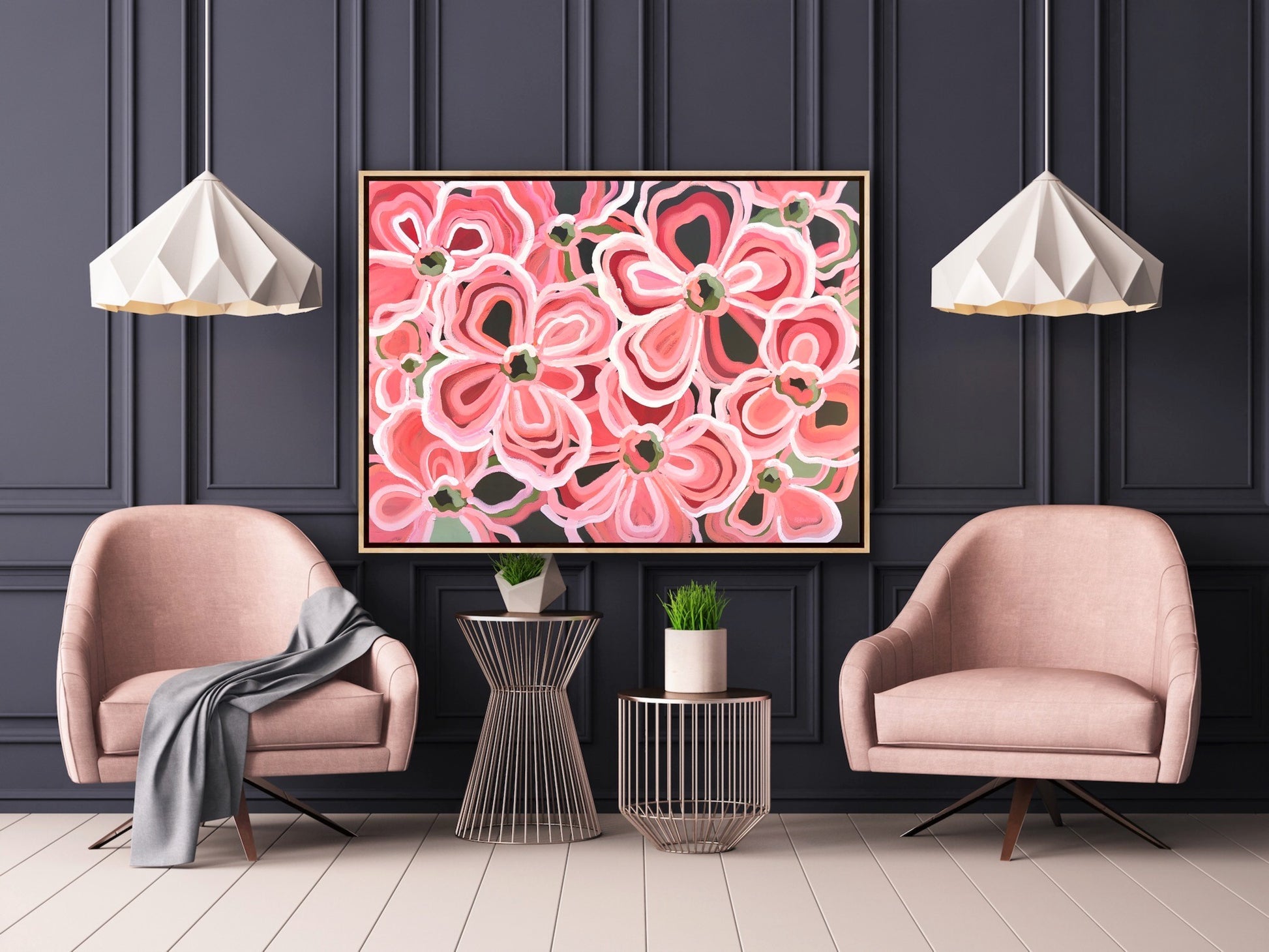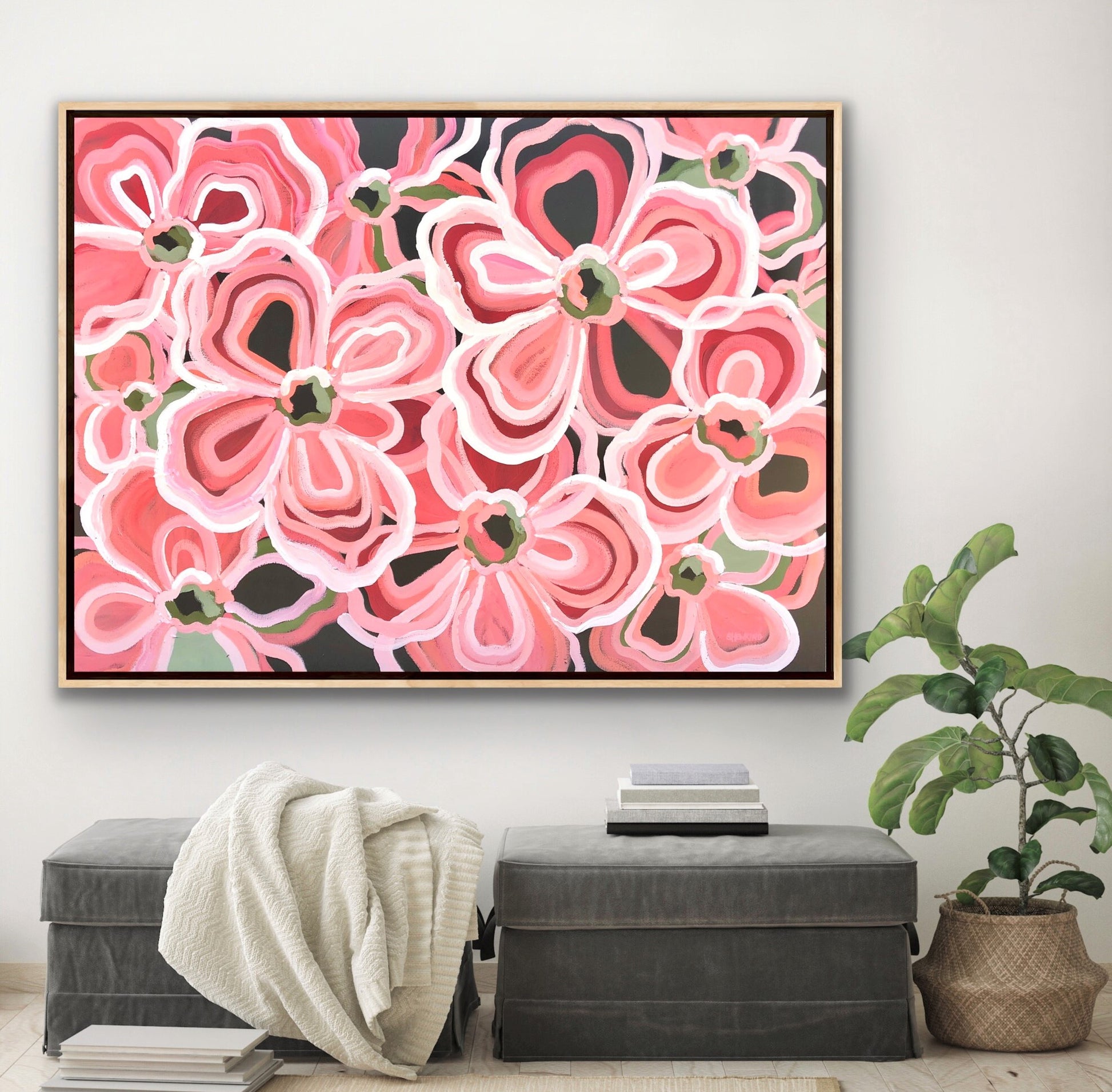 These flowers are painted in an expressive style in vibrant pinks, delicious apricots, peaches, melons, gorgeous greens with a complimentary warm charcoal background that would suit a range of different decors.