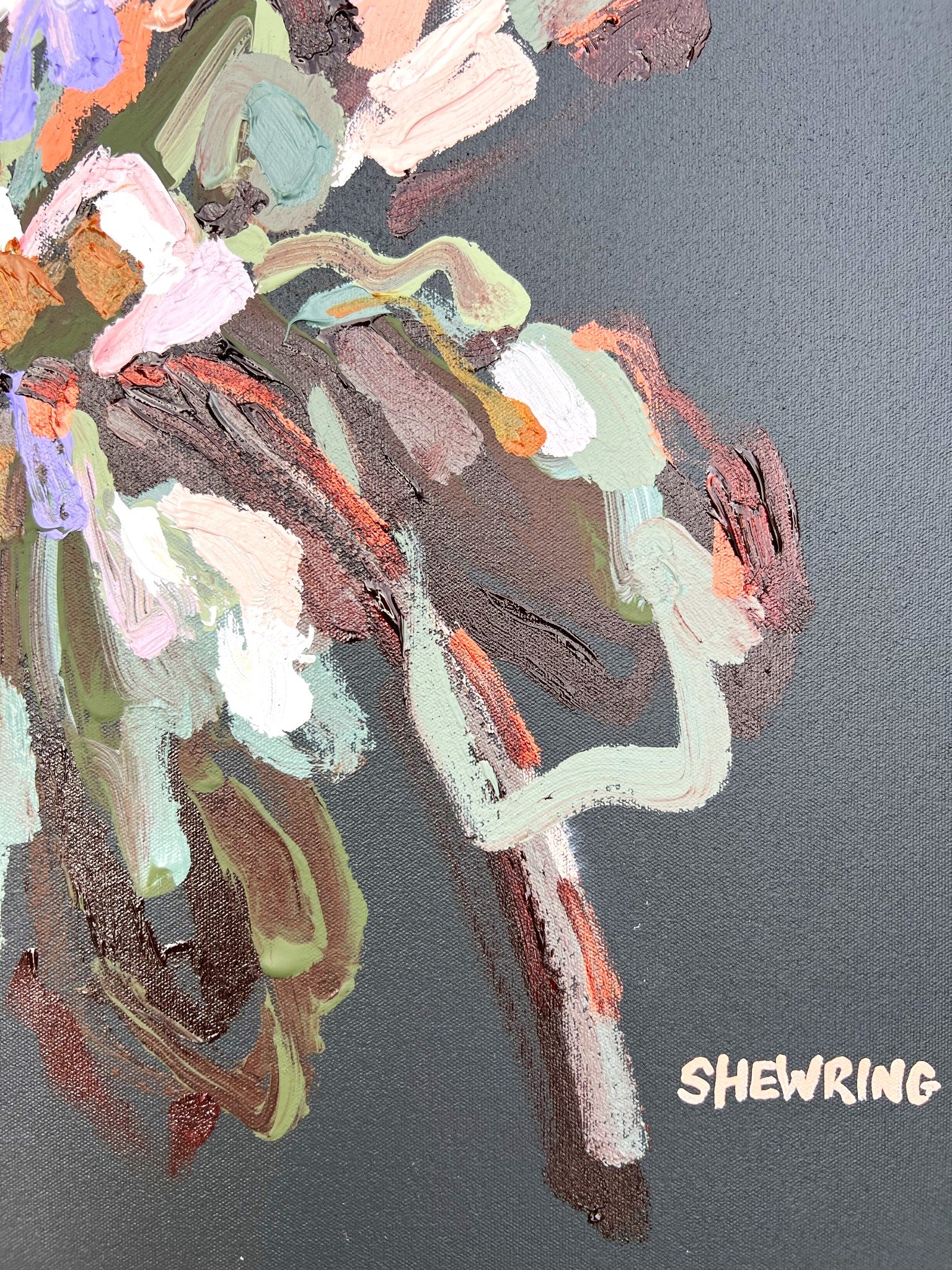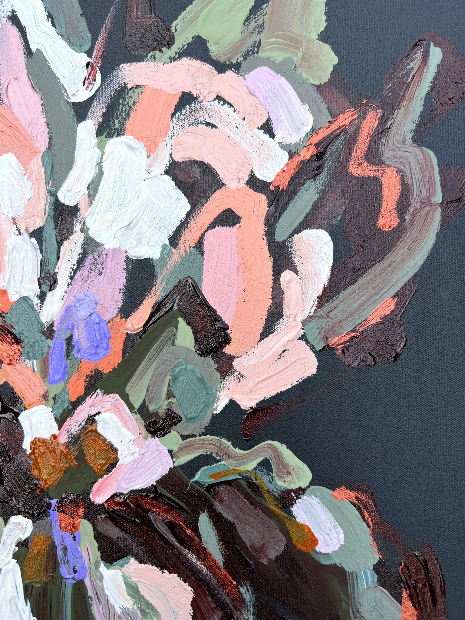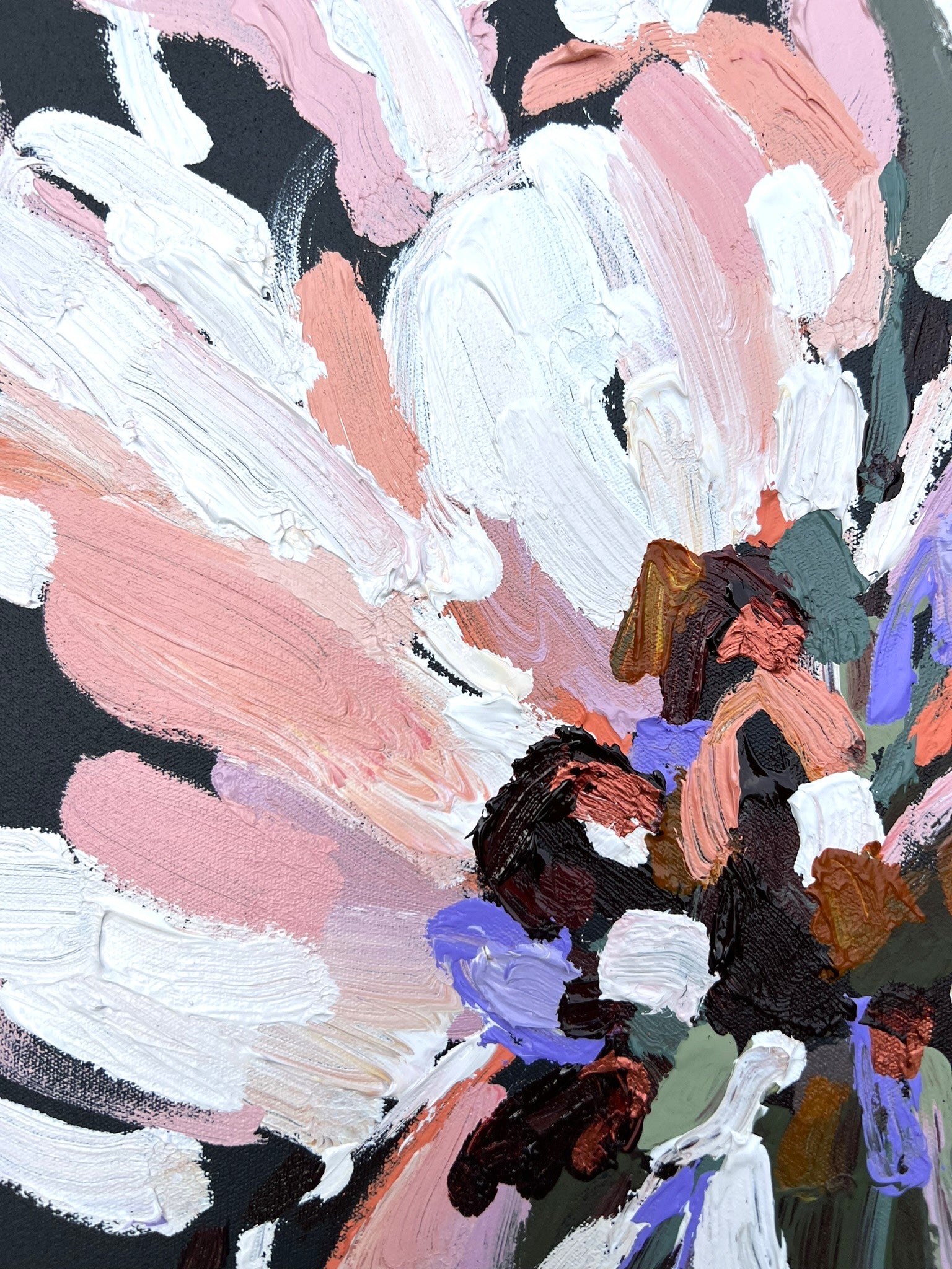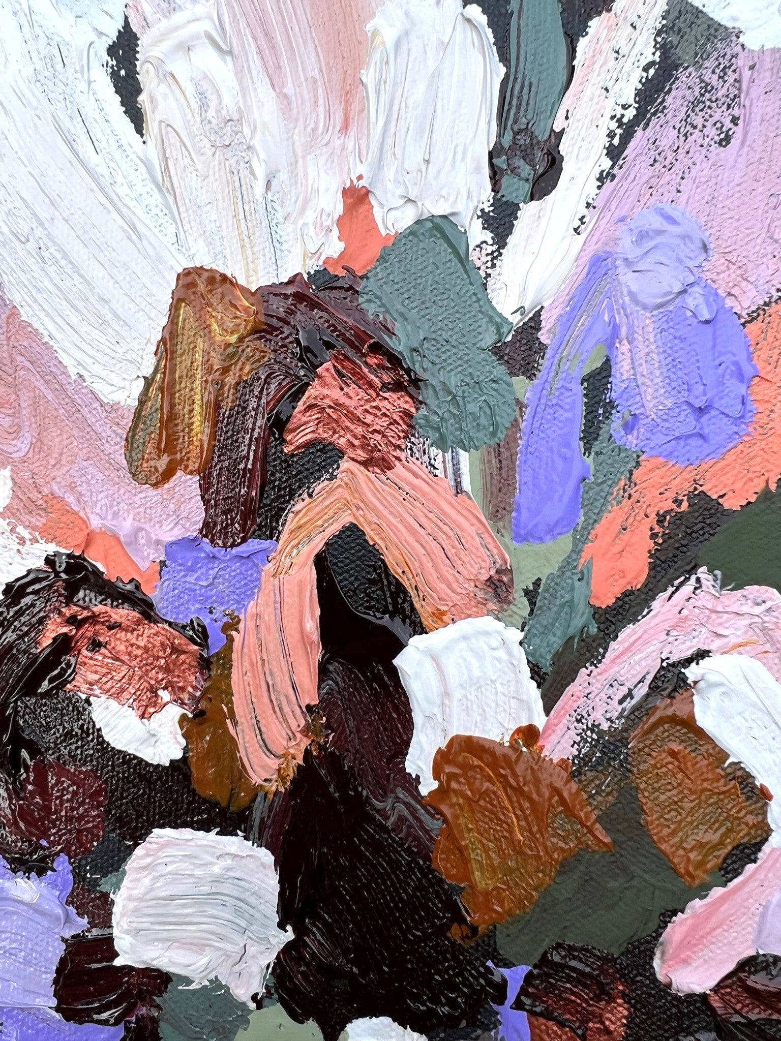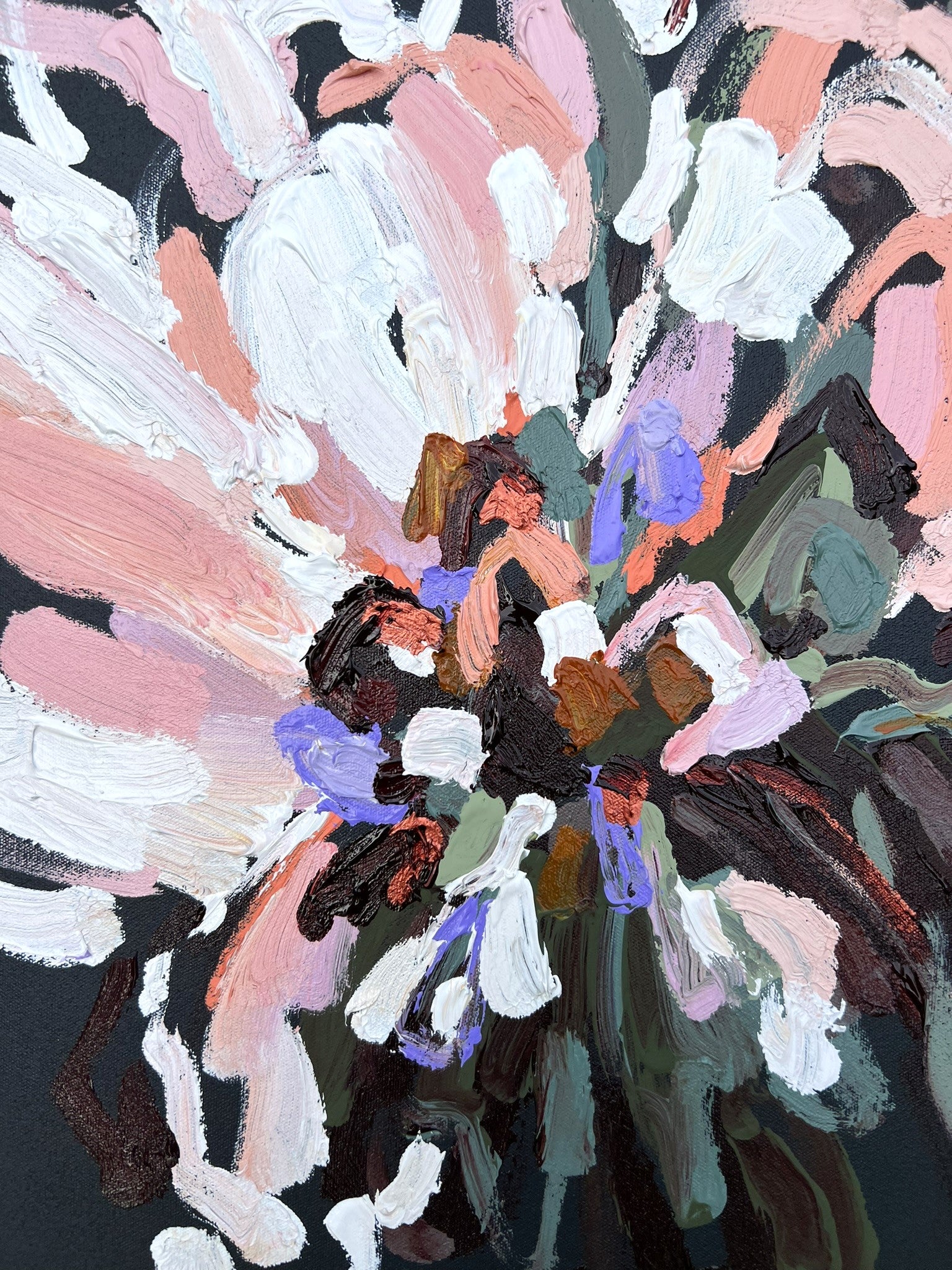 Pure Promise is a beautifully textured flower abstract with gorgeous dusty pinks, peach, lilac and white petals with chocolate coloured impressions of leaves and bursts of bronze, sage and olive greens. This painting has expressive individual brushstrokes that bring it to life!