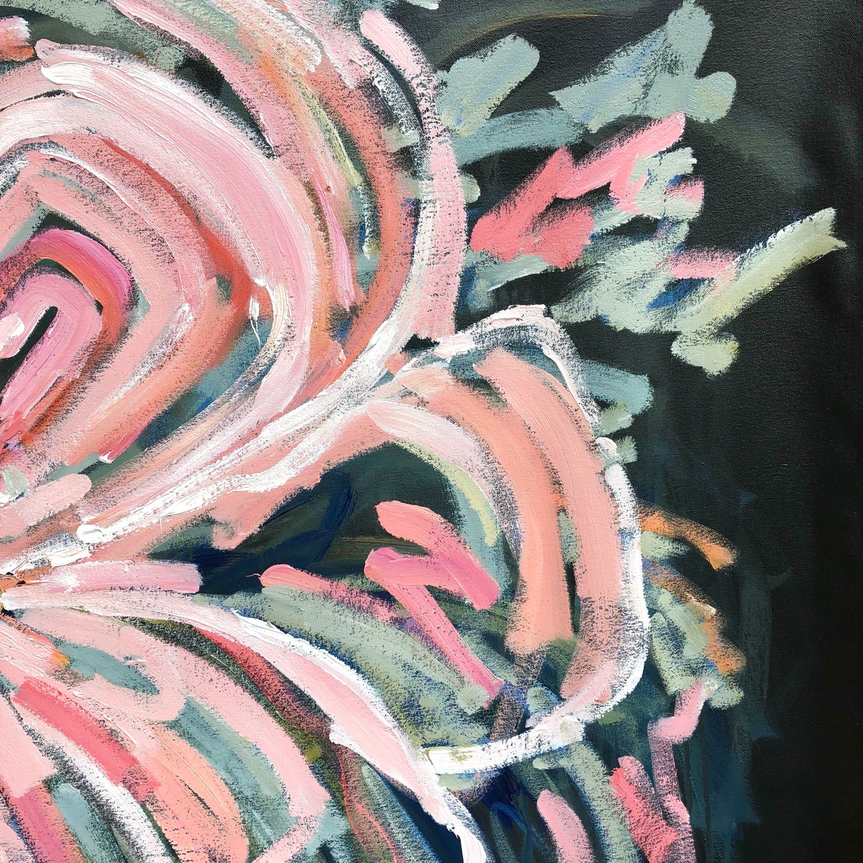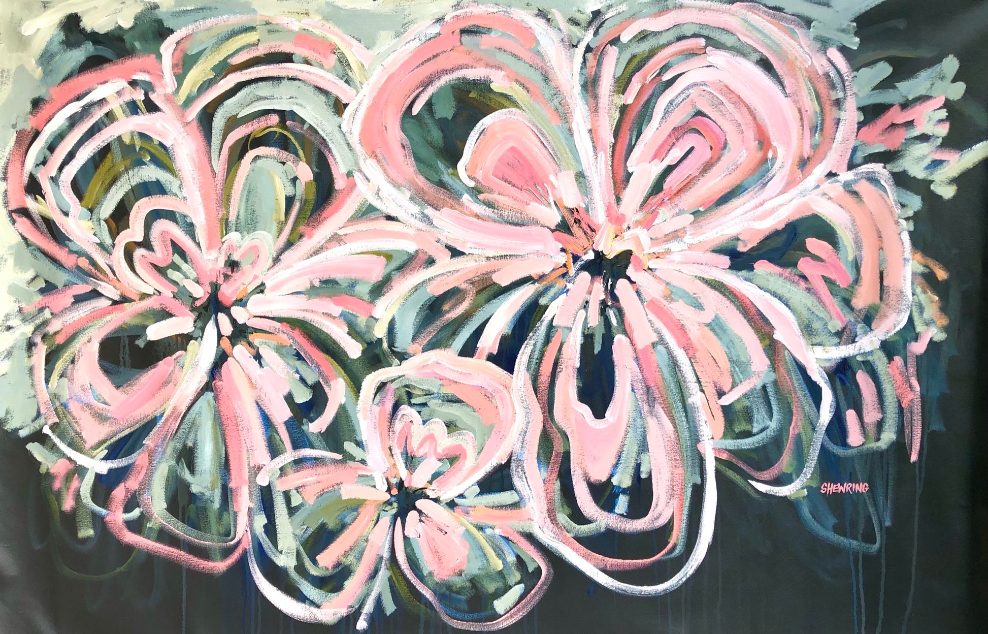 Pure Romance was inspired by the warm tones of the Australian landscape and the beauty that can be found in the soft colours of its flowers and foliage. In this painting I abstract the organic shapes and place their abstracted blooms over a dramatic deep warm charcoal background.