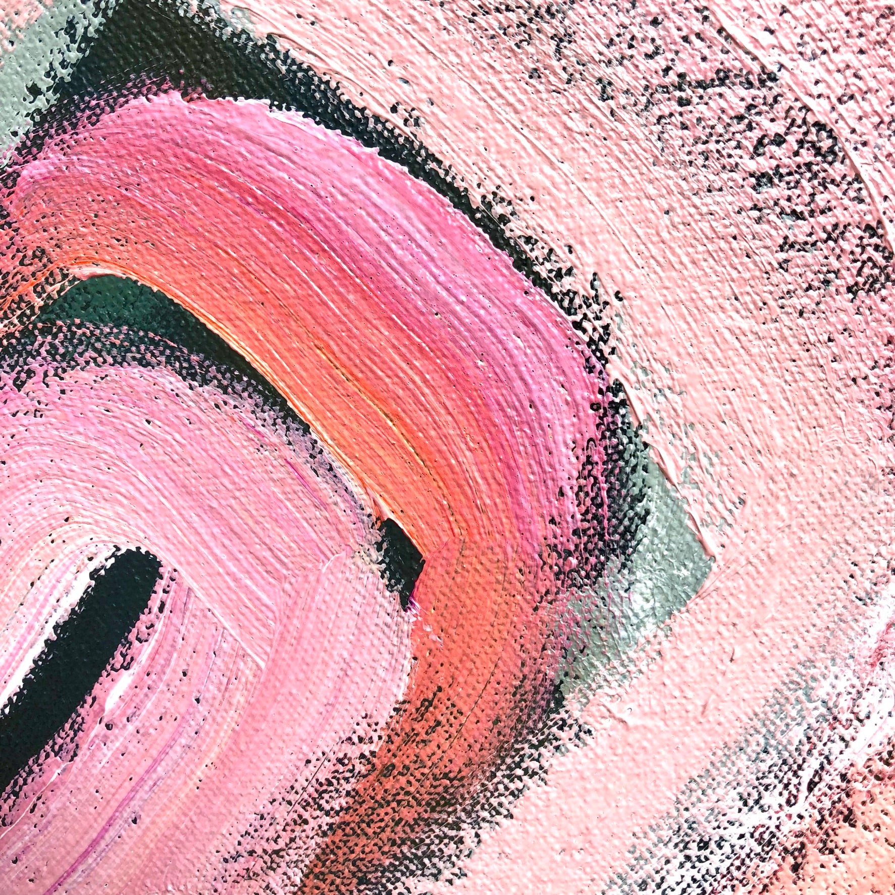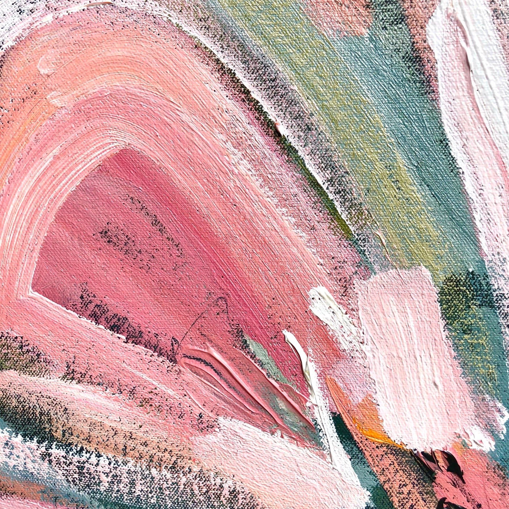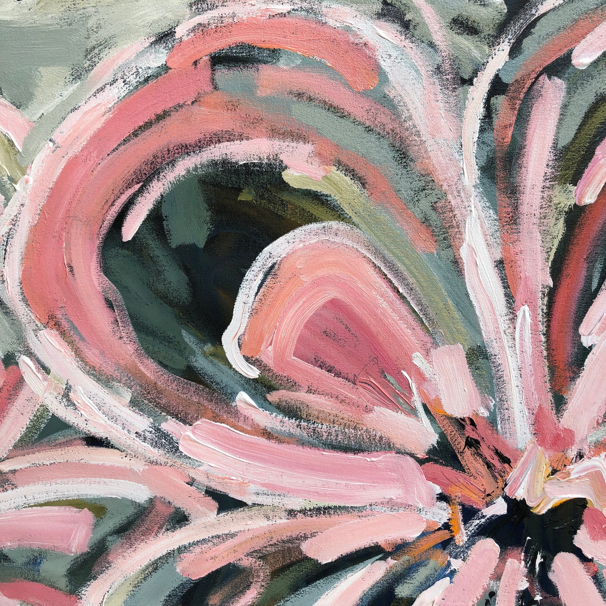 These abstract flowers are painted in an expressive style in warm pinks, sage greens with hints of ultramarine blue that would suit a range of different decors.