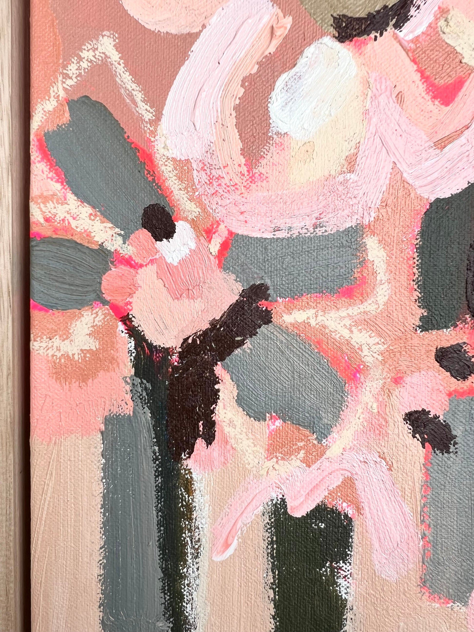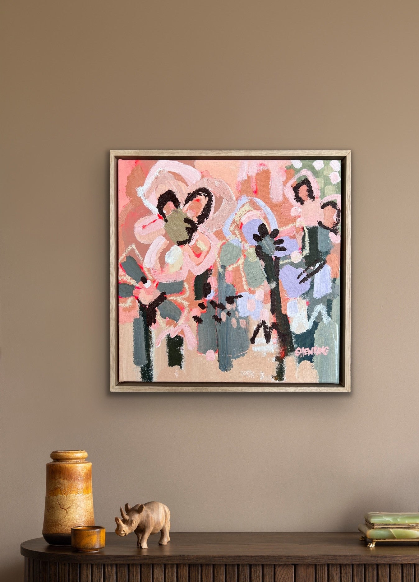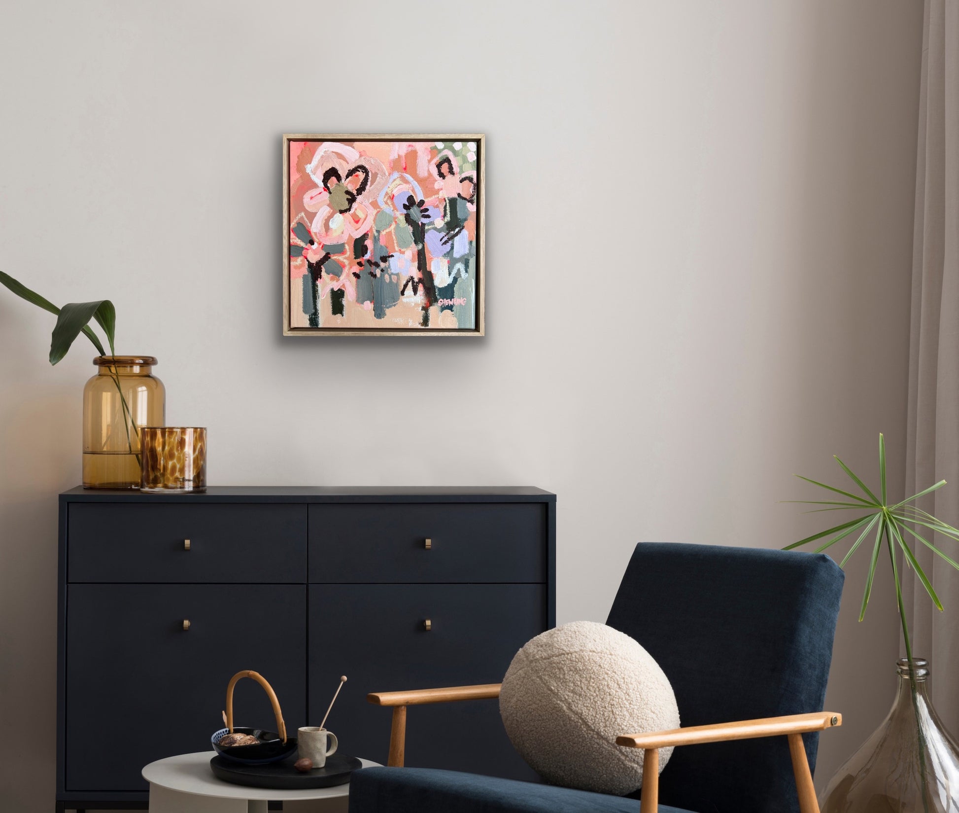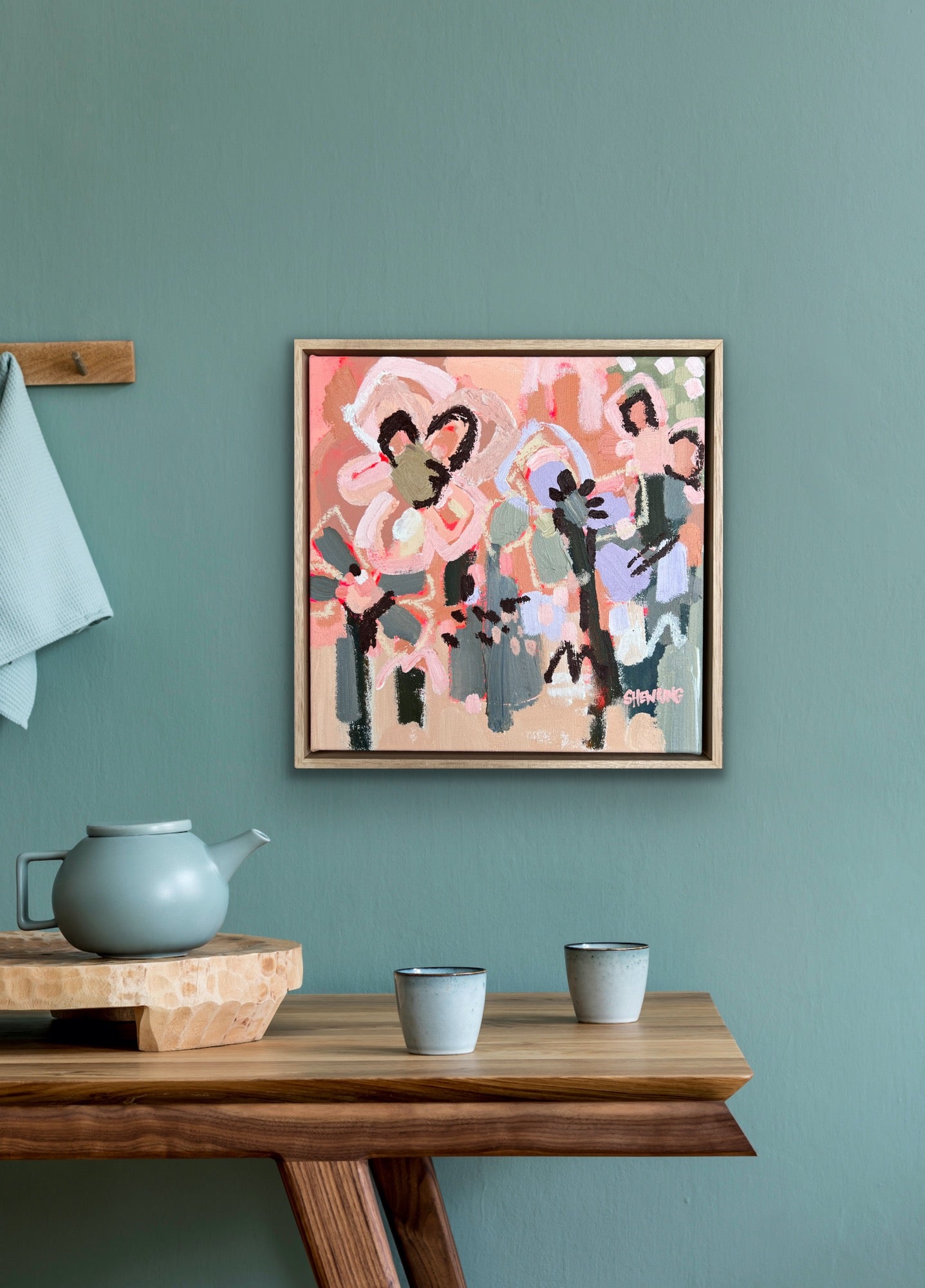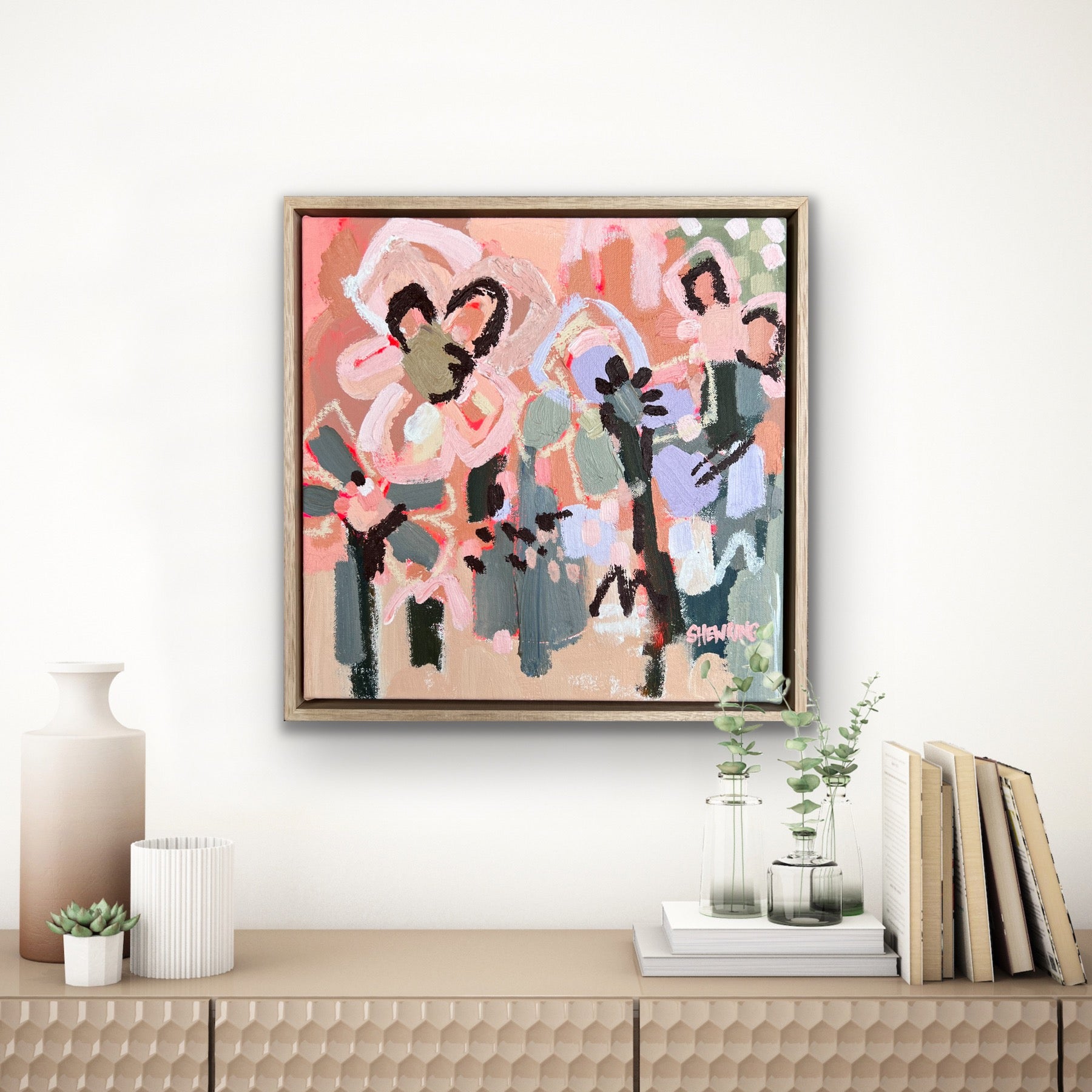 Framed in oak natural timber float frame 35 x 35 cm (canvas 32 x 32 cm). Sold