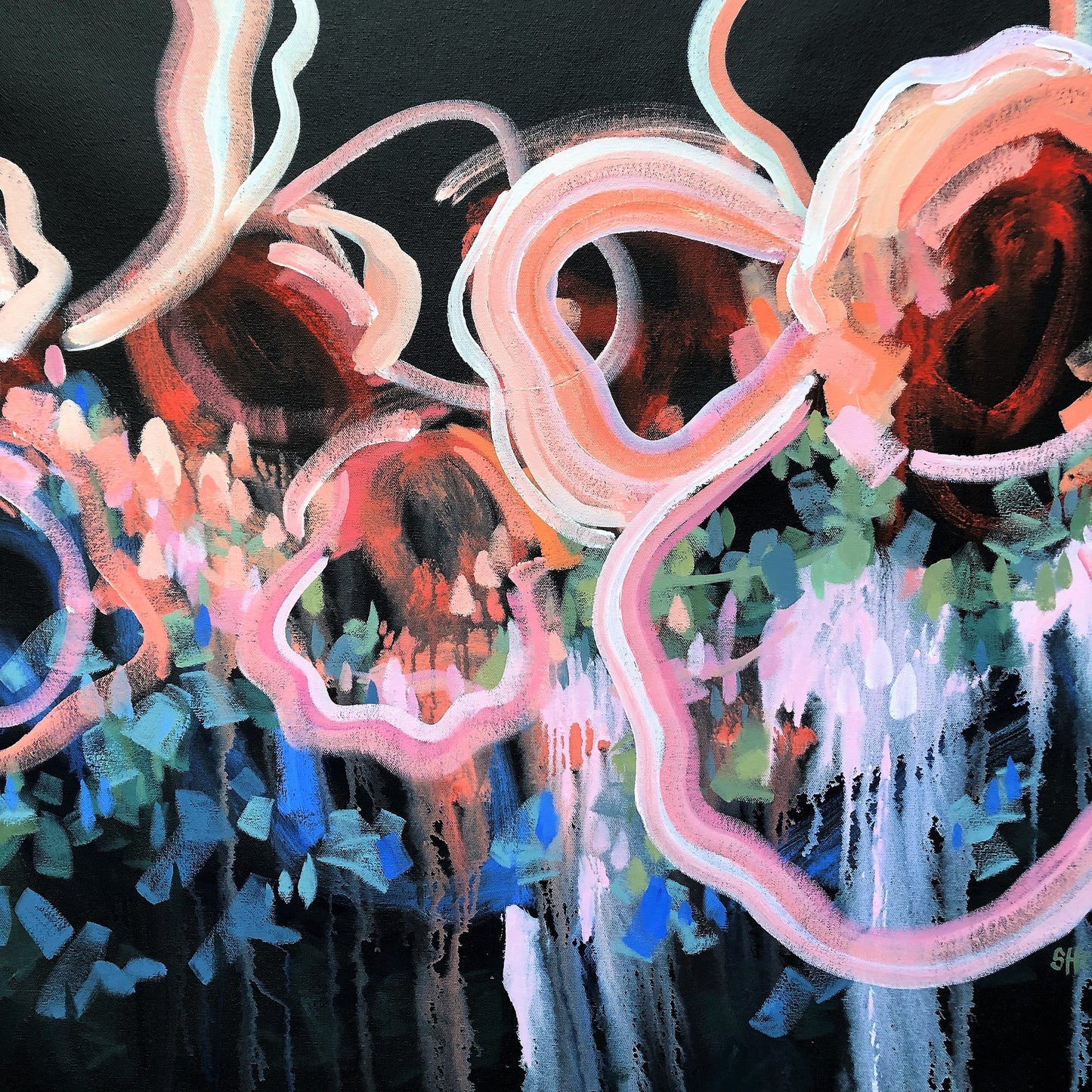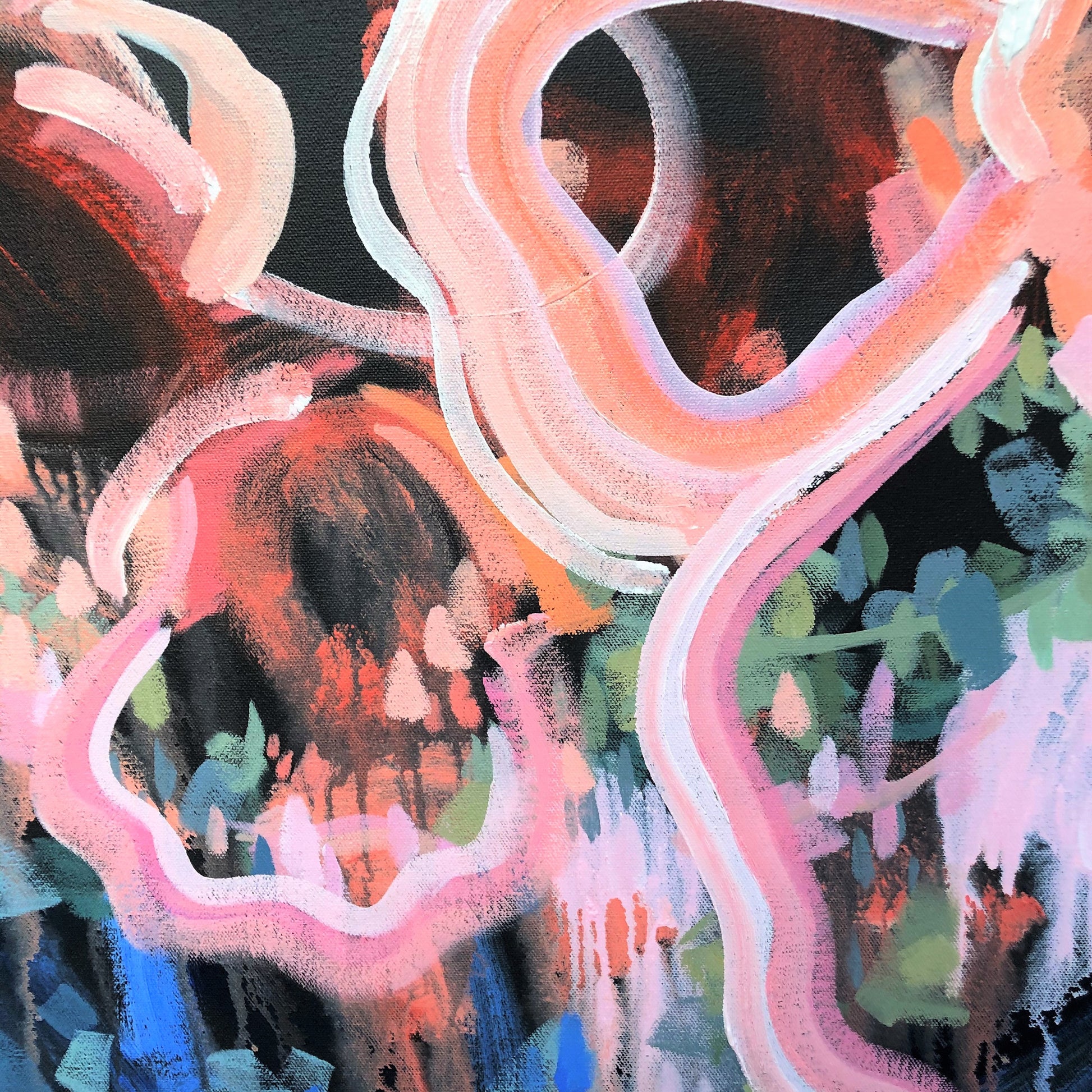 Satellite Of Love is a bright and bold abstract with re-imagined shapes and colours from nature. This big painting has expressive individual brushstrokes that bring it to life!