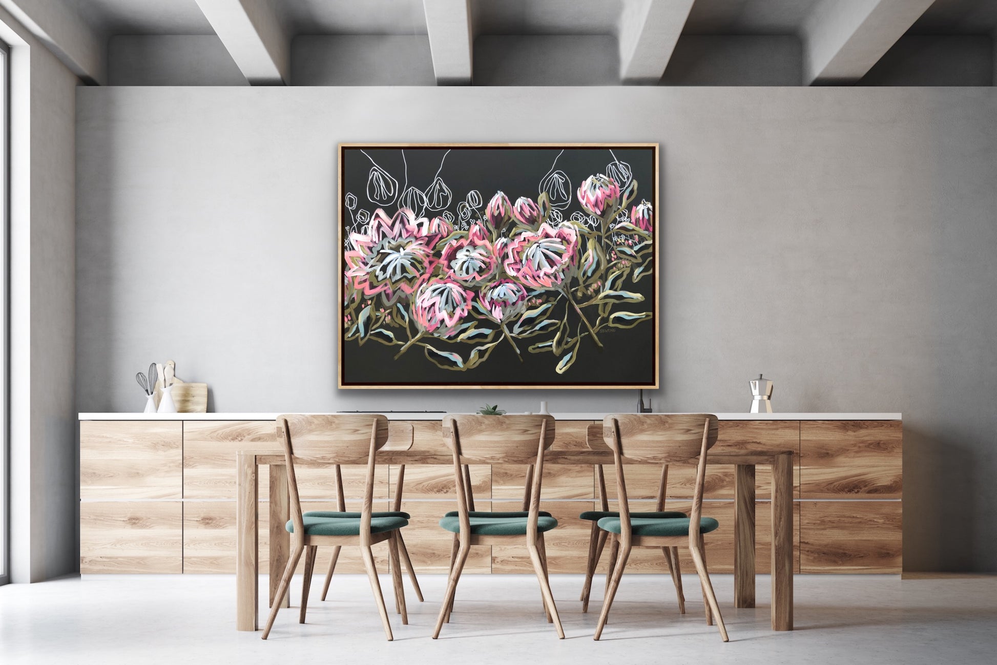 - This artwork would look great framed in an oak timber or black floating frame as shown in the photo (frame is not supplied)