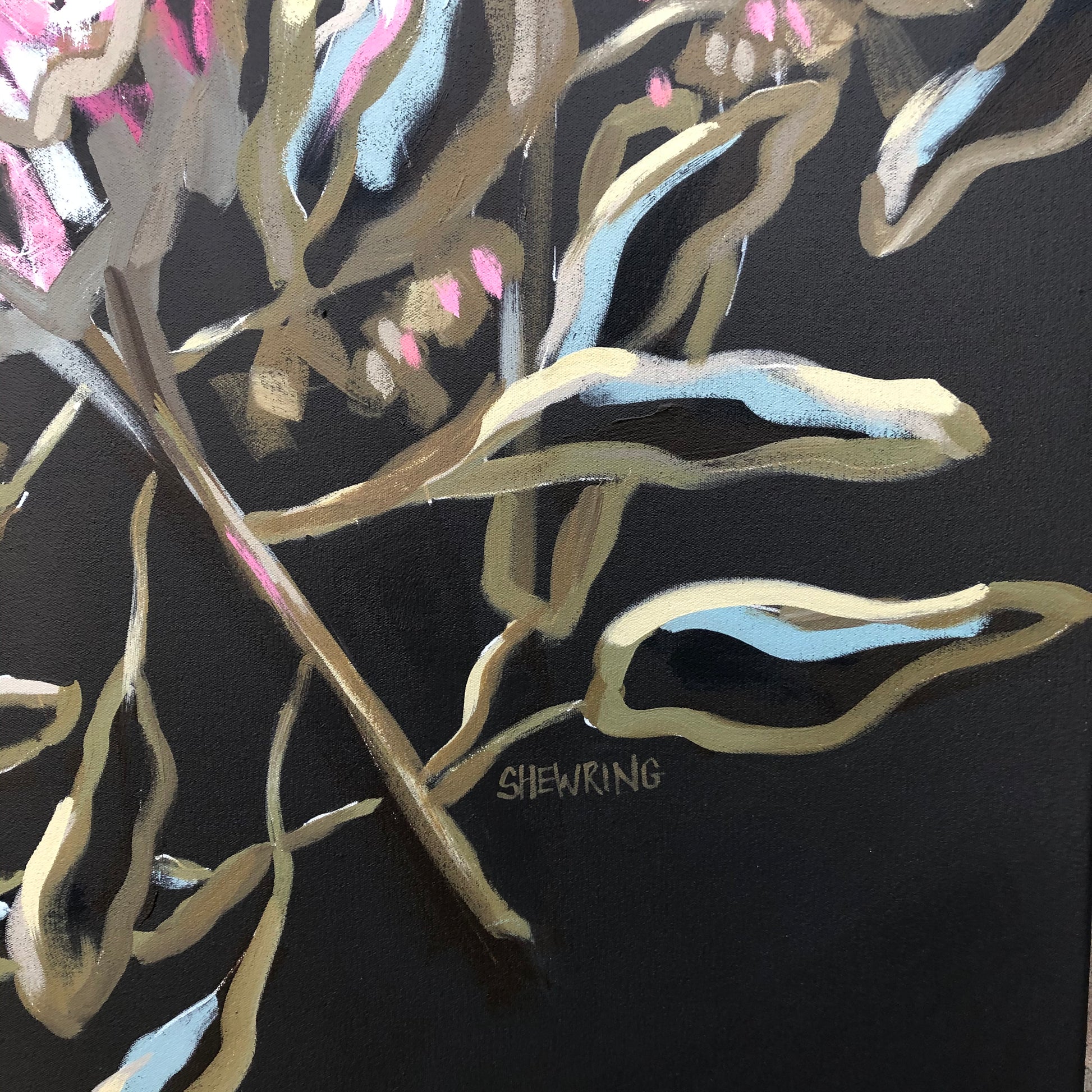 Painting abstract flowers and foliage is such a passion of mine, I adore their awesome colours. In this painting I place their beauty over a dramatic deep warm grey, almost black coloured background.