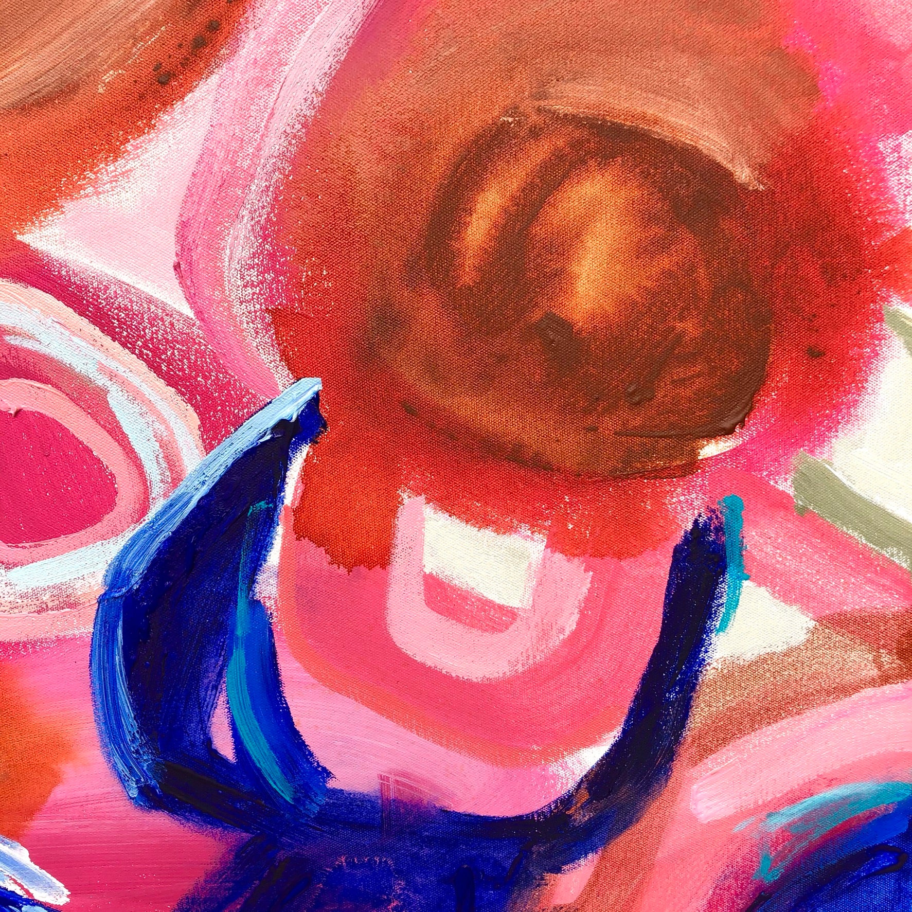 Sugar Sunshine is a bright and really happy flower abstract with delicious melon and berry colours inspired by the beautiful petals in my garden along with a splash of warm earth tones and a sparkle of copper paint. The impressionistic style of the organic shapes were created from my many sketches of foliage and painted in olive greens, navy blues and a touch of turquoise.