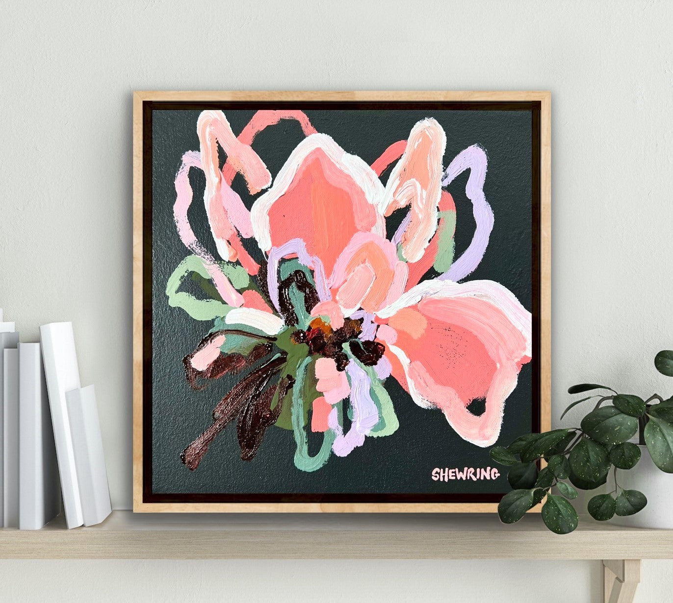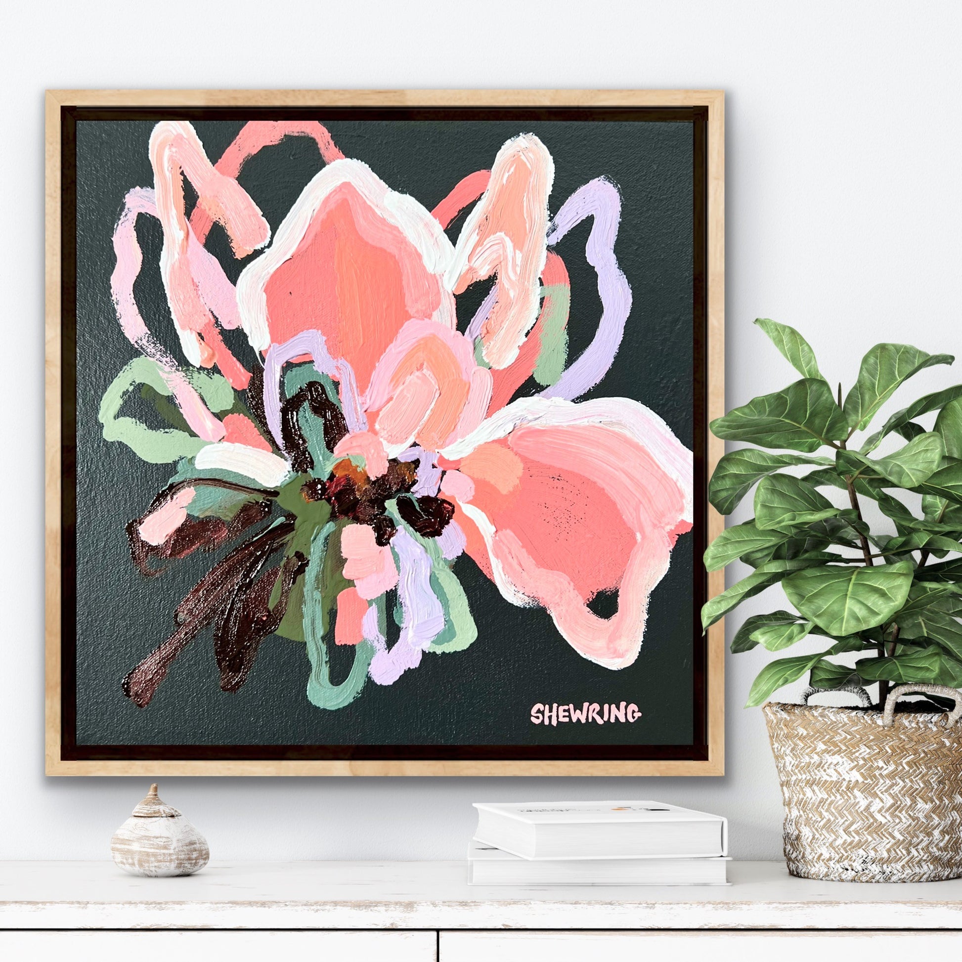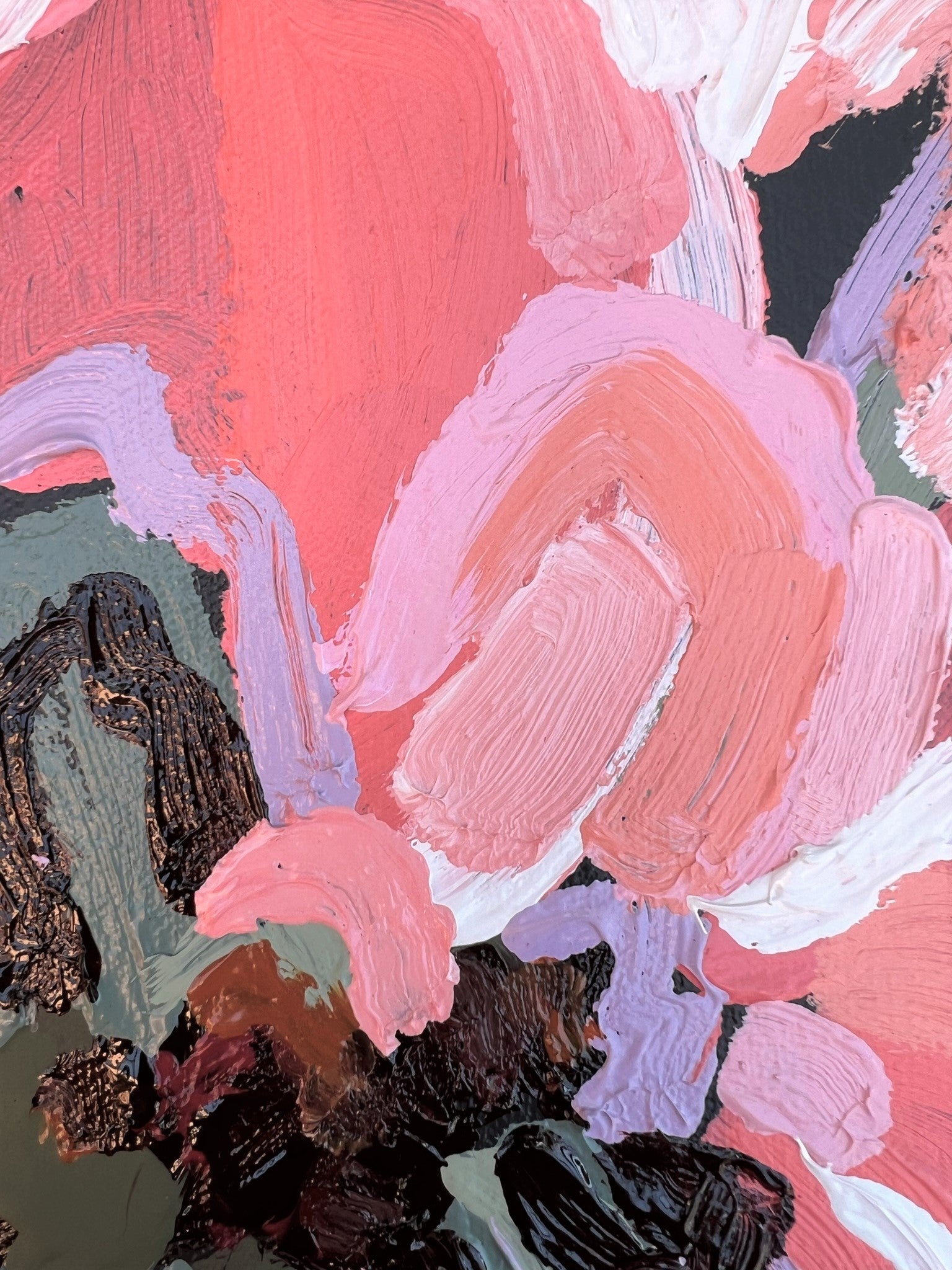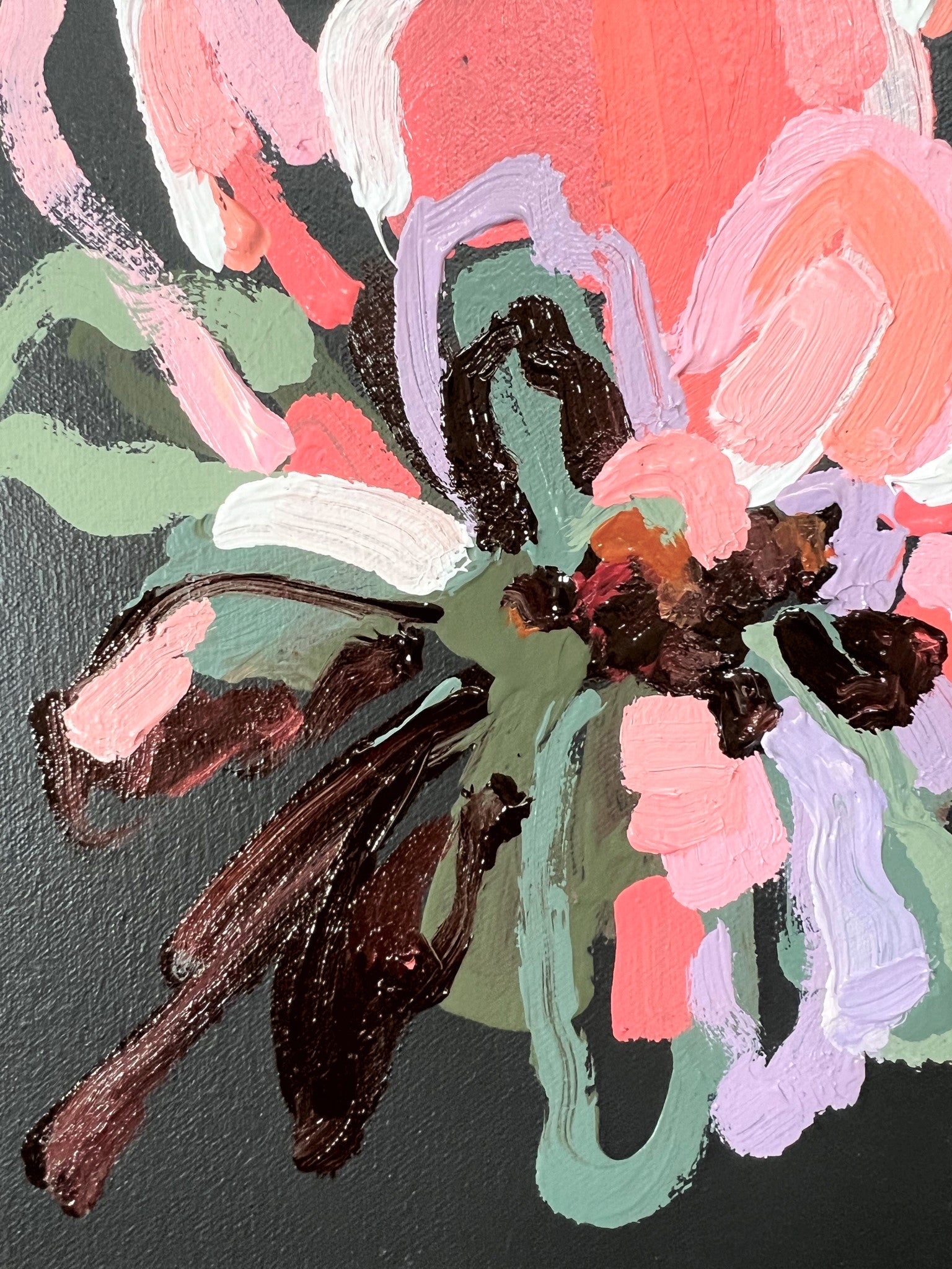 Summer Flower is a beautifully textured flower abstract with gorgeous peach, apricot, watermelon and dusty pinks with a touch of lilac. Chocolate coloured impressions of leaves with bursts of sage and olive greens. This painting has expressive individual brushstrokes that bring it to life!