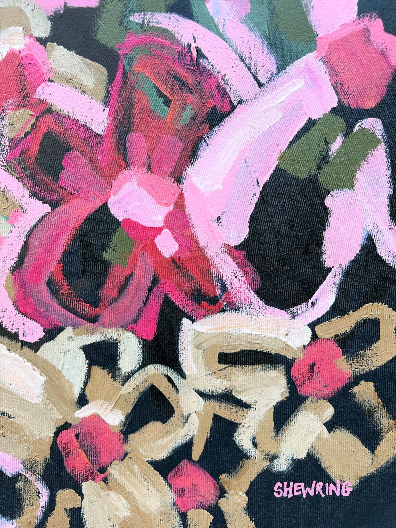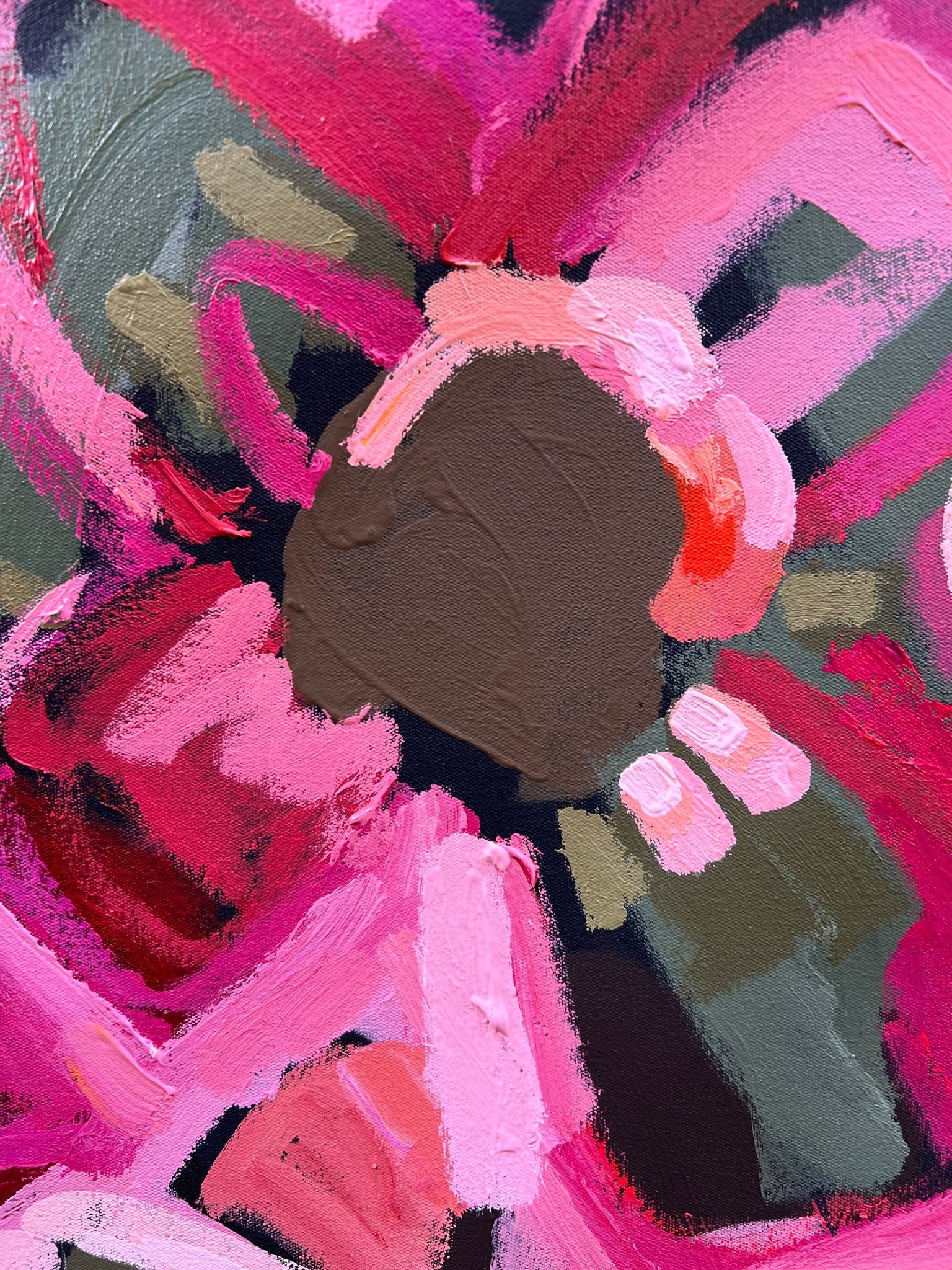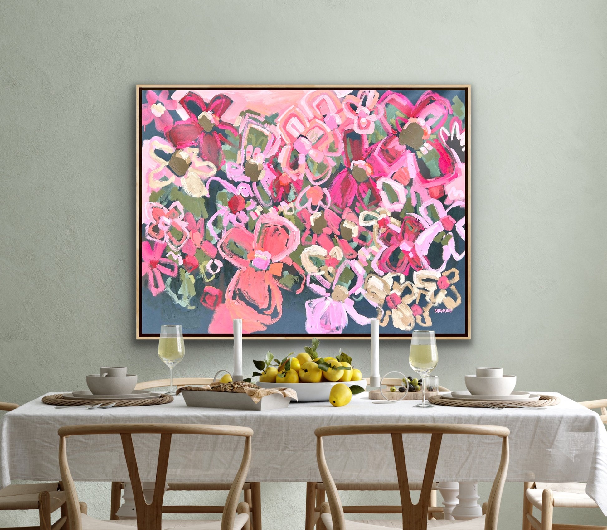 The flowers were created in an expressive style in the colours of love! Eye catching vibrant pinks, delicious apricots, peaches, melons, sage and olive greens have been painted onto a deep charcoal background that would suit a range of different decors.