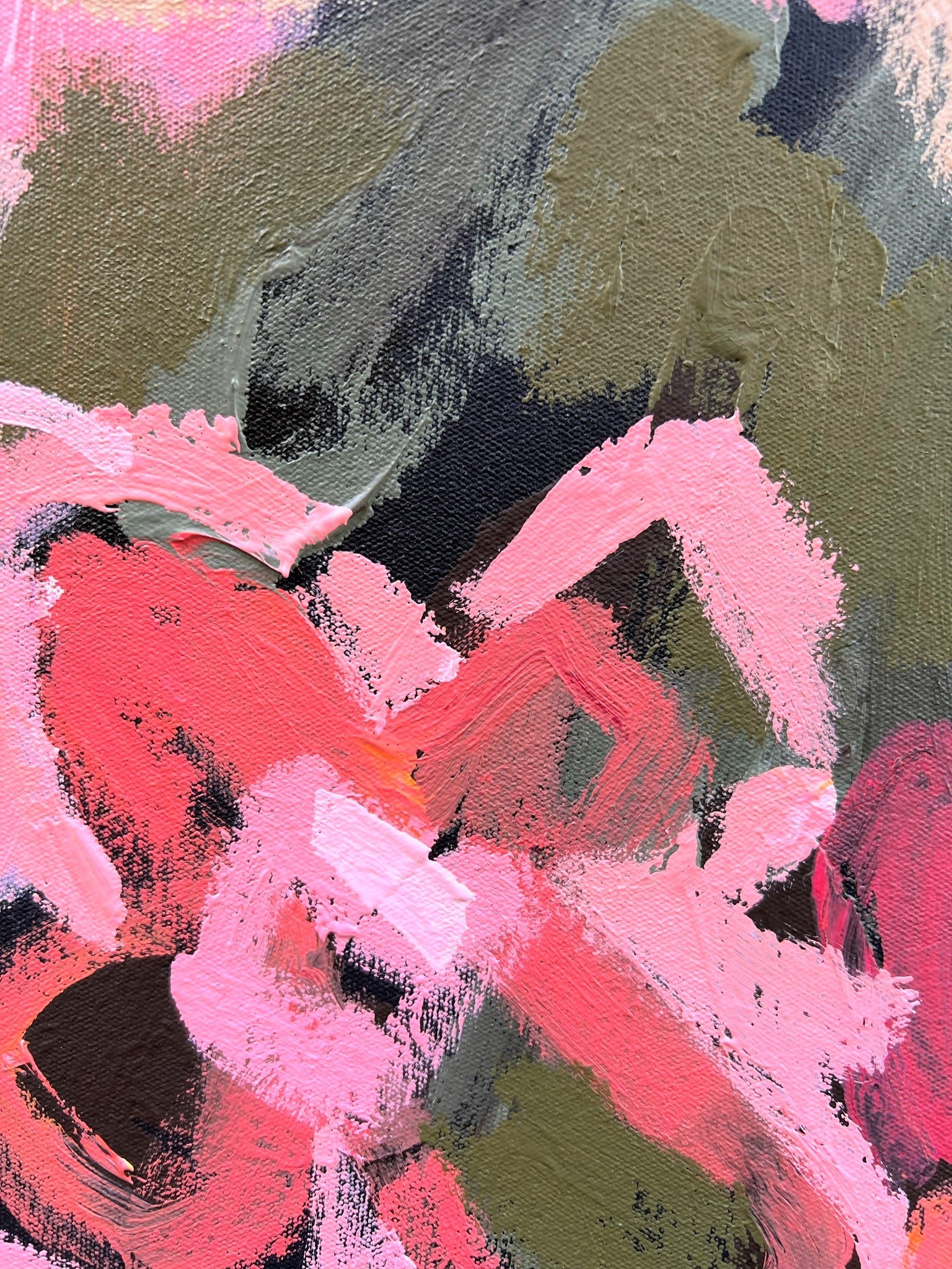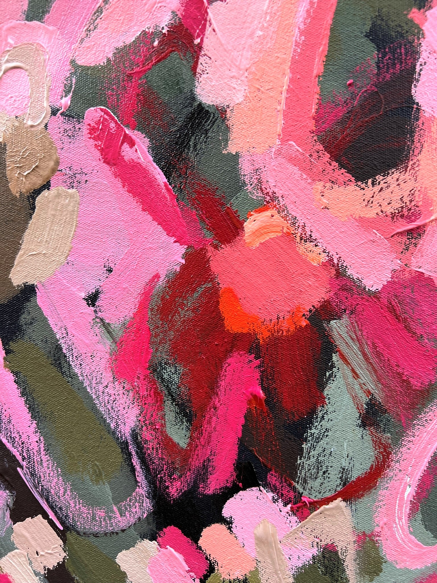 I am obsessed with colour and nature! Outside in the natural environment is where I spend my time sketching the organic forms that surround me. I take them back to my studio where I abstract the beauty and vibrancy of the experience into my paintings. What excites me is creating compositions using a luminous mix of rich colours and texture bringing the outdoors inside feeling happiness from connecting with nature.