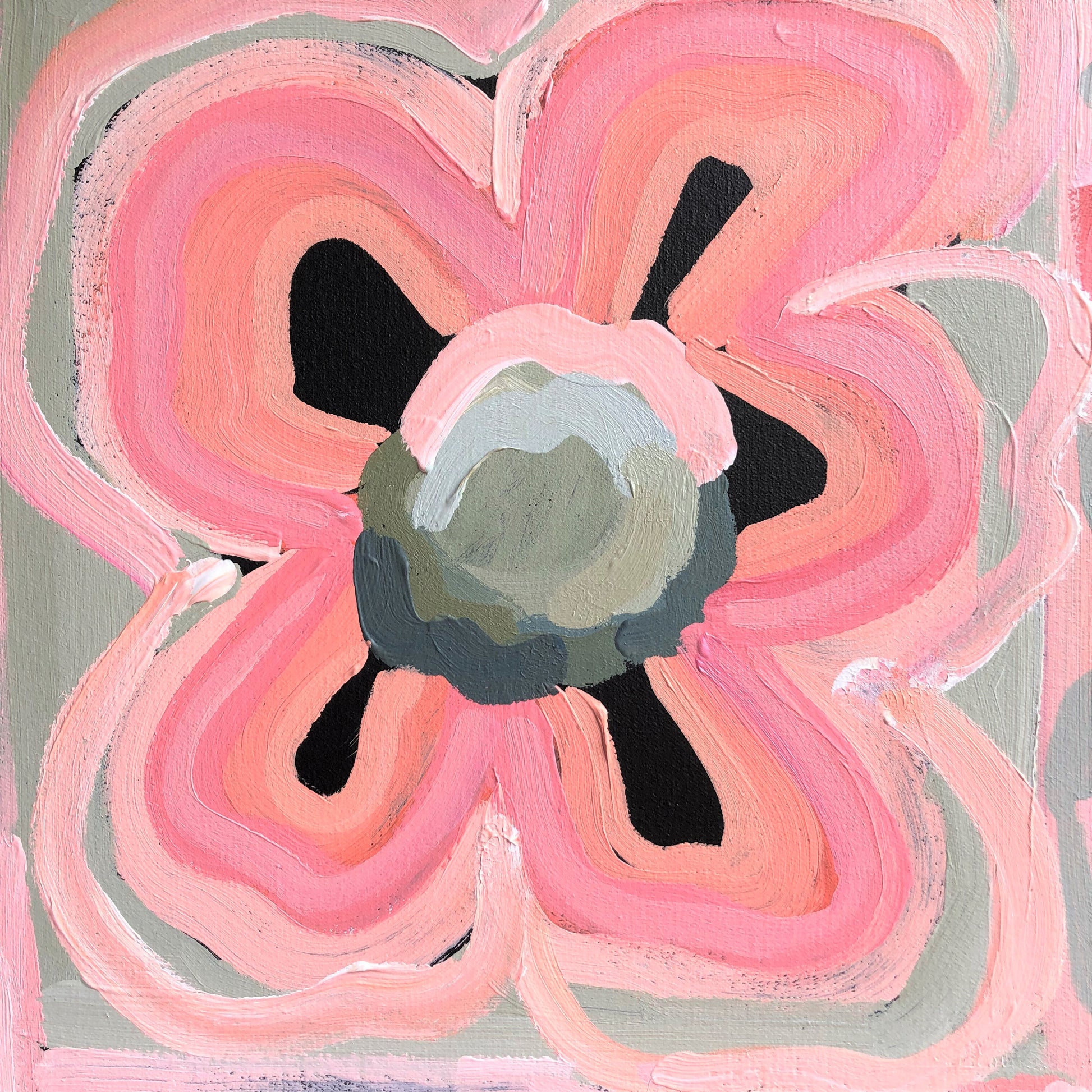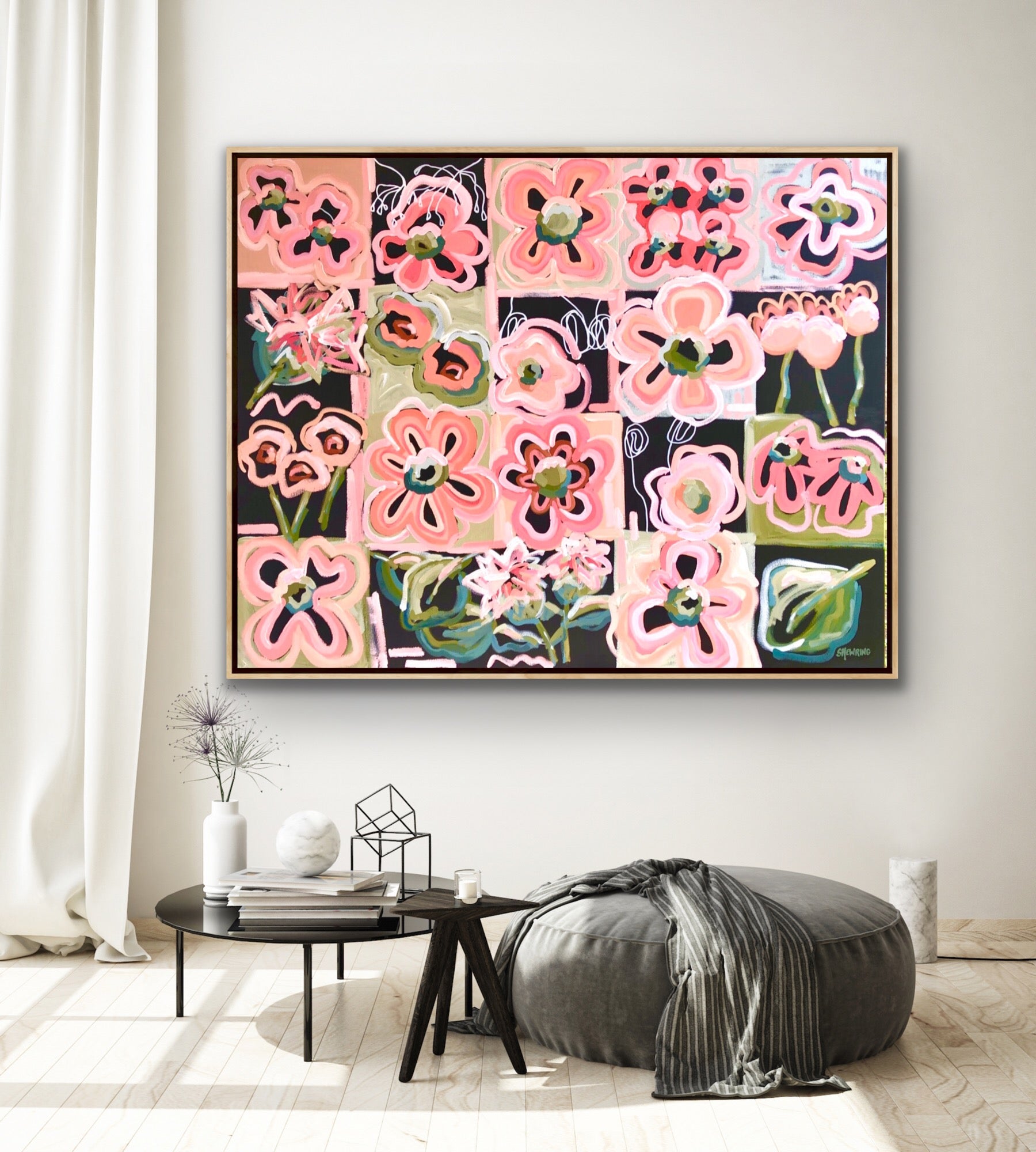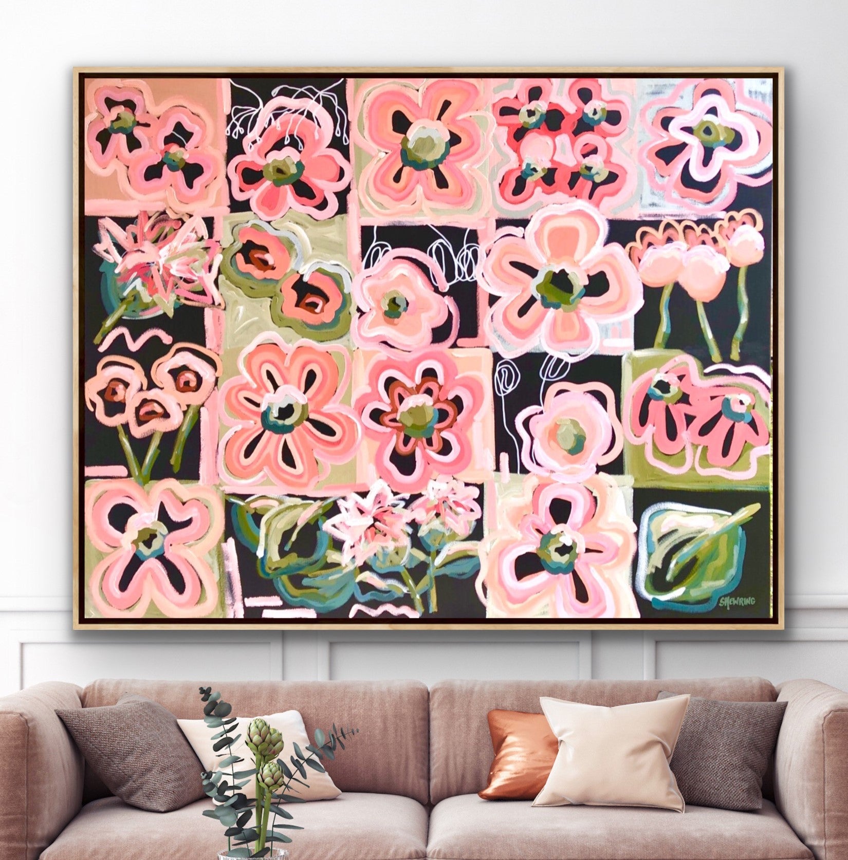 Sun Lovers is a bright and bold BIG happy flower painting inspired by the delicious summer colours of melons, strawberries and raspberries alongside sage and olive greens. This painting was created over a 6 month time line, whenever I produced a beautiful colour mix I added it to this canvas. There are hundreds of colours that all harmonise to make this painting sparkle. It has the passionate colours of love!