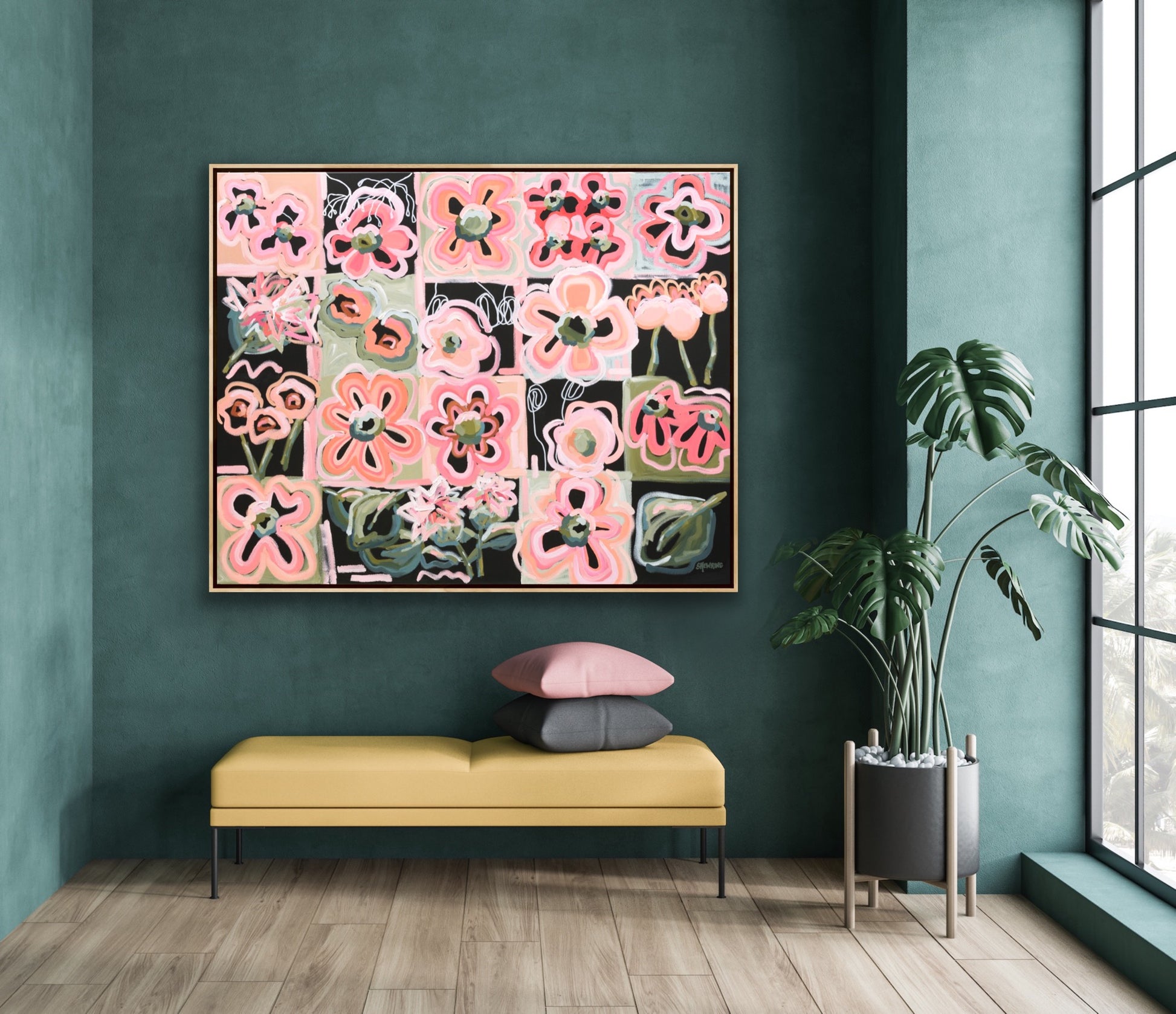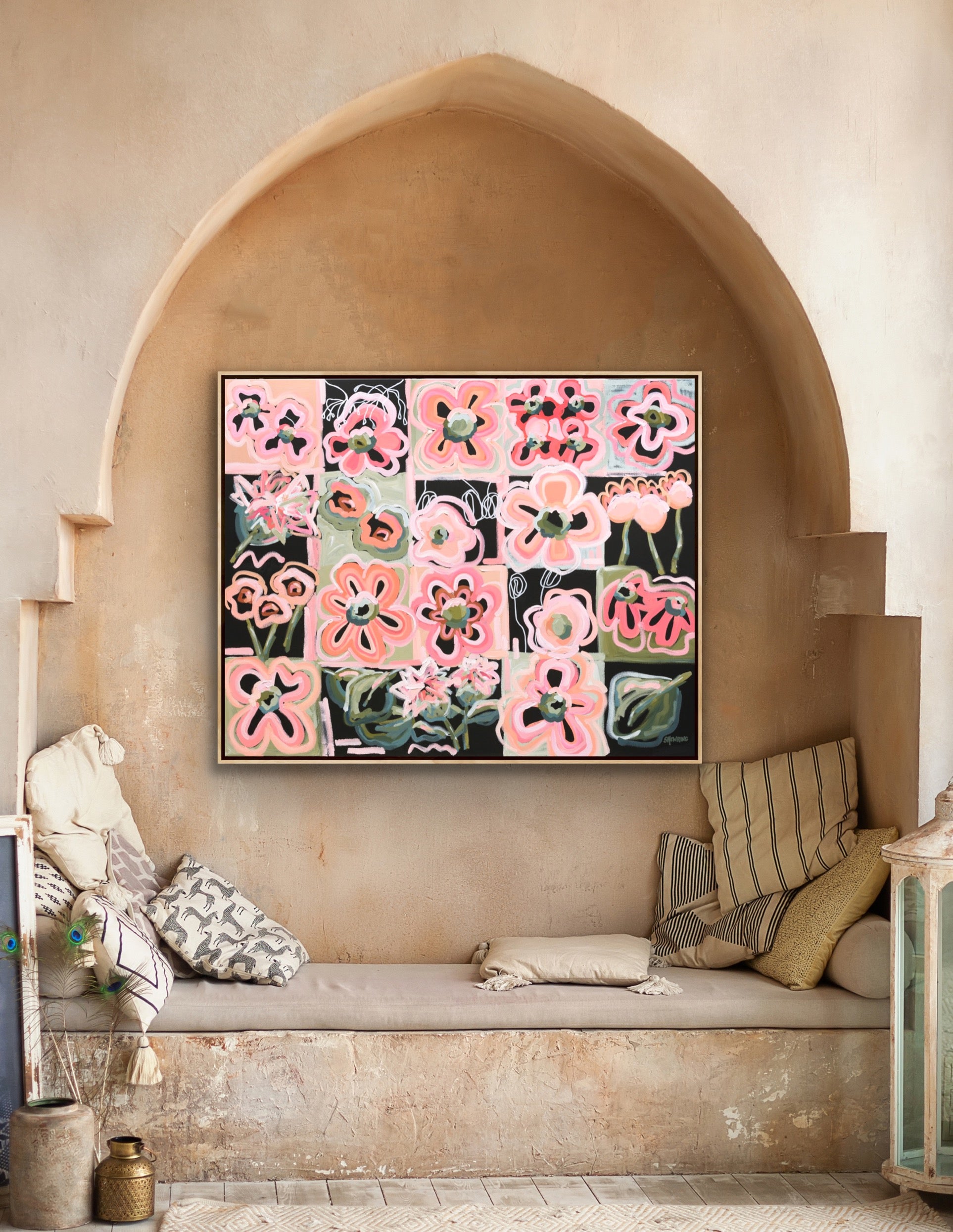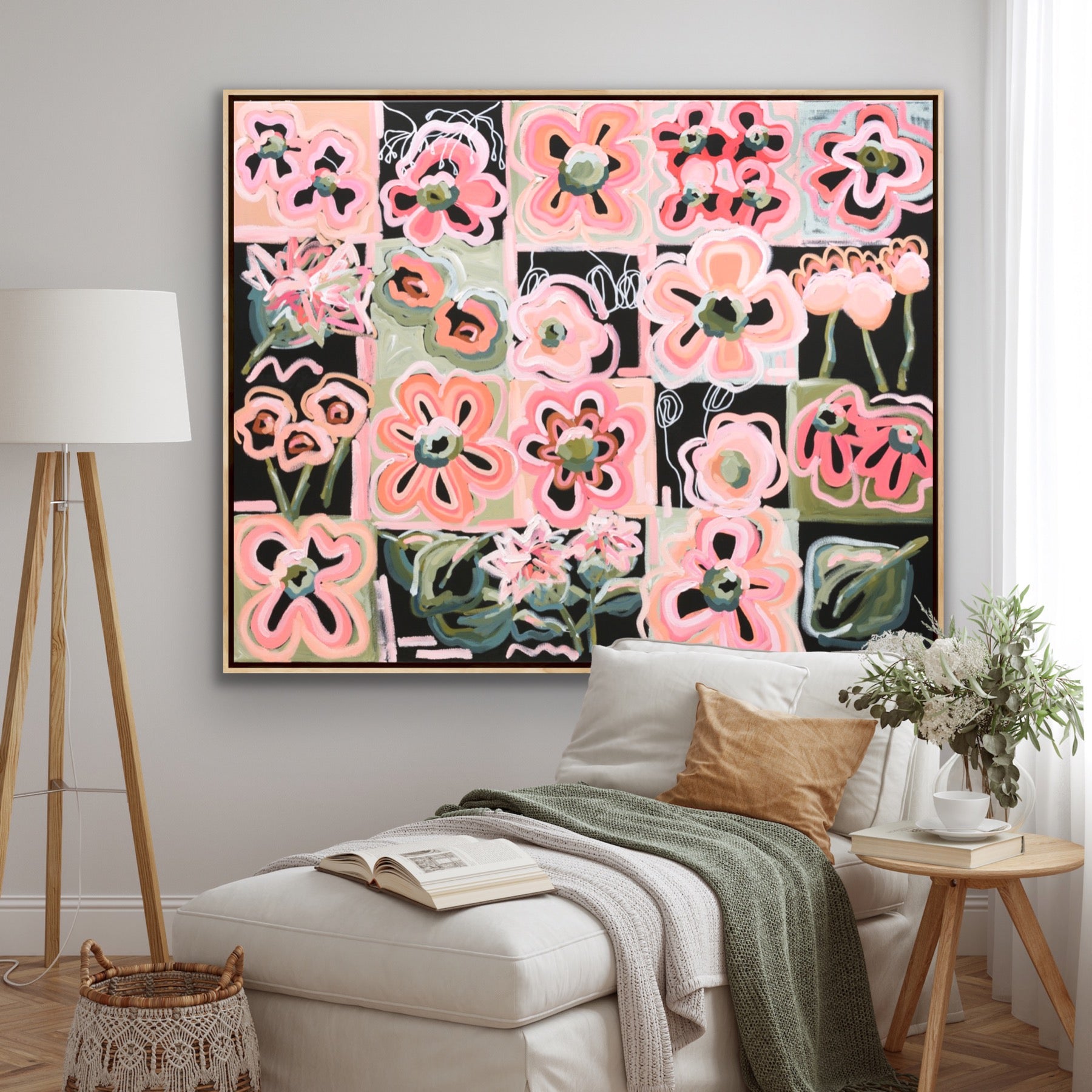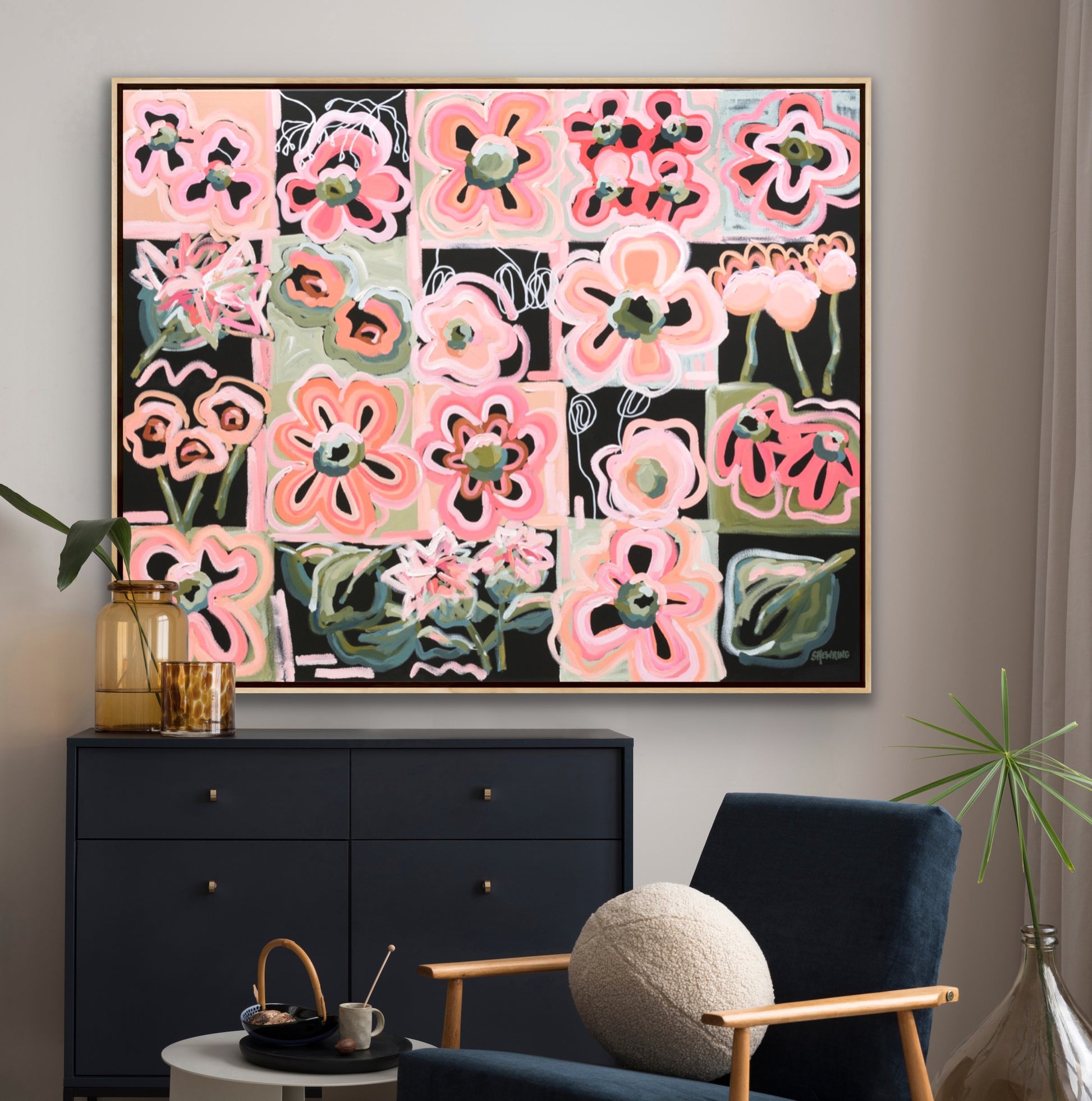 Sun Lovers is a bright and happy flower painting inspired by the delicious summer colours of melons, strawberries and raspberries alongside sage and olive greens. The original artwork was created over a 6 month time line, whenever I produced a beautiful colour mix I added it to the artwork. There are hundreds of colours that all harmonise to make this print sparkle. It has the passionate colours of love!