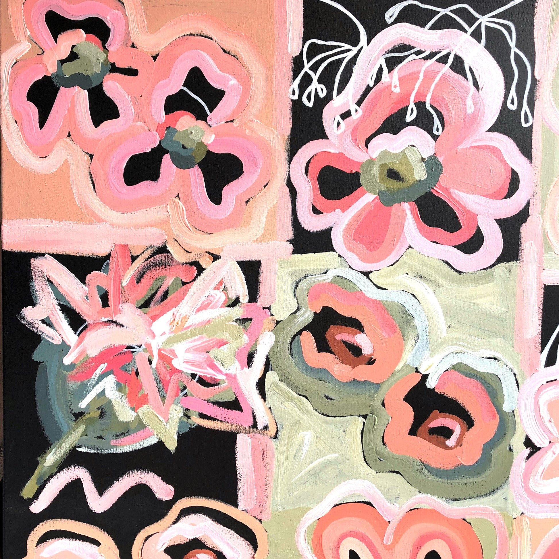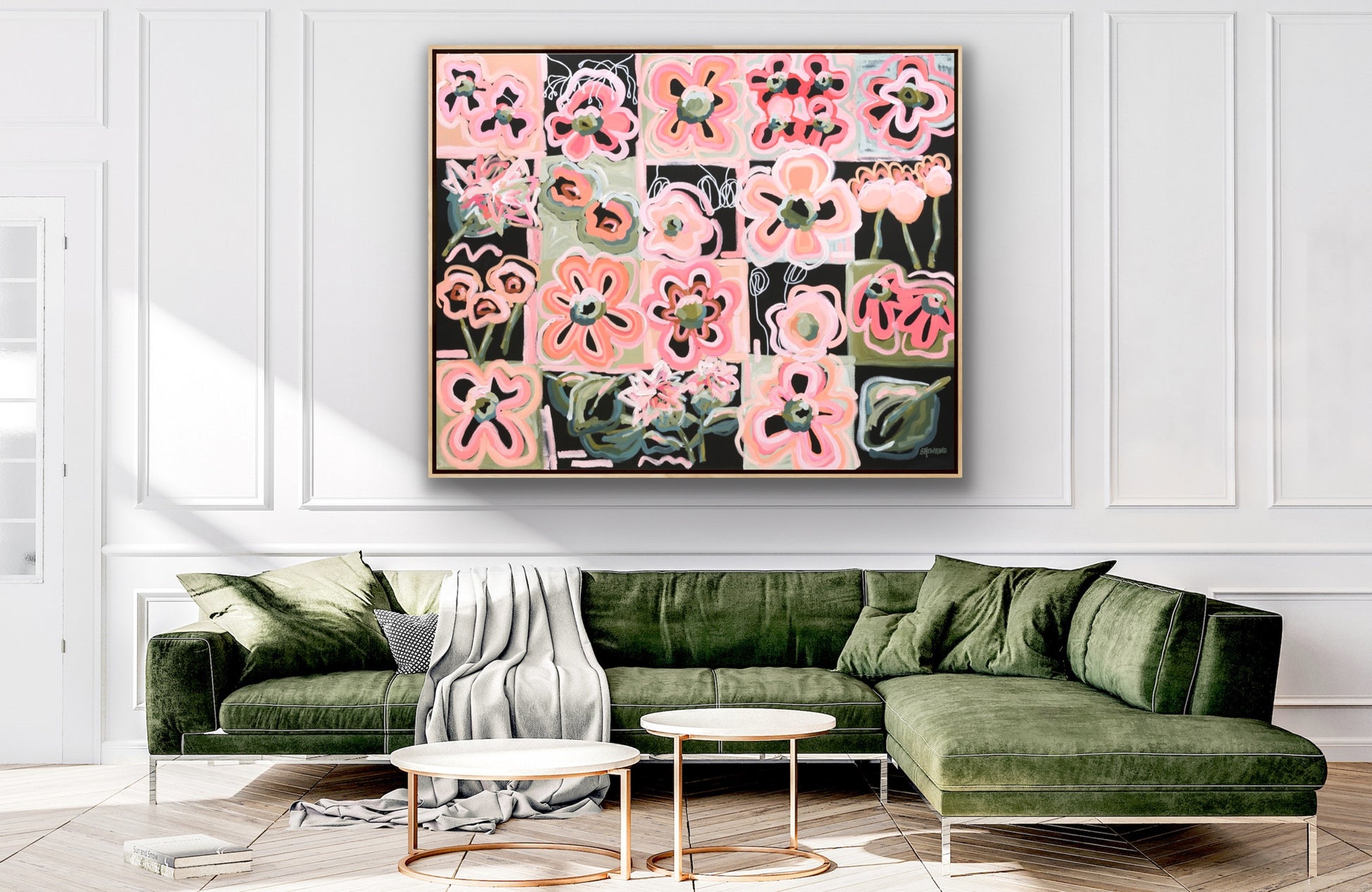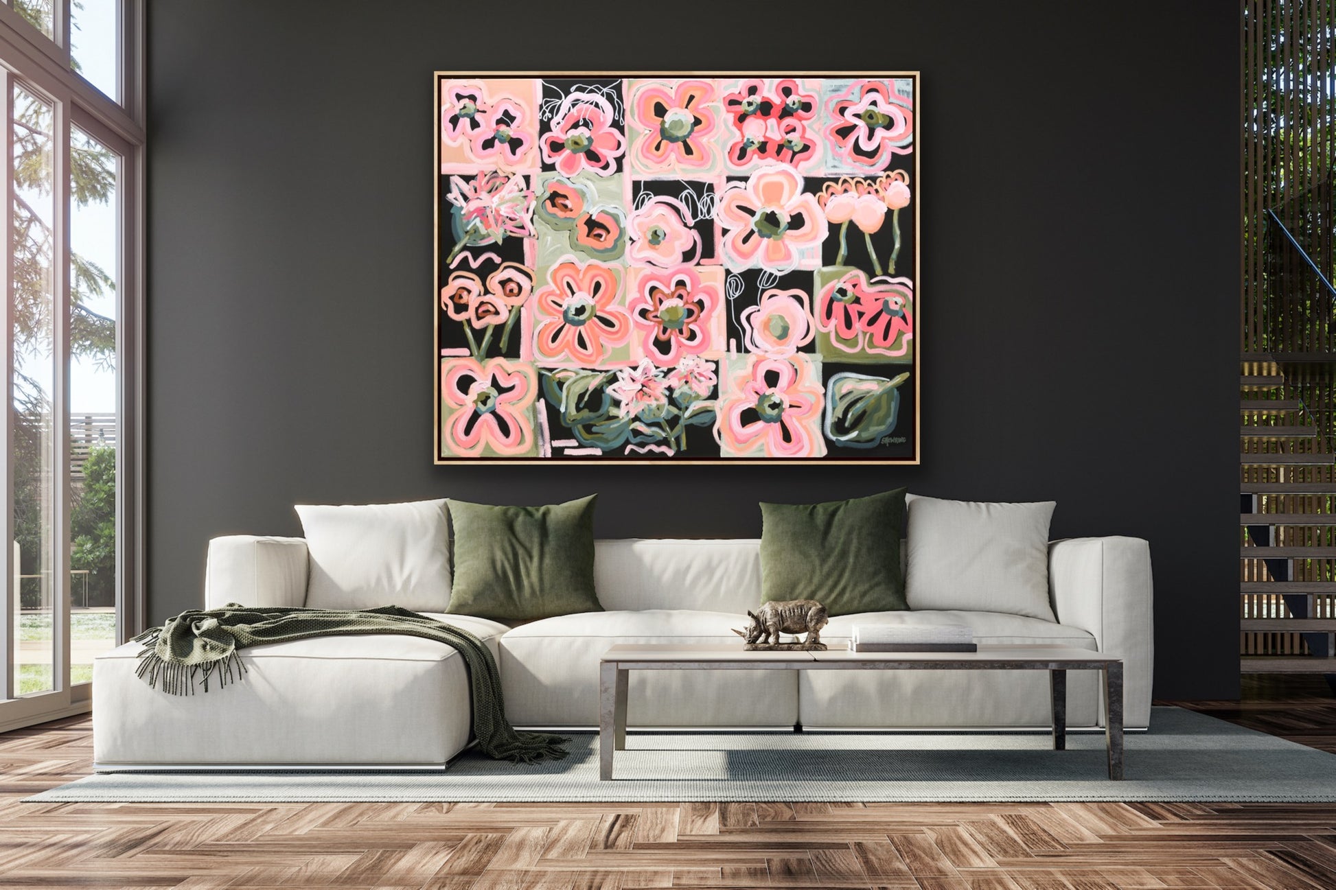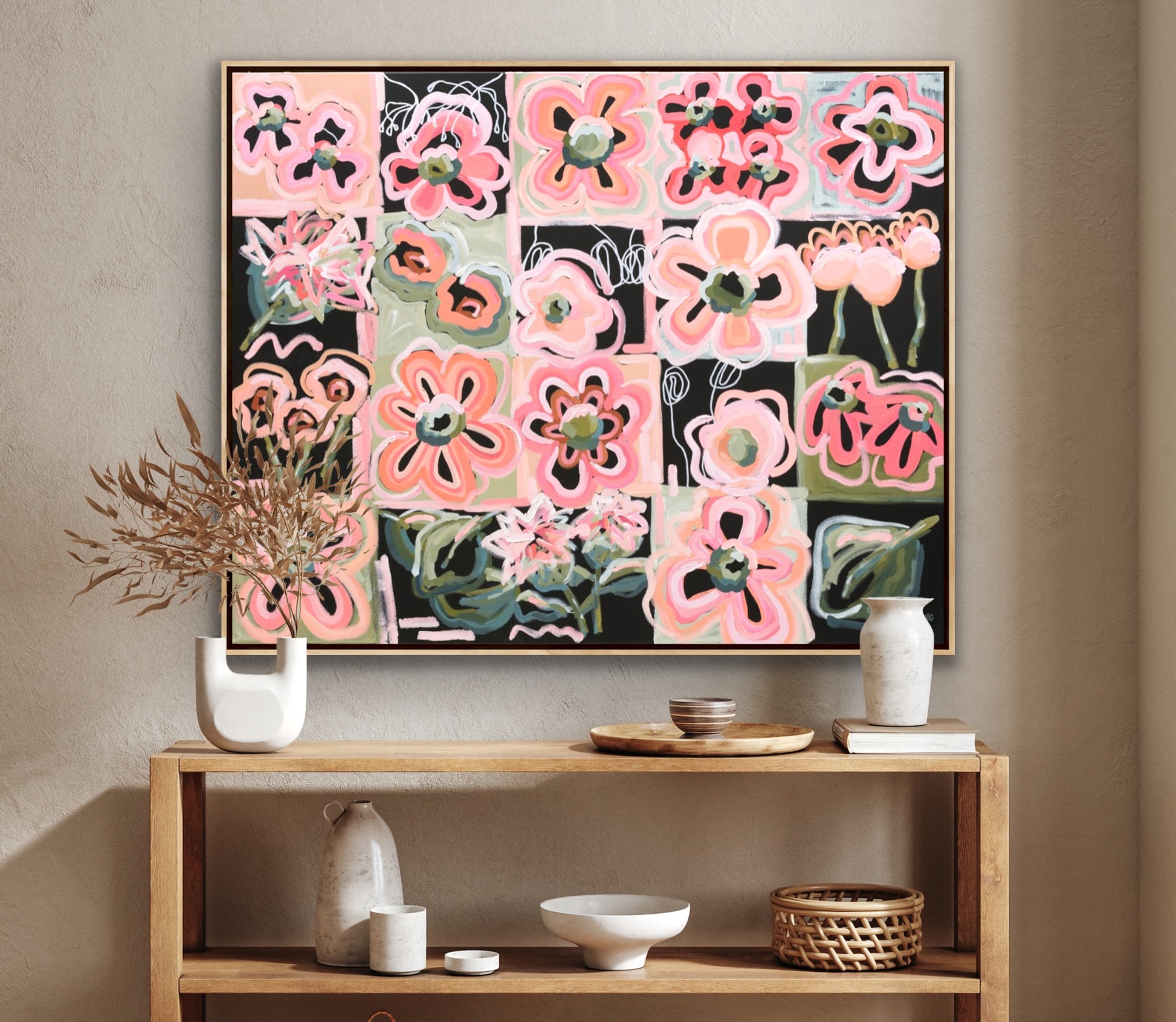 Sun Lovers is a bright and happy flower painting inspired by the delicious summer colours of melons, strawberries and raspberries alongside sage and olive greens. The original artwork was created over a 6 month time line, whenever I produced a beautiful colour mix I added it to the artwork. There are hundreds of colours that all harmonise to make this print sparkle. It has the passionate colours of love!
