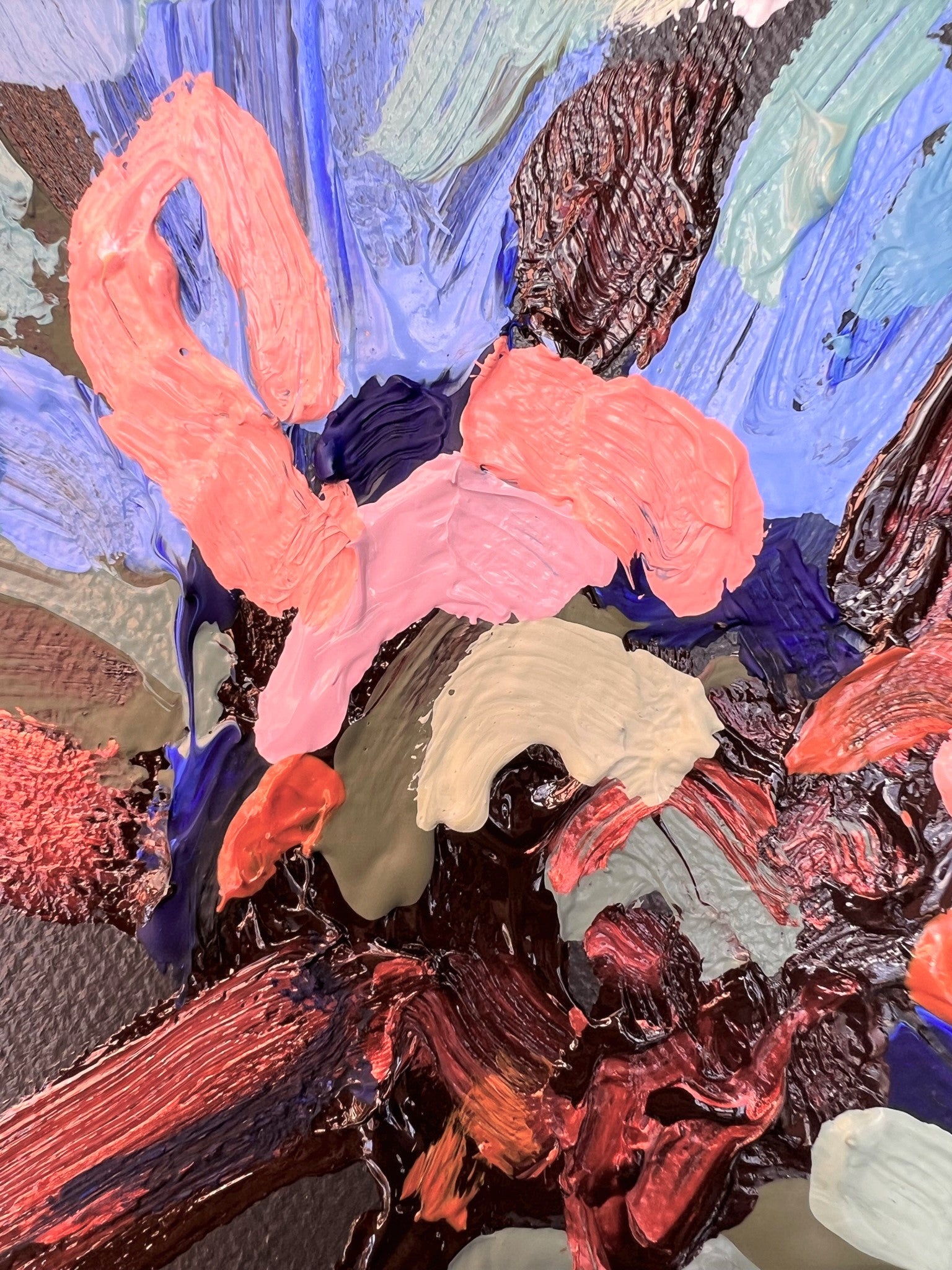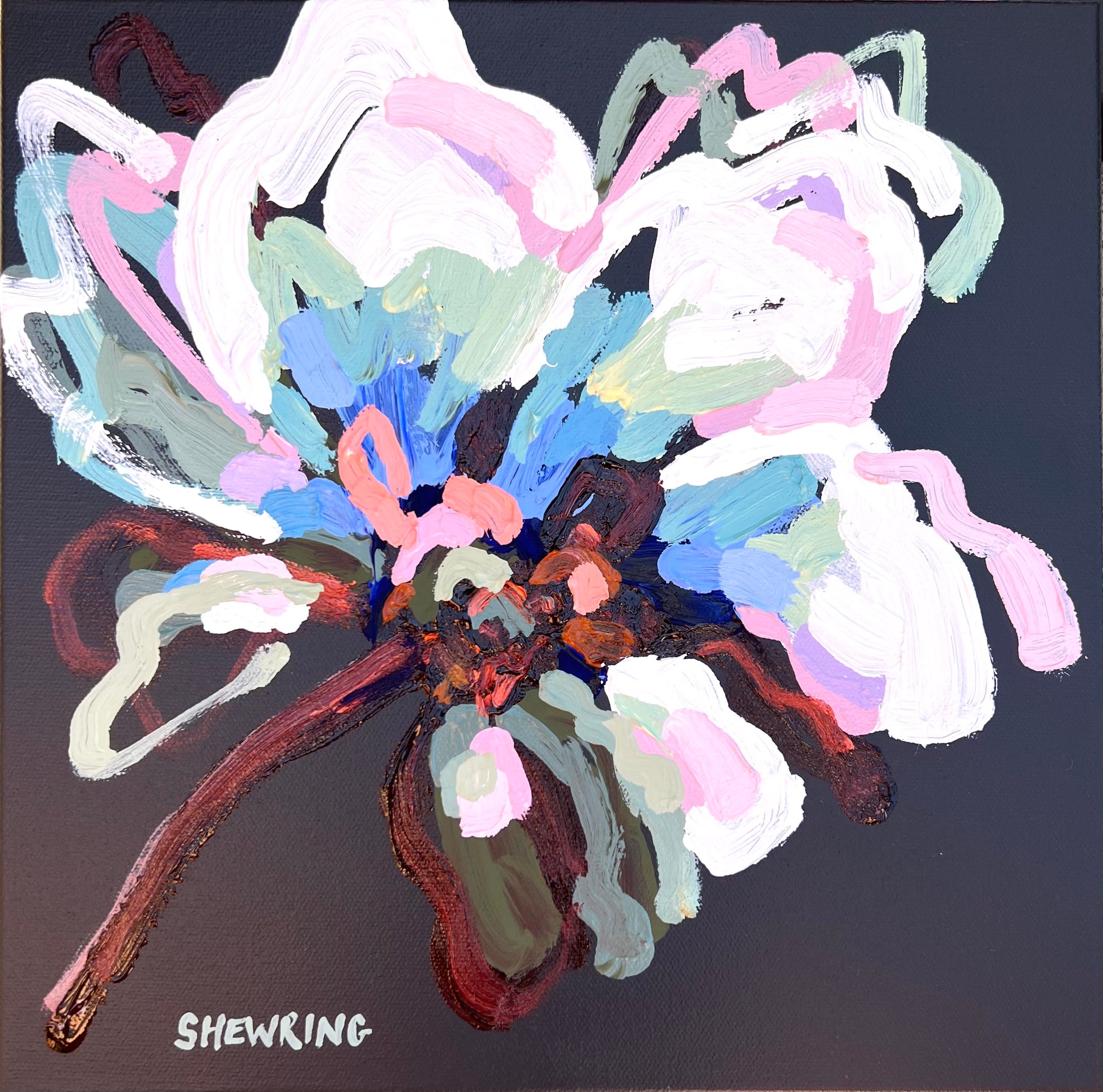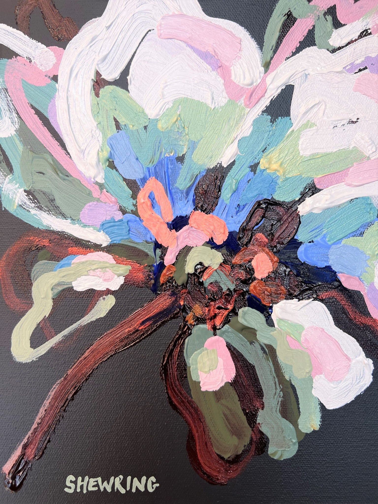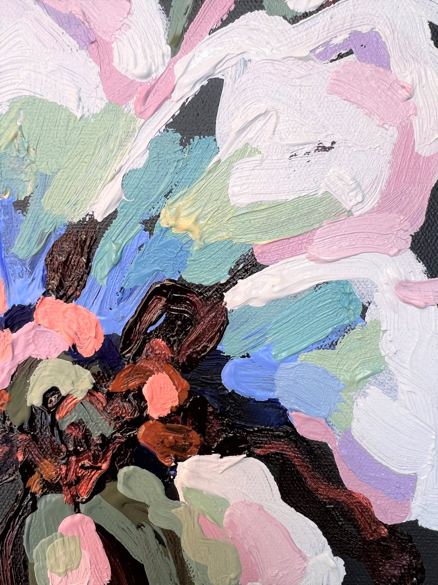 Sunday Blue is a textured flower abstract with beautiful shades of tropical sea blues contrasted with orange tangerine, dusty pinks, chocolate coloured impressions of leaves with bursts of sage and olive greens and a sparkle of bronze. This painting has expressive individual brushstrokes that bring it to life!