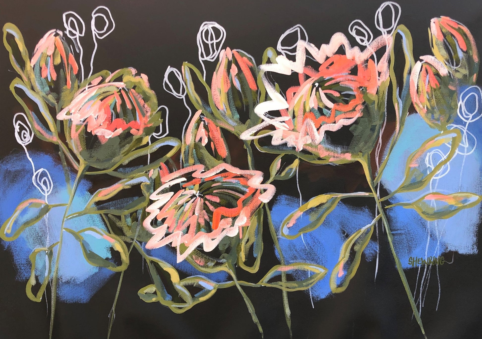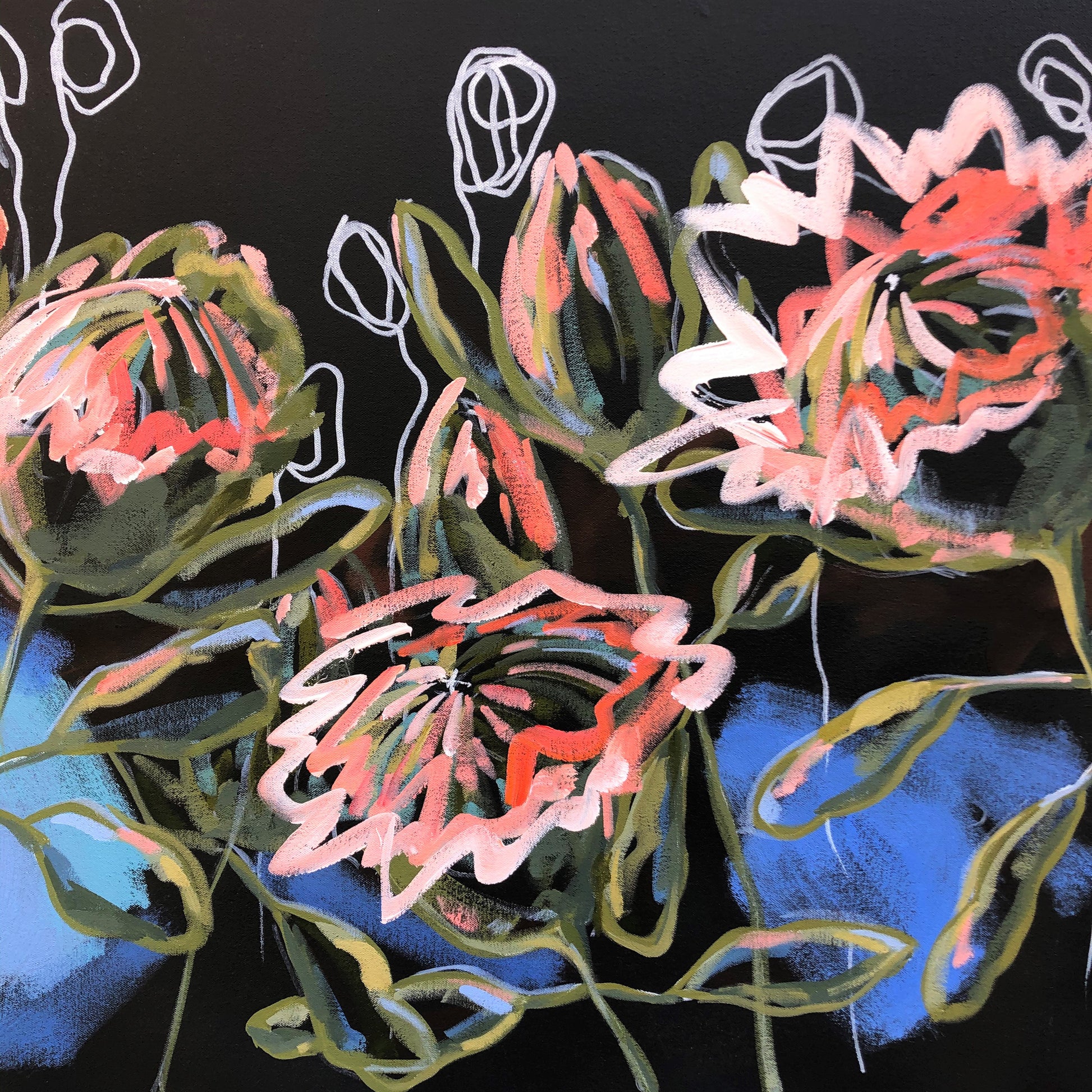 Wow, what an amazing flower, I simply love it’s unique structure and here I have painted it to reflect the colours of the softly setting sun with contrasting splashes of Santorini blue. And such a long lasting flower, it’s beauty survives for many weeks in a vase to enjoy in my studio.