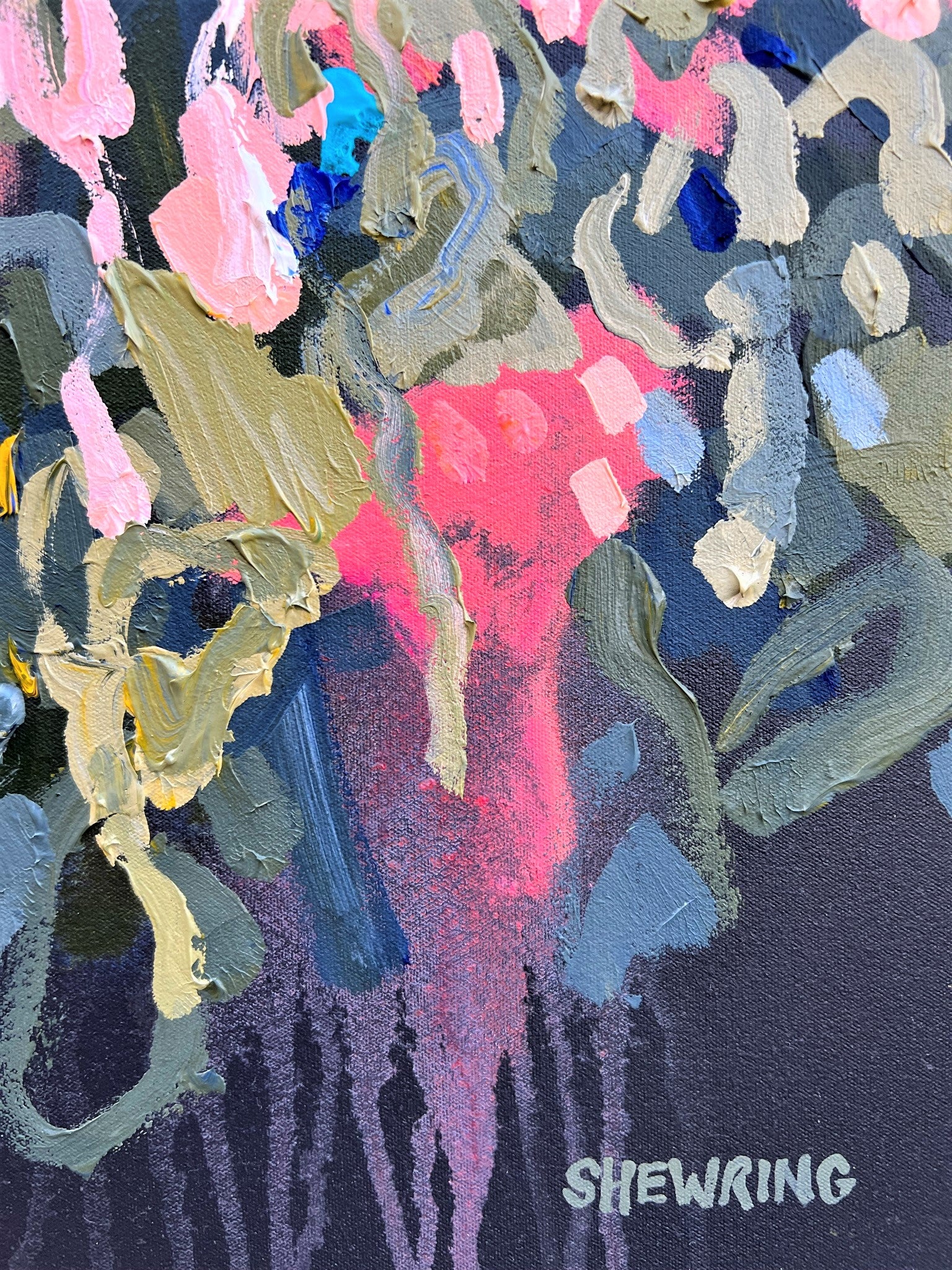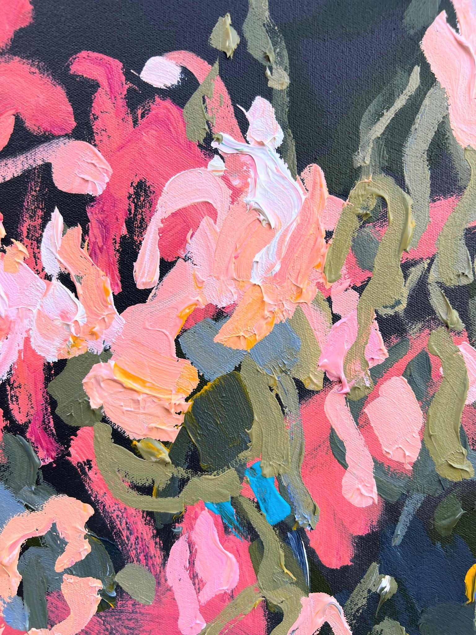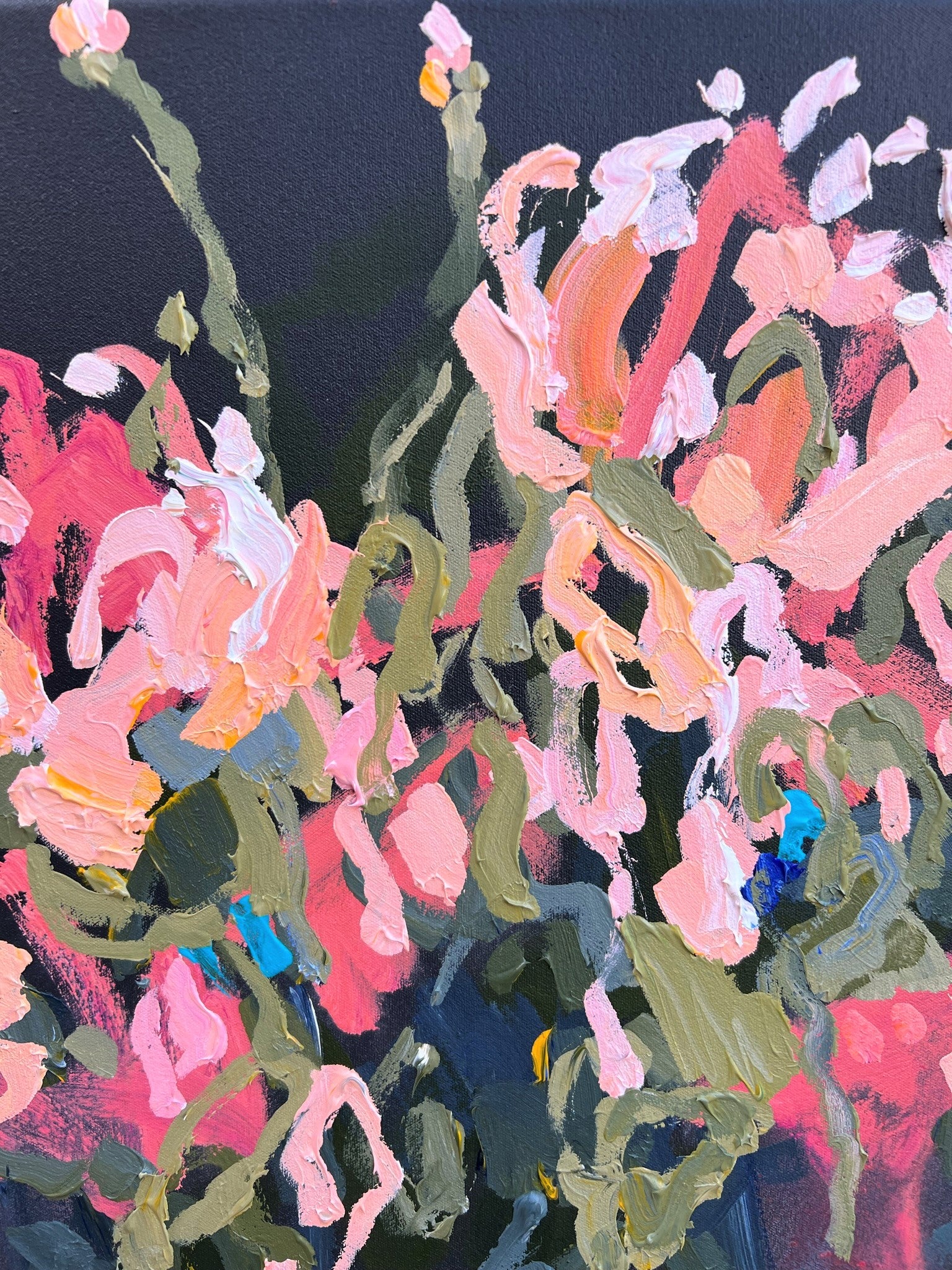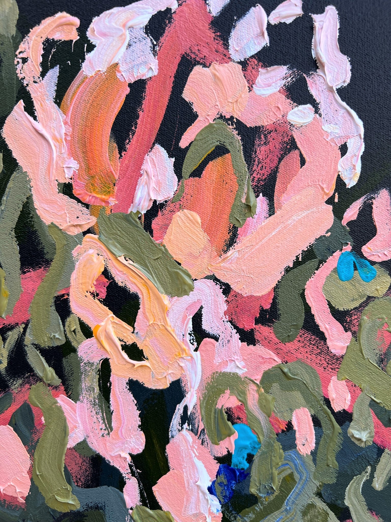 In this painting I place their beauty over a dramatic deep charcoal coloured background.