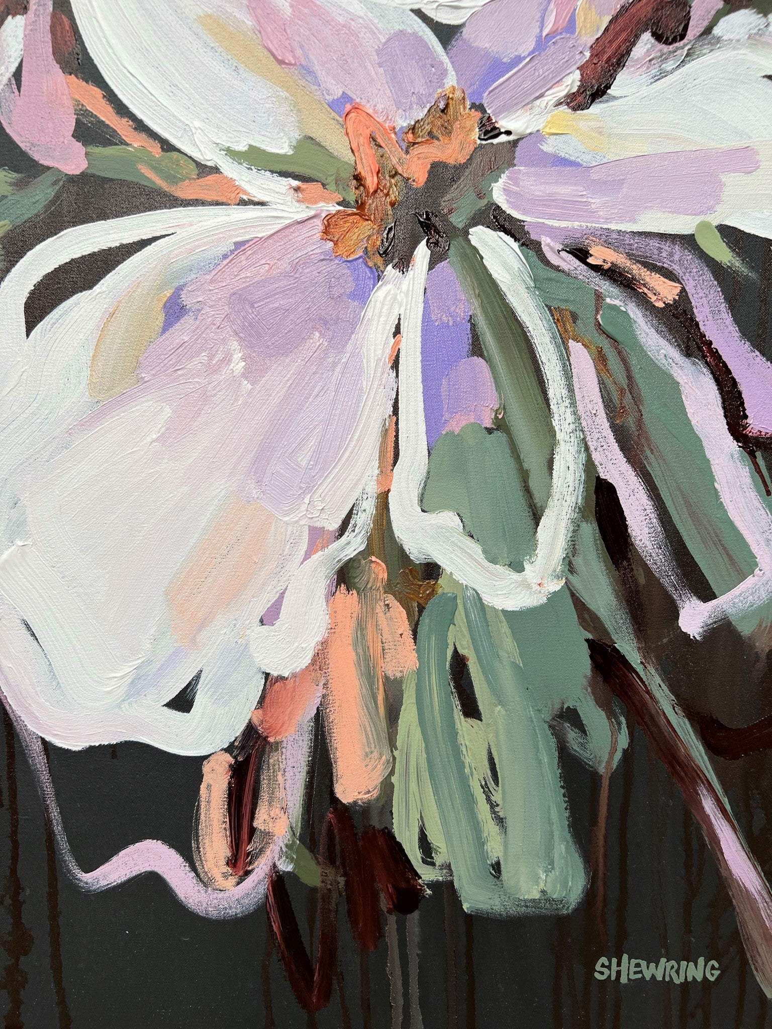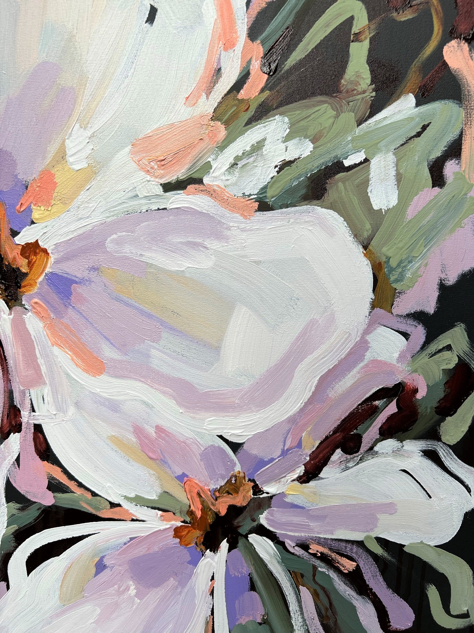 Sweet Romance is a beautifully textured flower abstract with gorgeous creams and dusty pinks, lilac, mauve, butter yellows, orange, tangerine, chocolate coloured impressions of leaves with bursts melons, sage and olive greens. This painting has expressive individual brushstrokes that bring it to life!