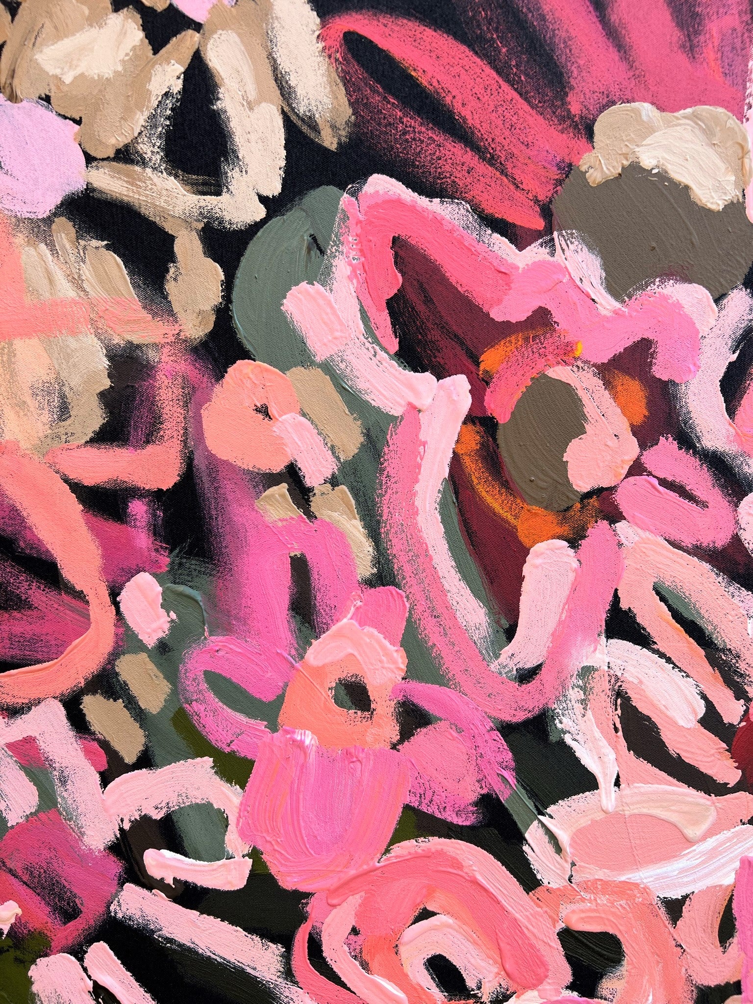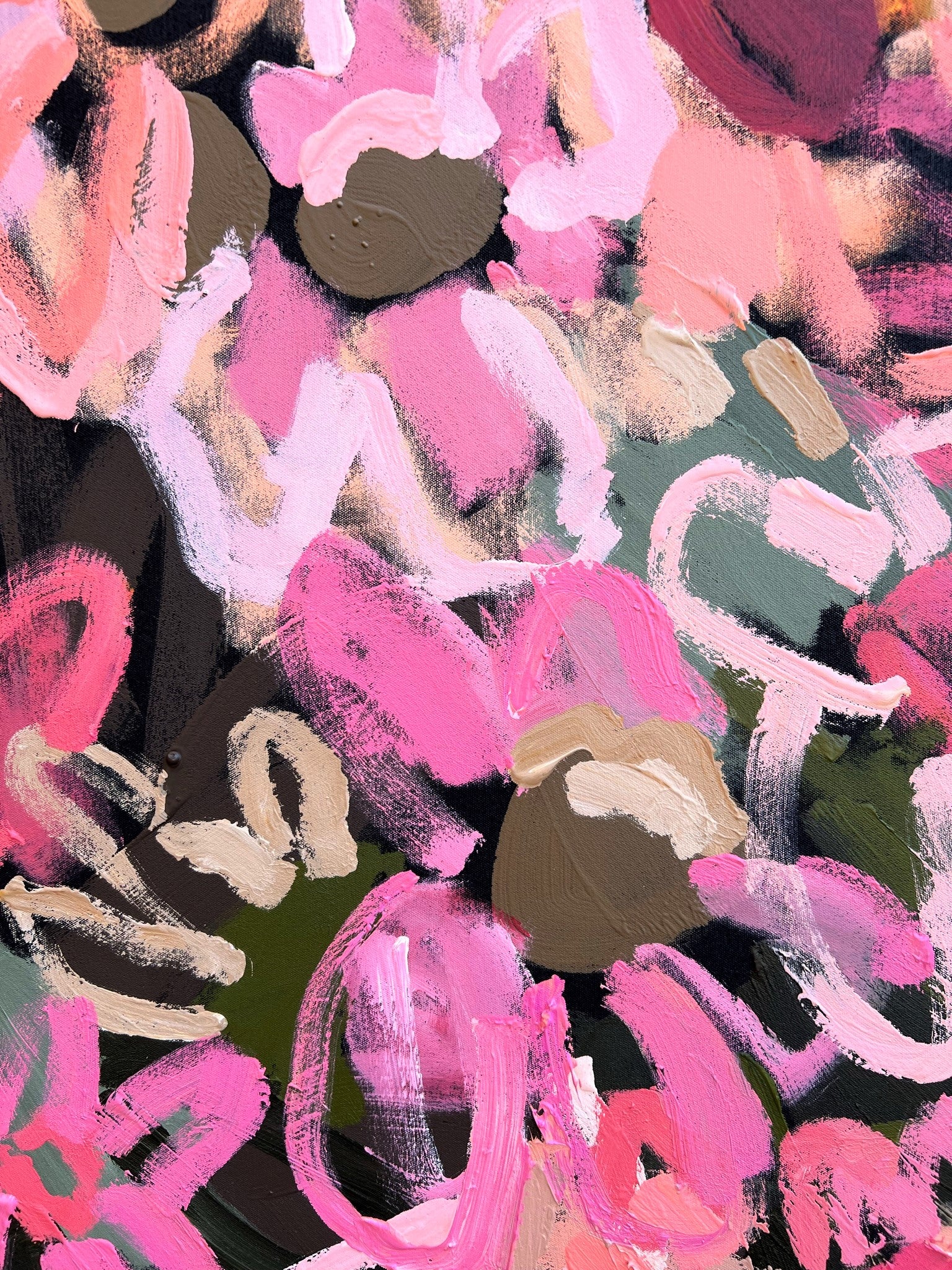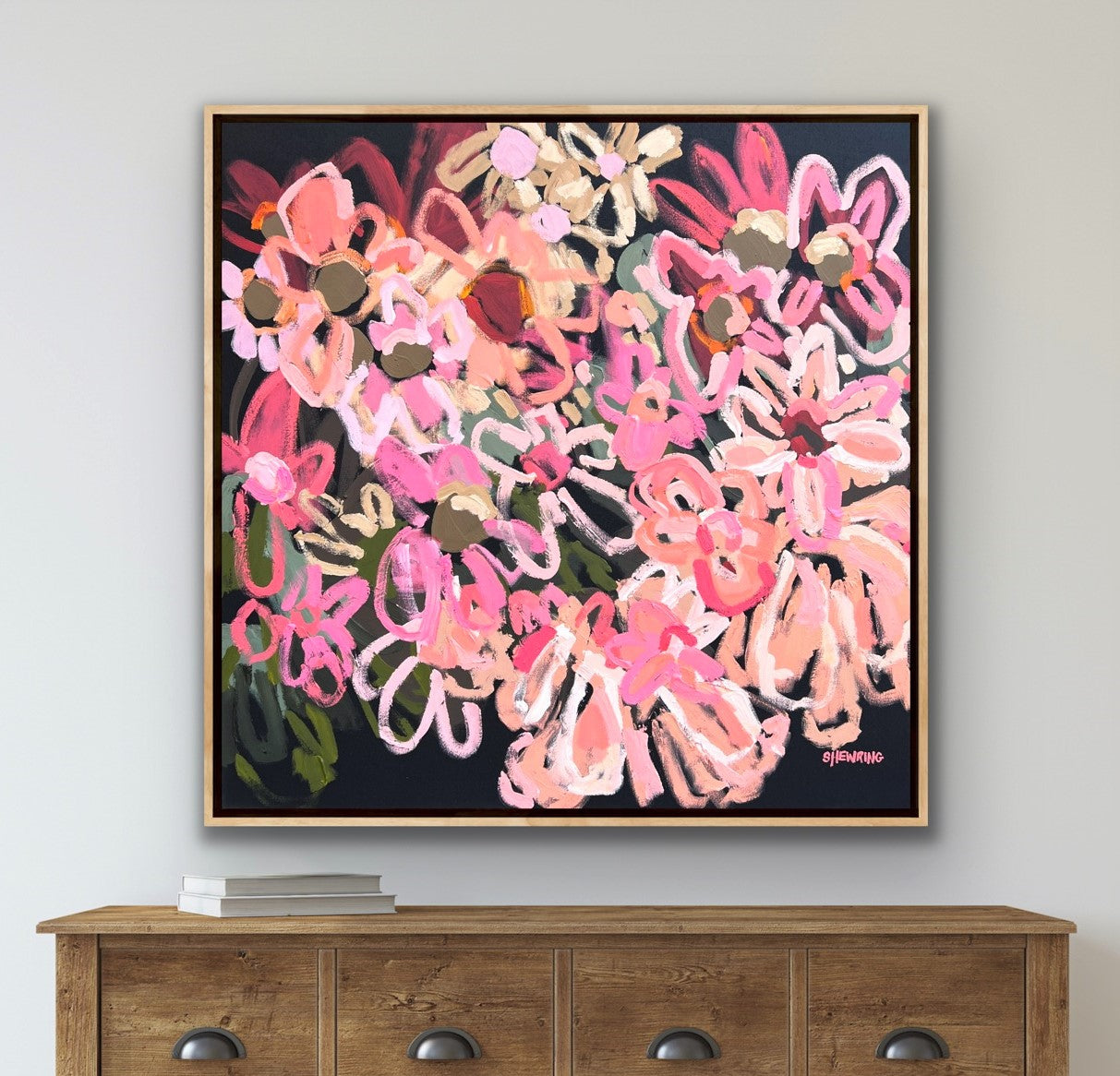 The flowers were created in an expressive style in the colours of love! Eye catching vibrant pinks, delicious apricots, peaches, melons, sage and olive greens have been painted onto a deep charcoal background that would suit a range of different decors.