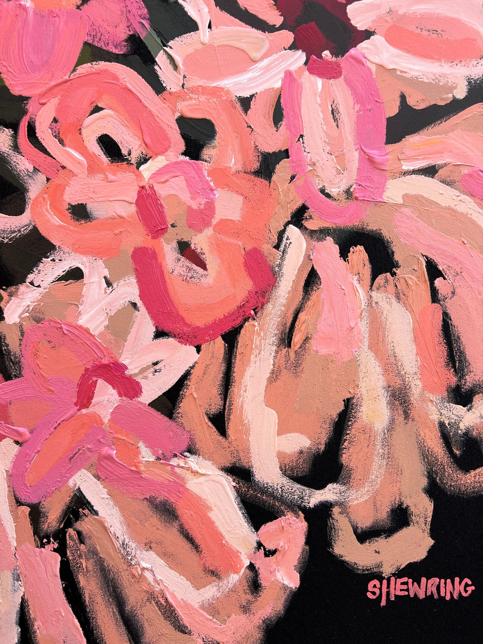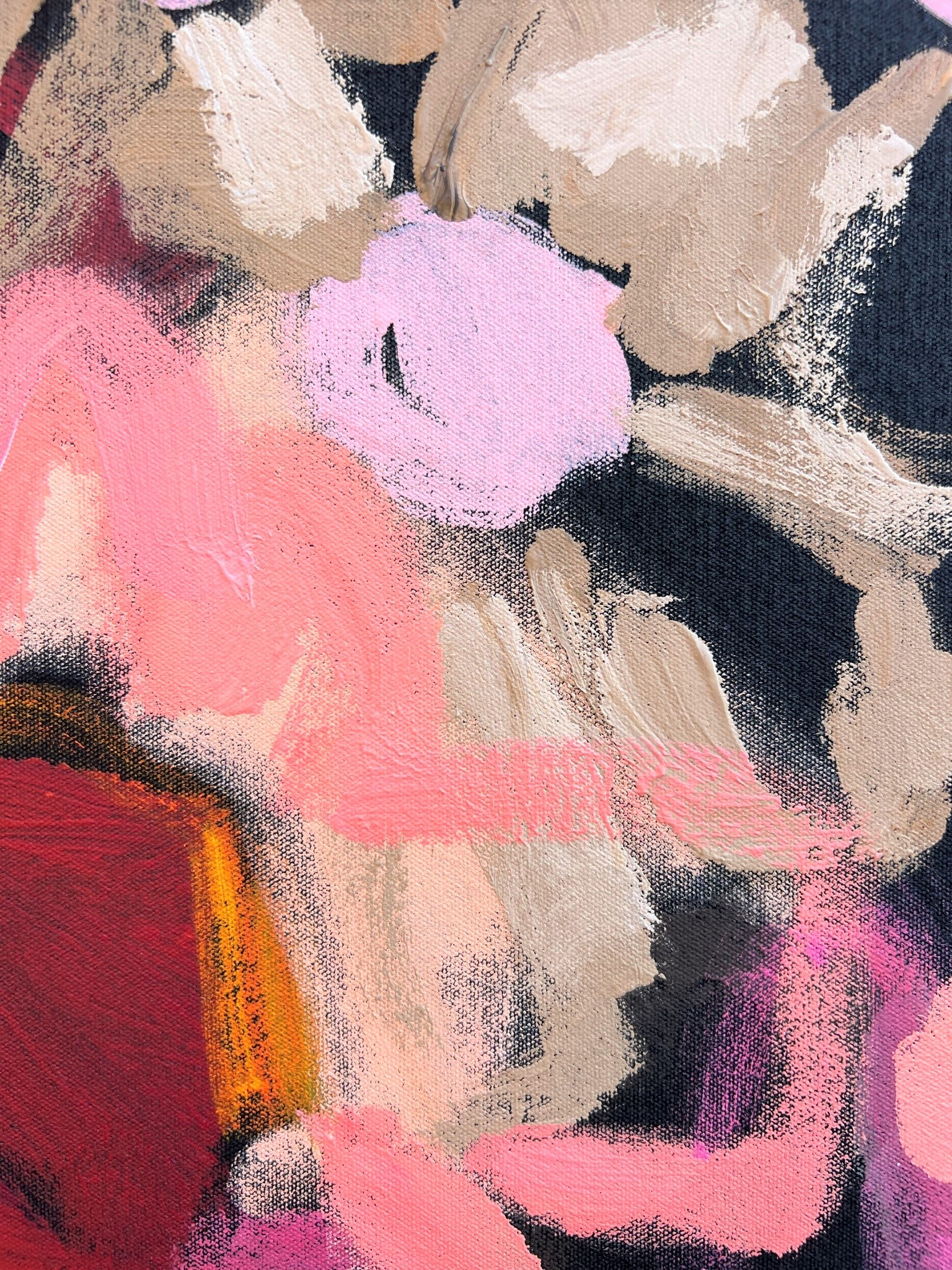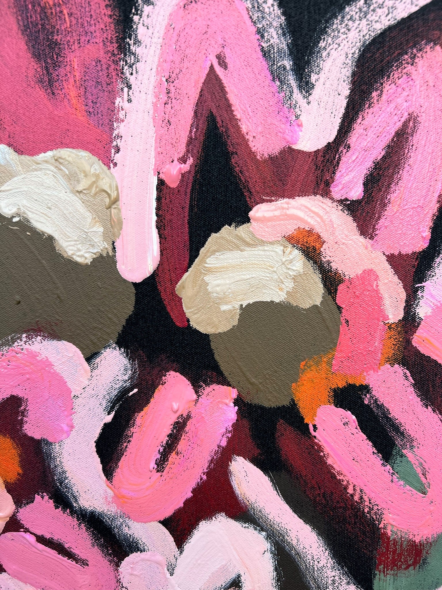 The flowers were created in an expressive style in the colours of love! Eye catching vibrant pinks, delicious apricots, peaches, melons, sage and olive greens have been painted onto a deep charcoal background that would suit a range of different decors.