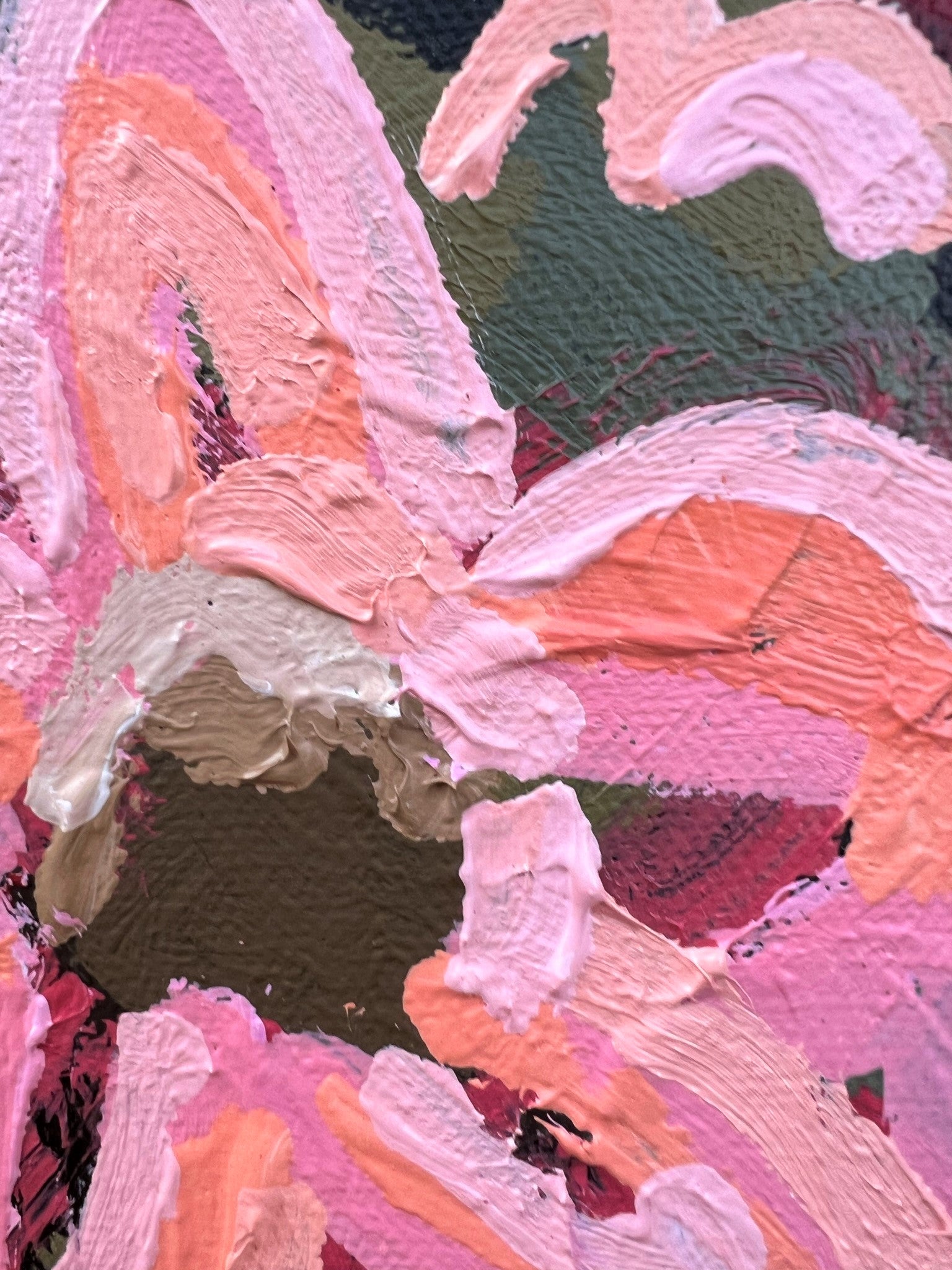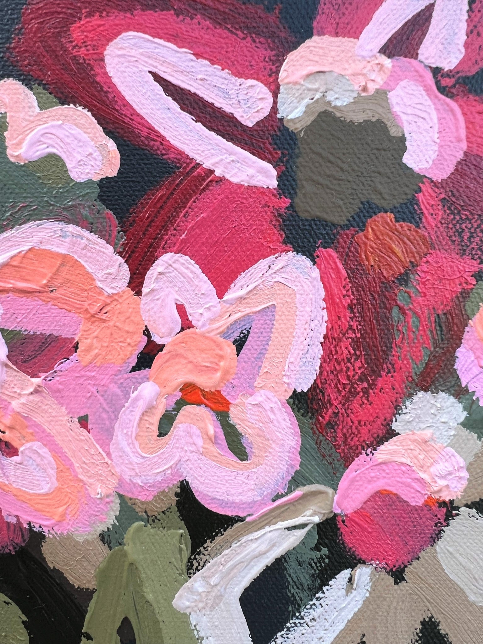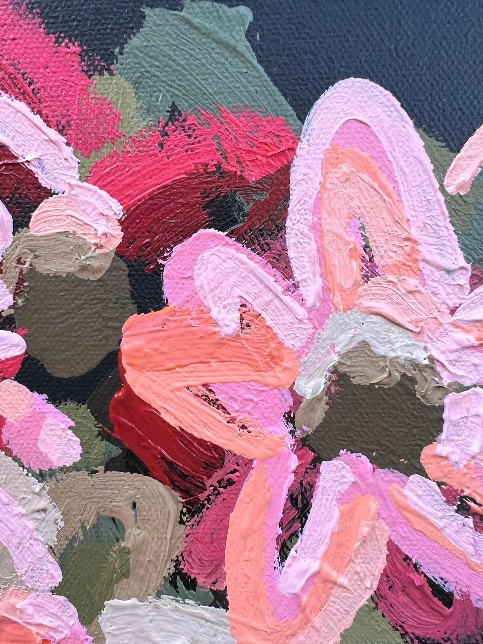 These flowers are painted with texture in an expressive style in vibrant pinks, delicious apricots, peaches, melons, sage and olive green and a touch of soft earthy tones that would suit a range of different decors