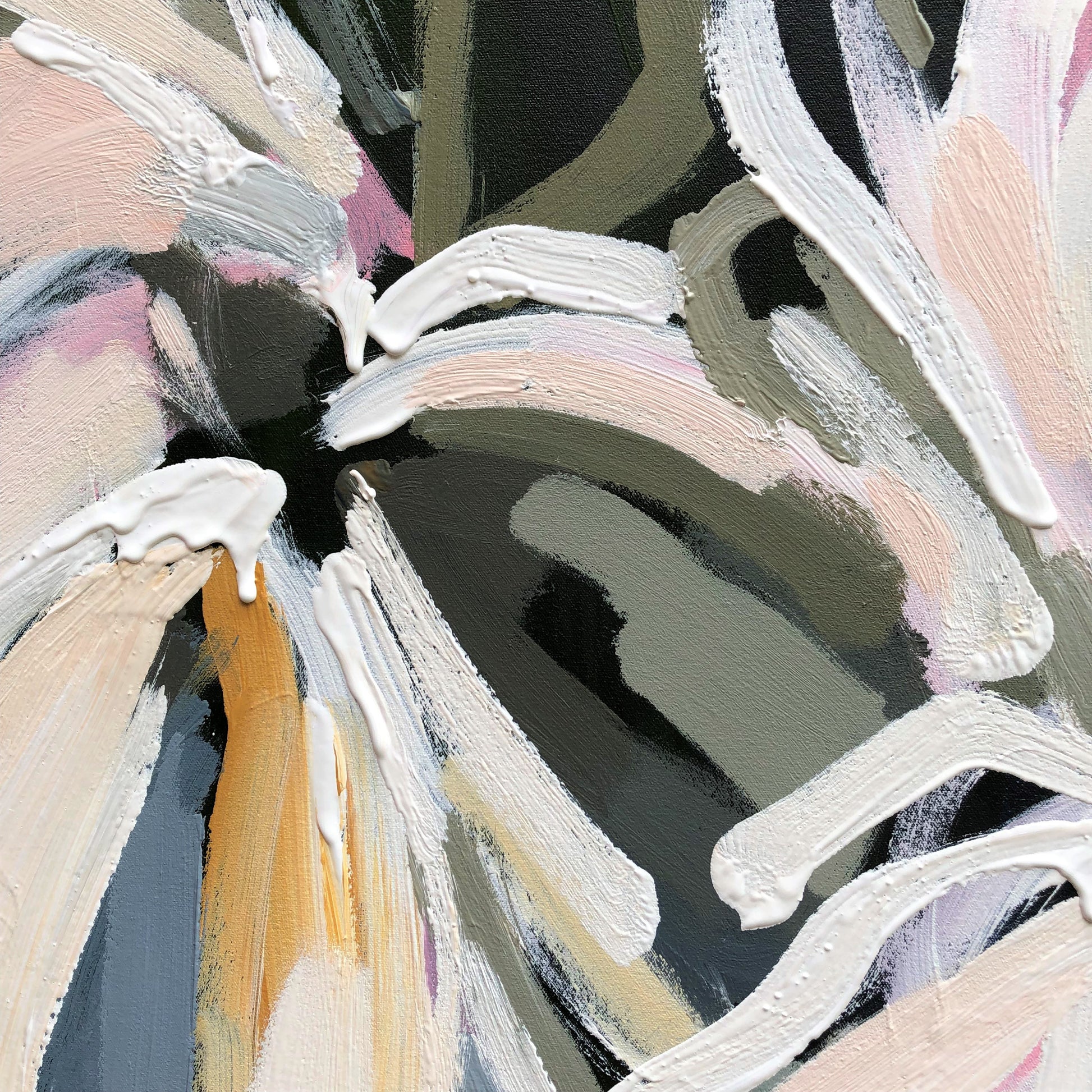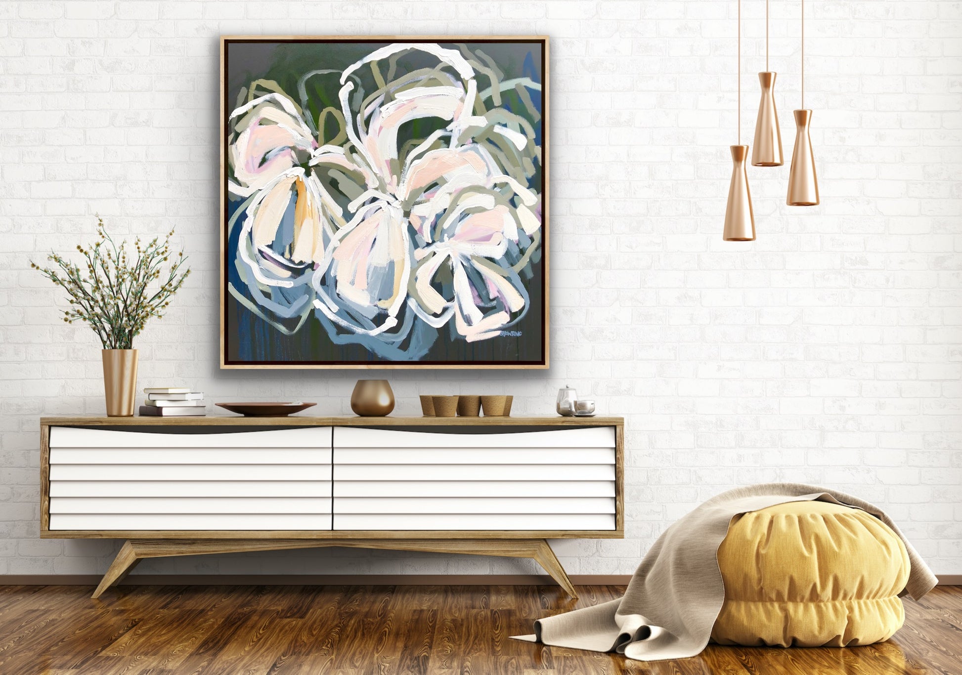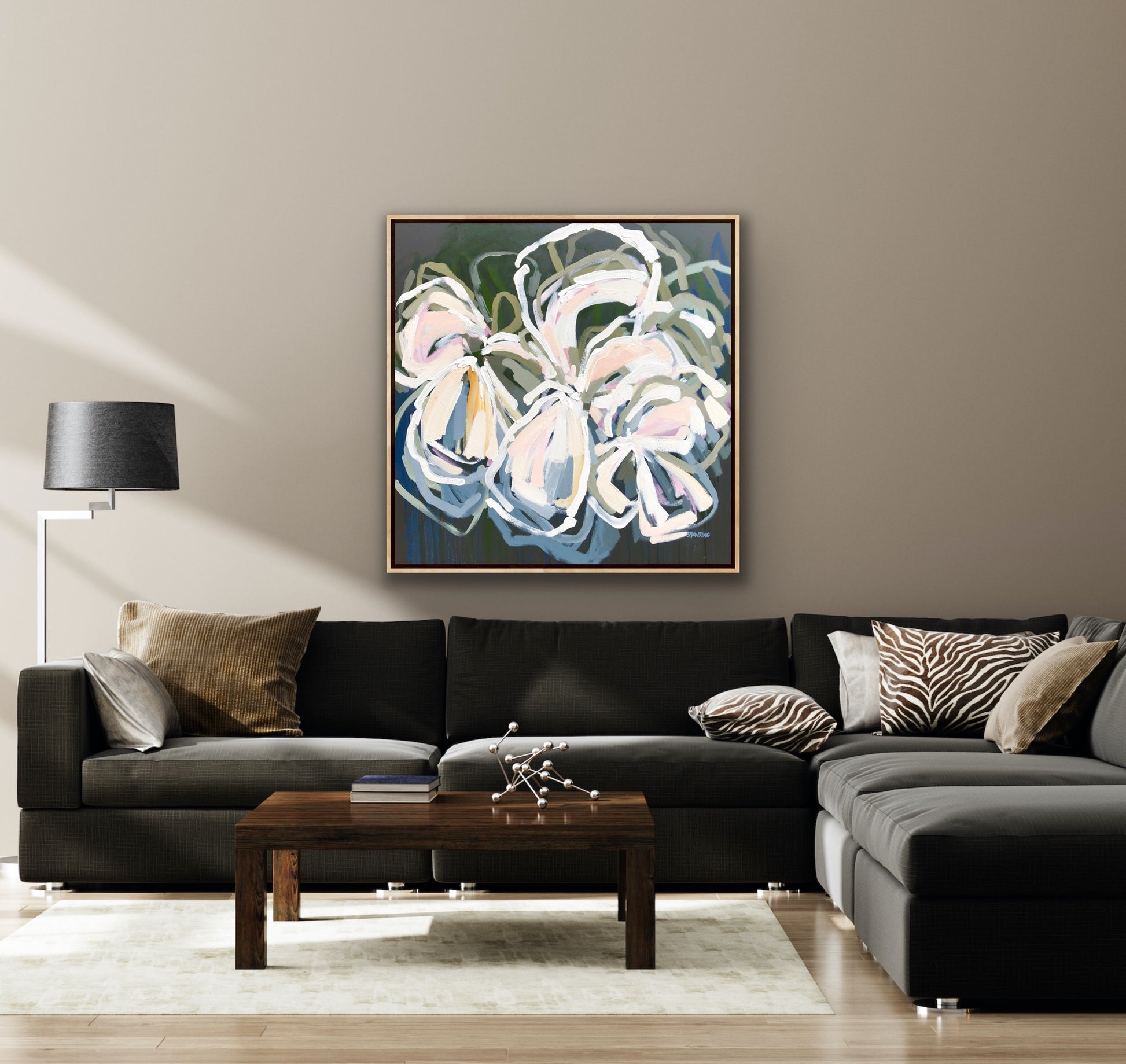 Totally Love You packs a big bright punch of bold colour! Powerful abstract with bright creams, earthy tones, pinks, melons, sage greens and blue highlights. This painting has expressive individual brushstrokes that bring it to life!