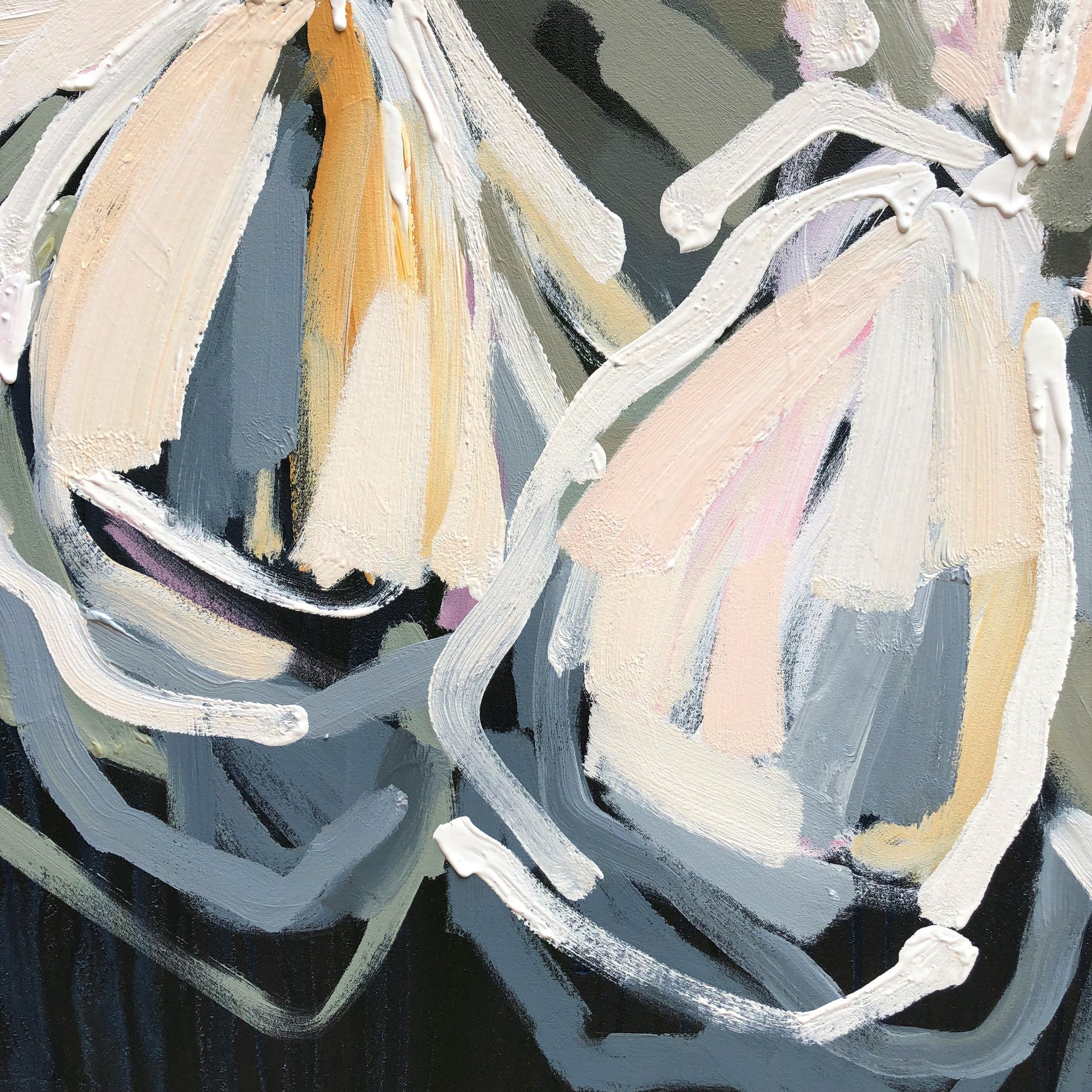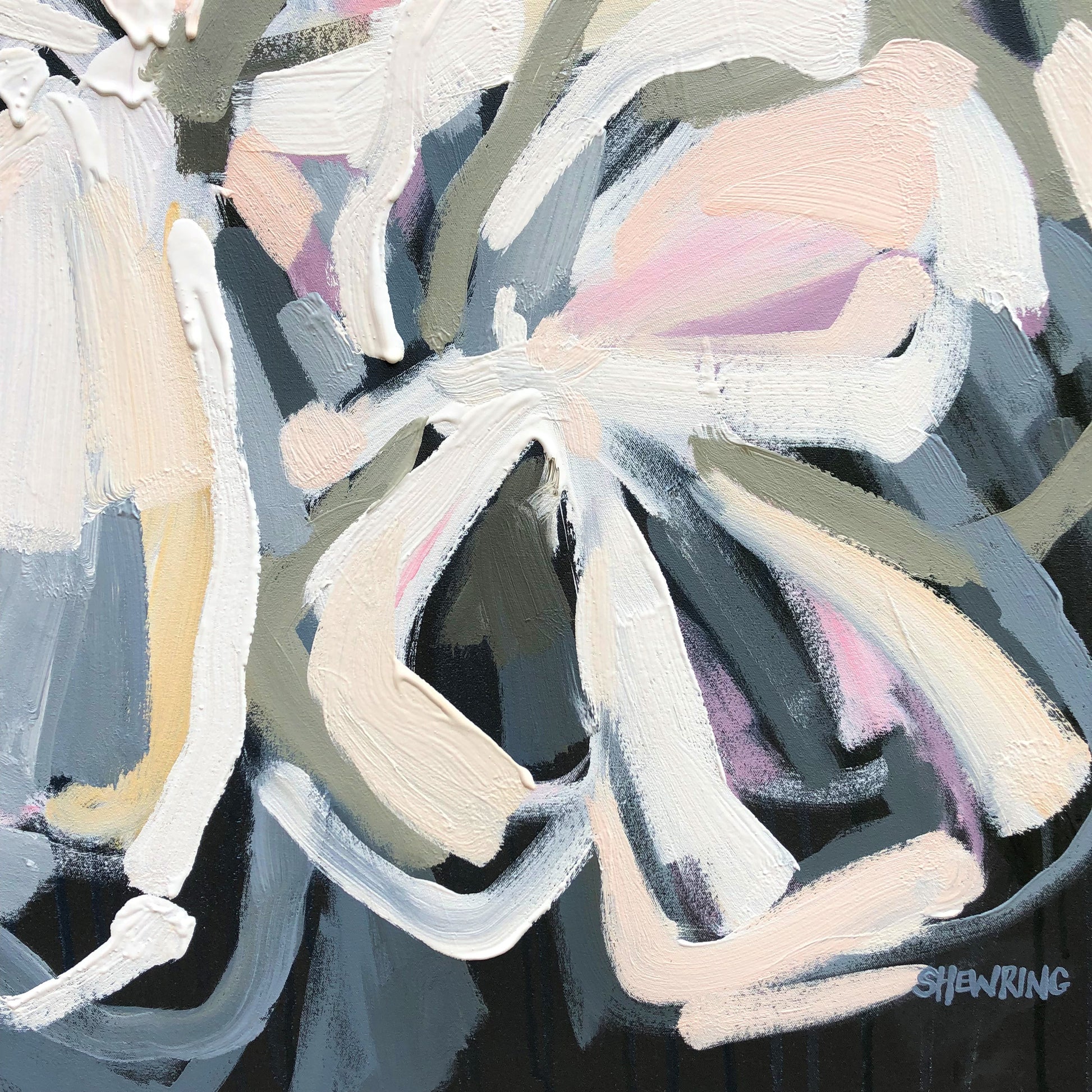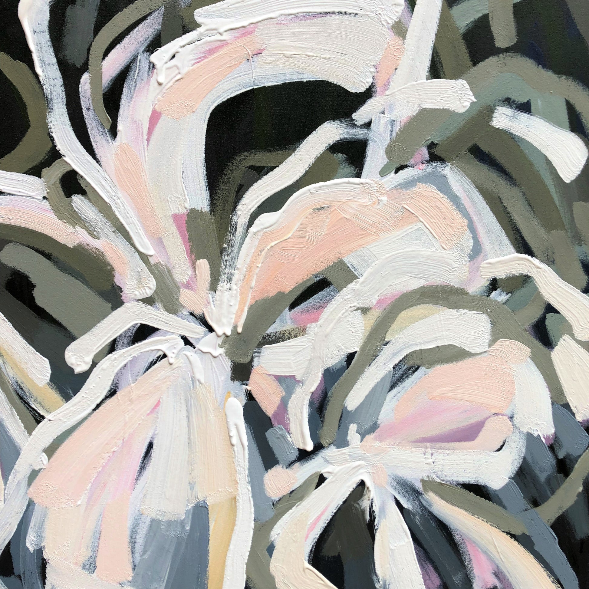 Totally Love You packs a big bright punch of bold colour! Powerful abstract with bright creams, earthy tones, pinks, melons, sage greens and blue highlights. This painting has expressive individual brushstrokes that bring it to life!