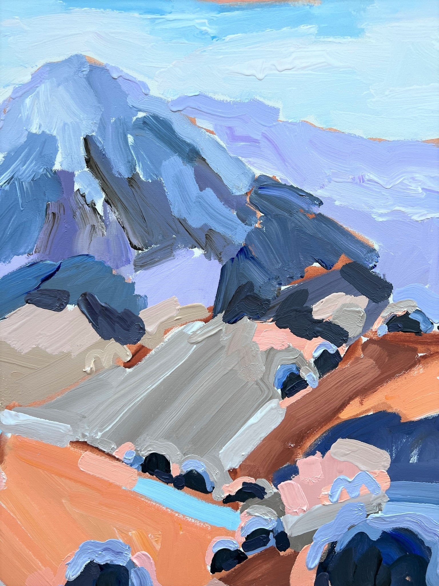 Tranquility Base was inspired by my visit to the beautiful Victorian countryside around Mount Macedon in Australia. From the property where we were staying was a view straight out to the majestic misty mountaintop and the lush grasslands below were covered in kangaroos basking in the sunshine. I wandered into these fields and found that the kangaroos all stopped eating and grooming to stare at me! It was a wonderful moment. I've tried to capture the warmth of the day and the peaceful feeling of the countryside into this painting.