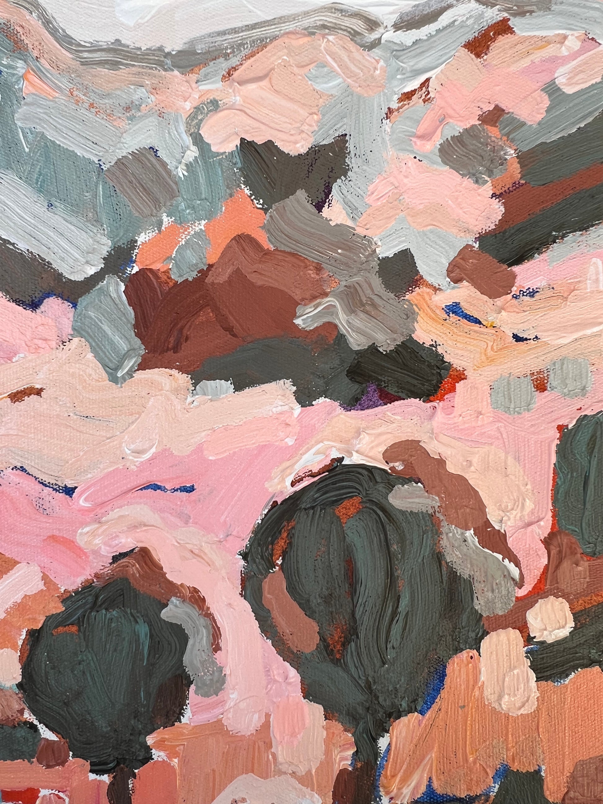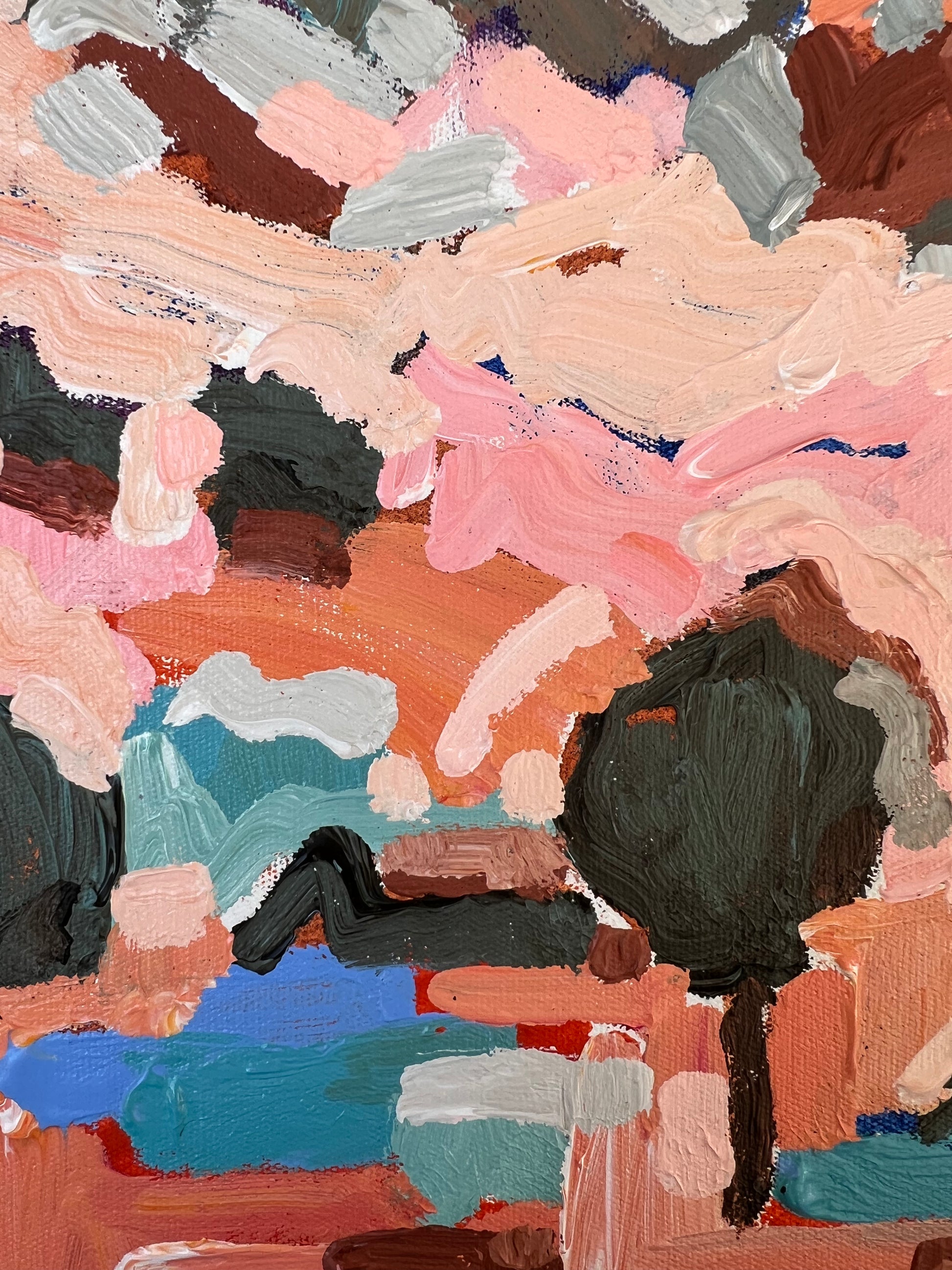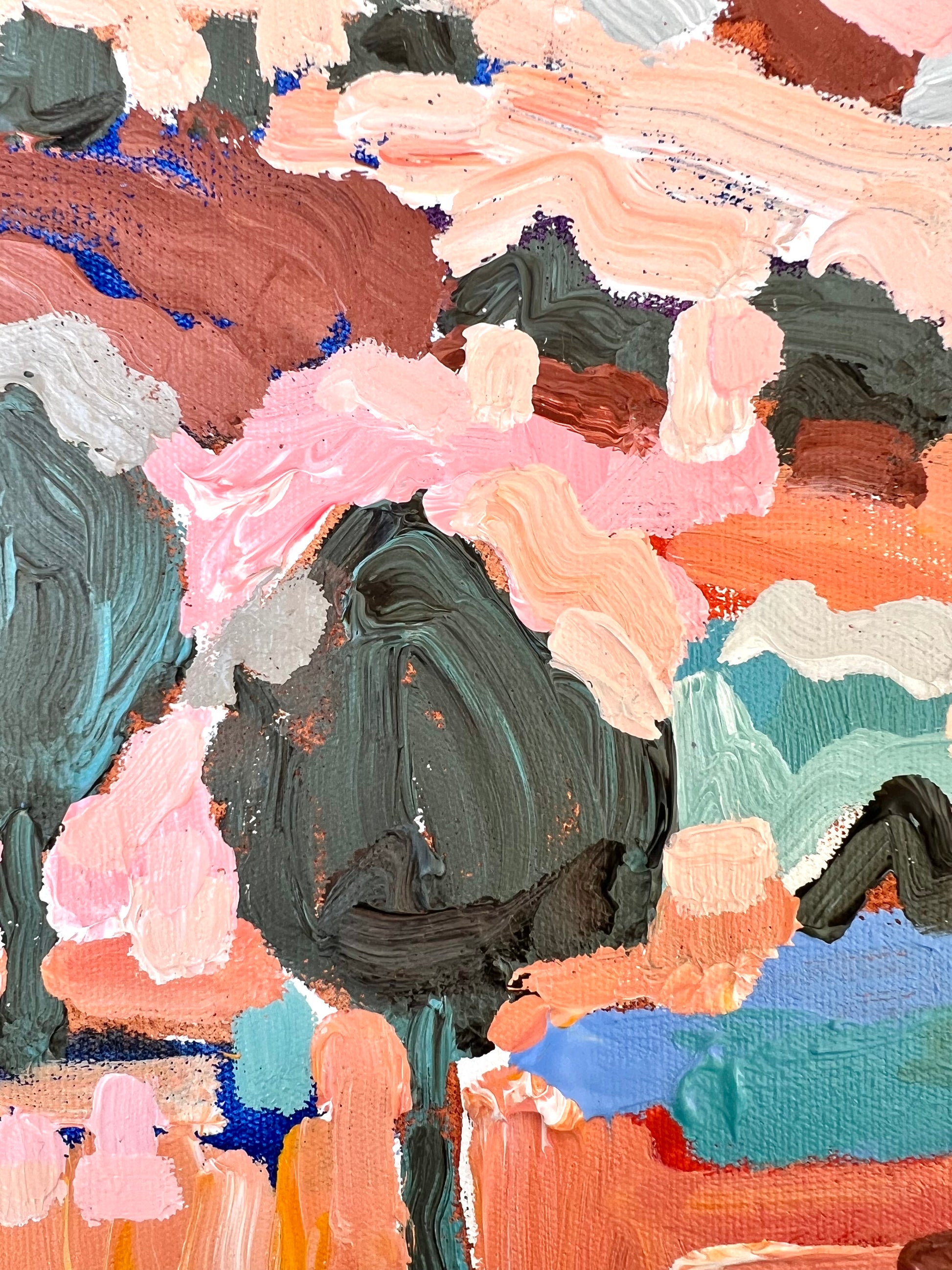 I am obsessed with colour and nature! Outside in the natural environment is where I spend my time sketching the organic forms that surround me. I take them back to my studio where I abstract the beauty and vibrancy of the experience into my paintings. What excites me is creating compositions using a luminous mix of rich colours and texture bringing the outdoors inside feeling happiness from connecting with nature.
