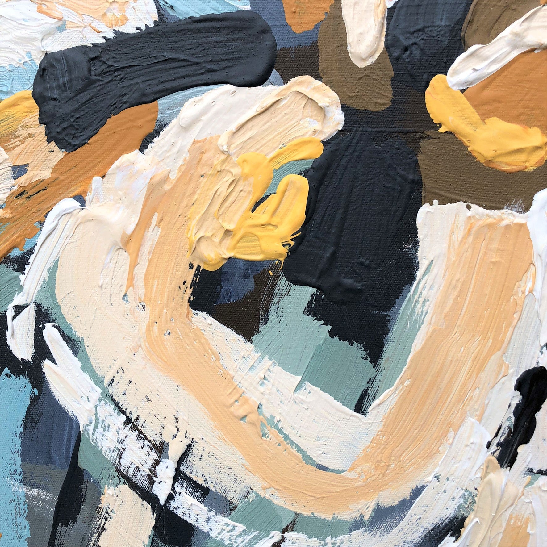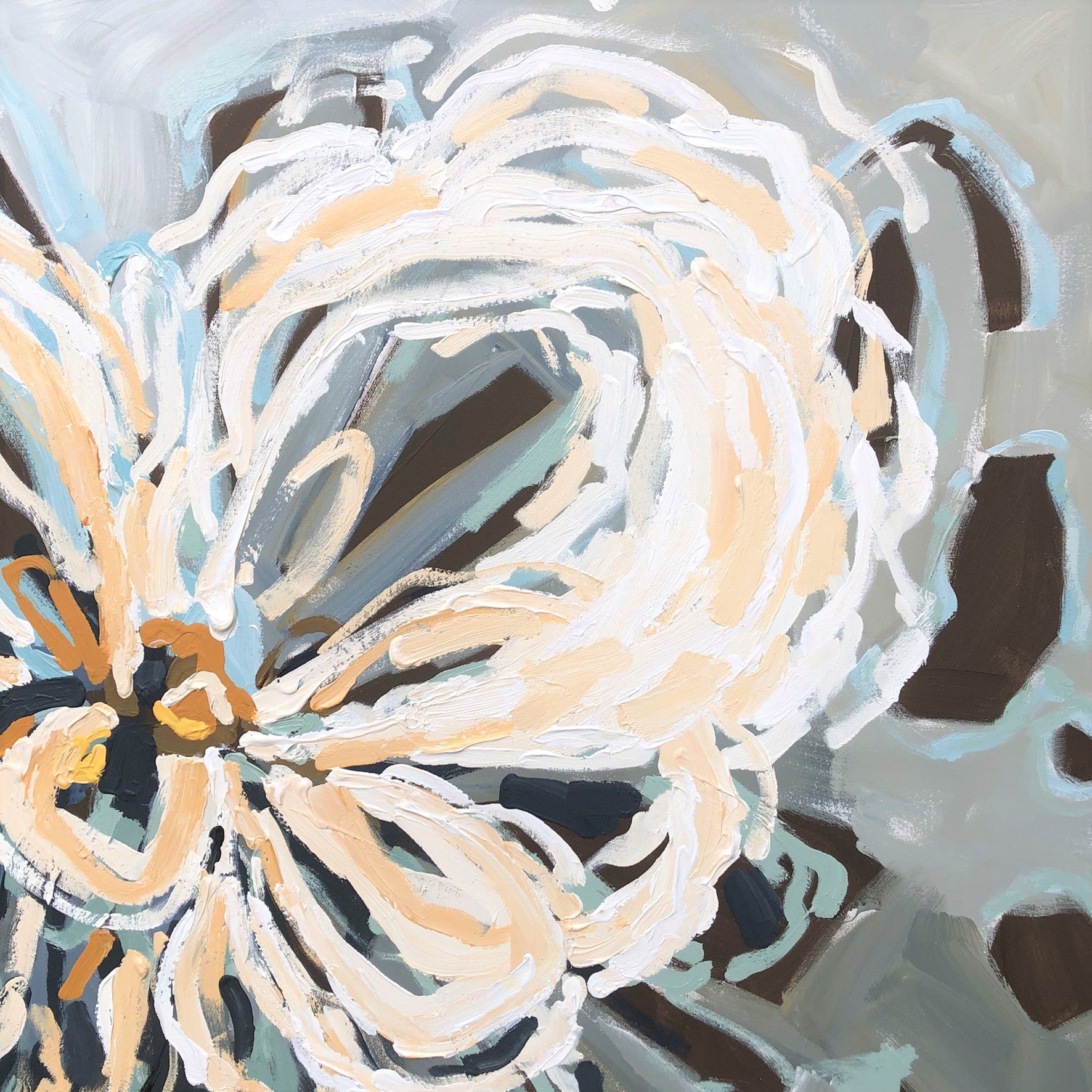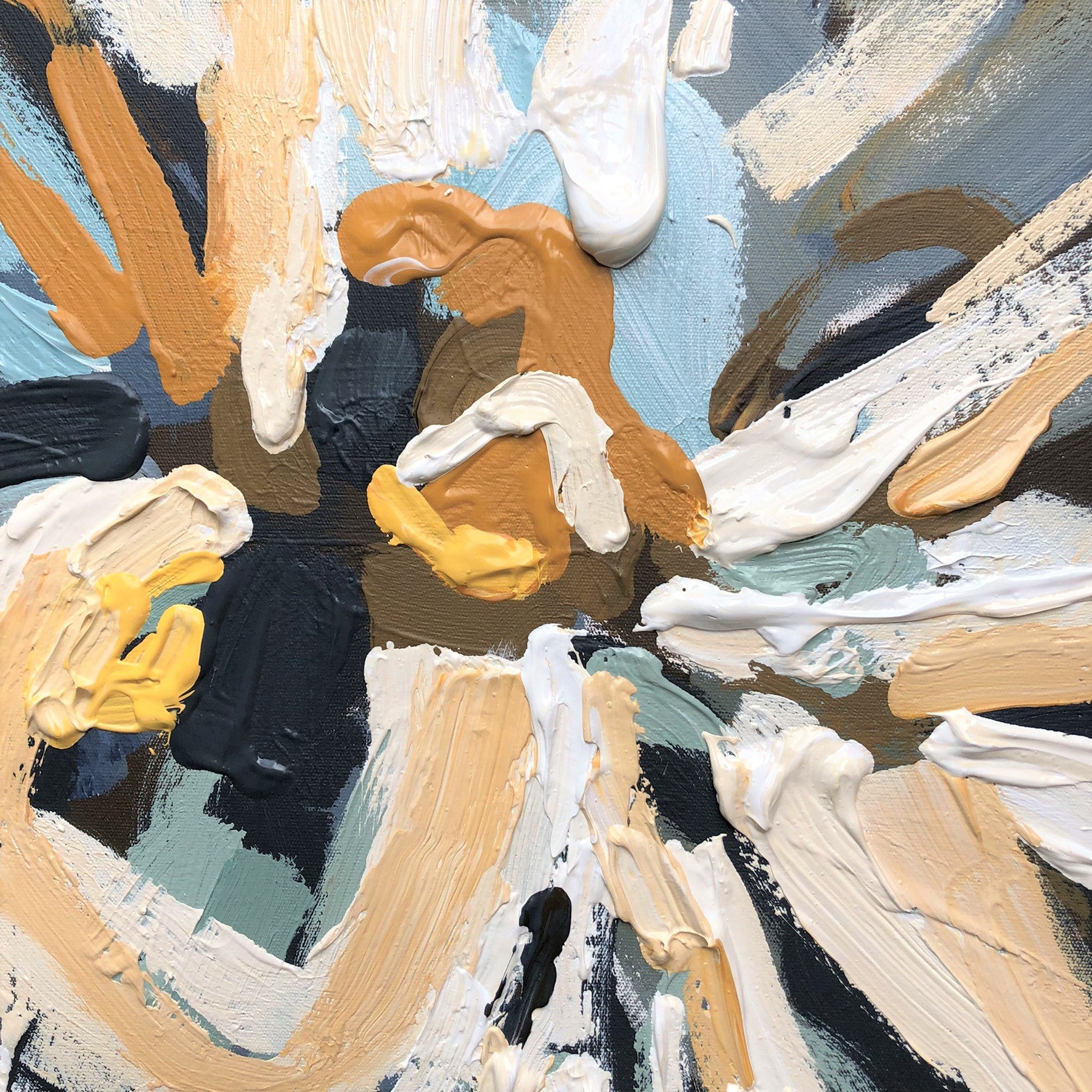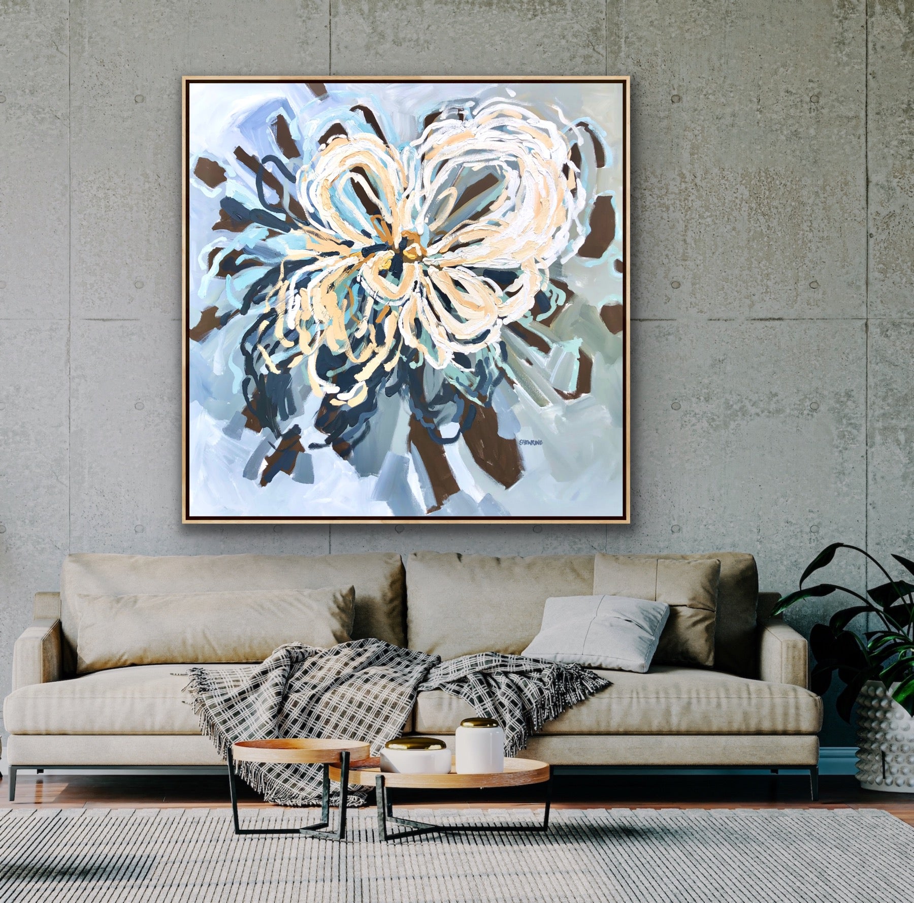 Winter Sun is a big powerful flower abstract with gorgeous sage green, blue/grey and leather coloured impressions of leaves with bursts of honey and butter colours in the flower. This painting was inspired by the Australian native Eucalyptus tree with its delicate flowers and has beautiful texture and expressive individual brushstrokes that bring it to life!
