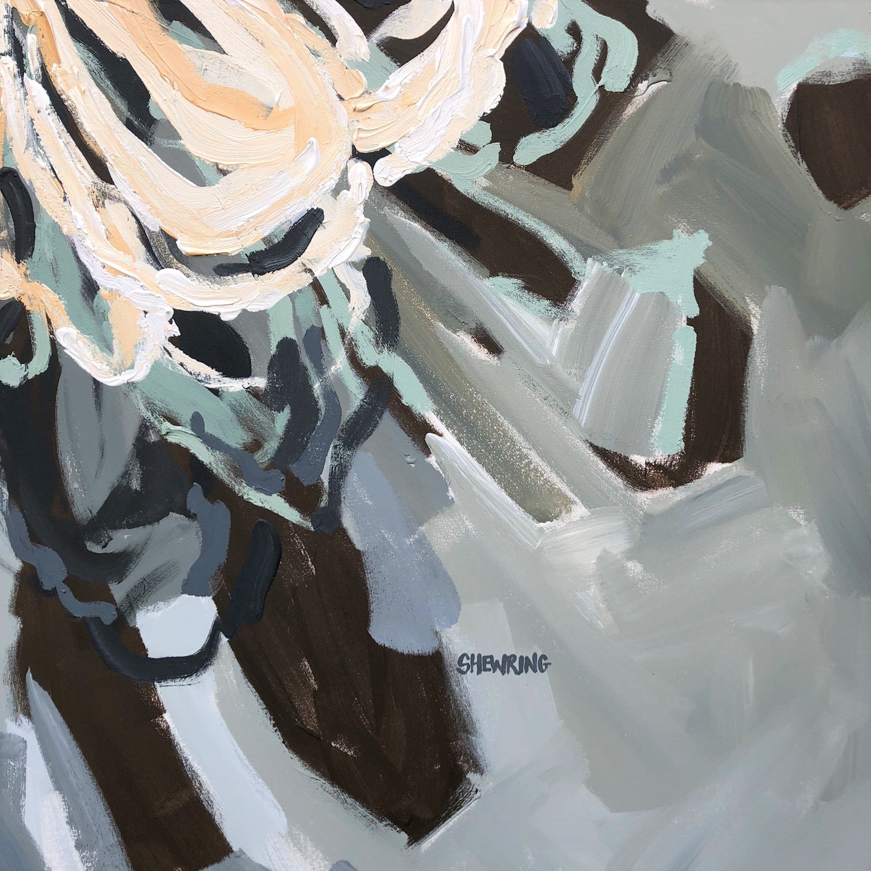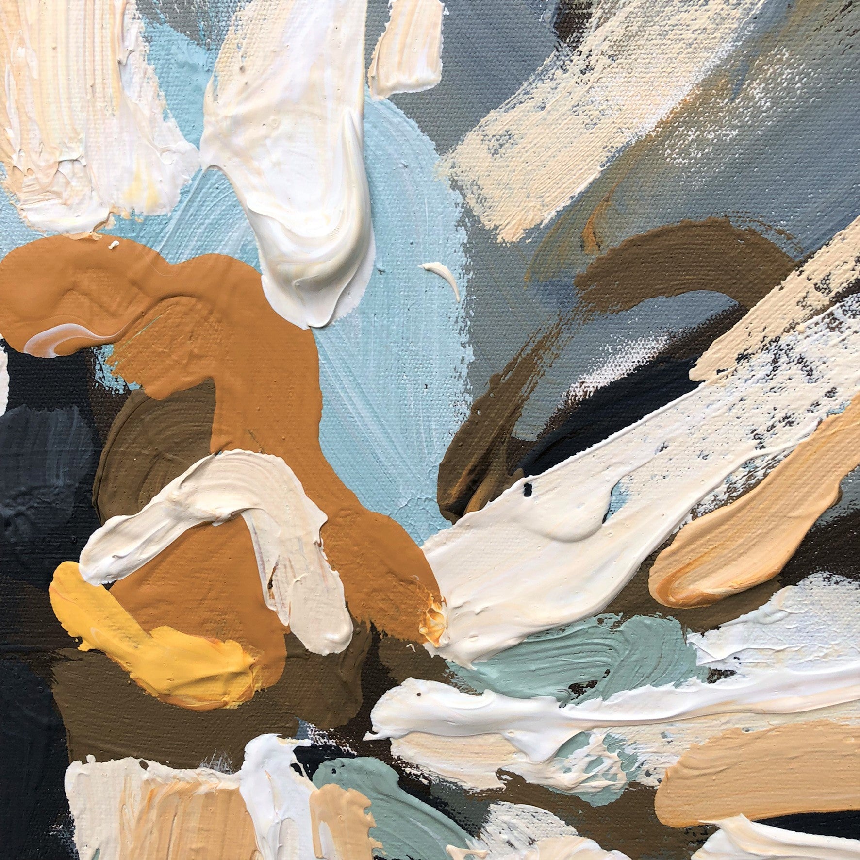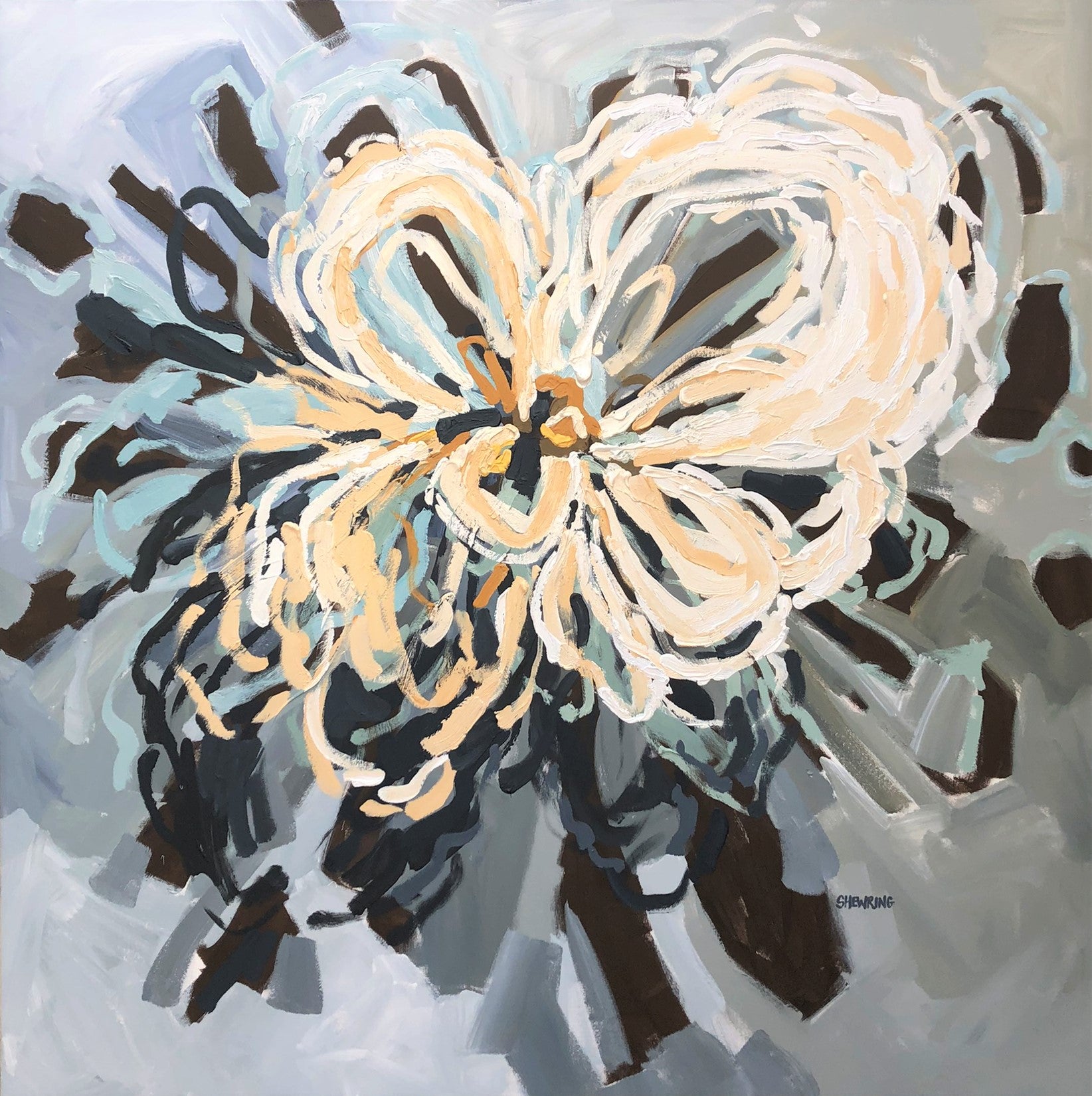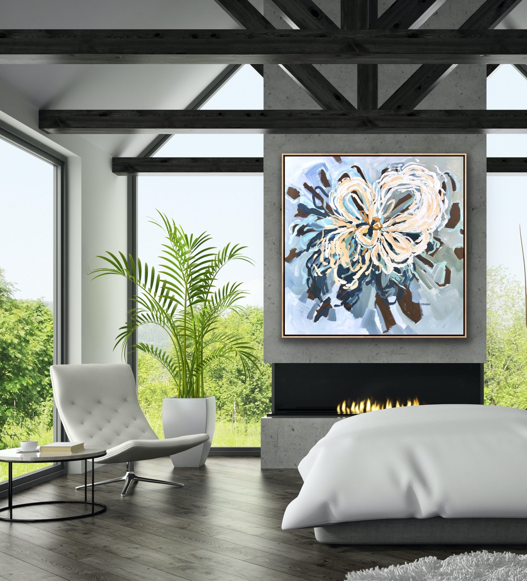 Winter Sun is a big powerful flower abstract with gorgeous sage green, blue/grey and leather coloured impressions of leaves with bursts of honey and butter colours in the flower. This painting was inspired by the Australian native Eucalyptus tree with its delicate flowers and has beautiful texture and expressive individual brushstrokes that bring it to life!