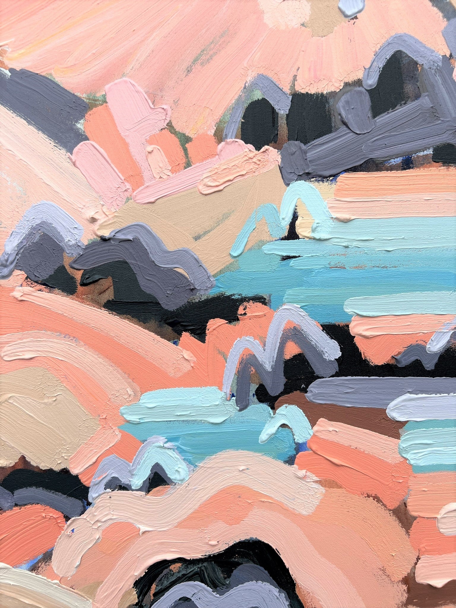 I am obsessed with colour and nature! Outside in the natural environment is where I spend my time sketching the organic forms that surround me. I take them back to my studio where I abstract the beauty and vibrancy of the experience into my paintings. What excites me is creating compositions using a luminous mix of rich colours and texture bringing the outdoors inside feeling happiness from connecting with nature.