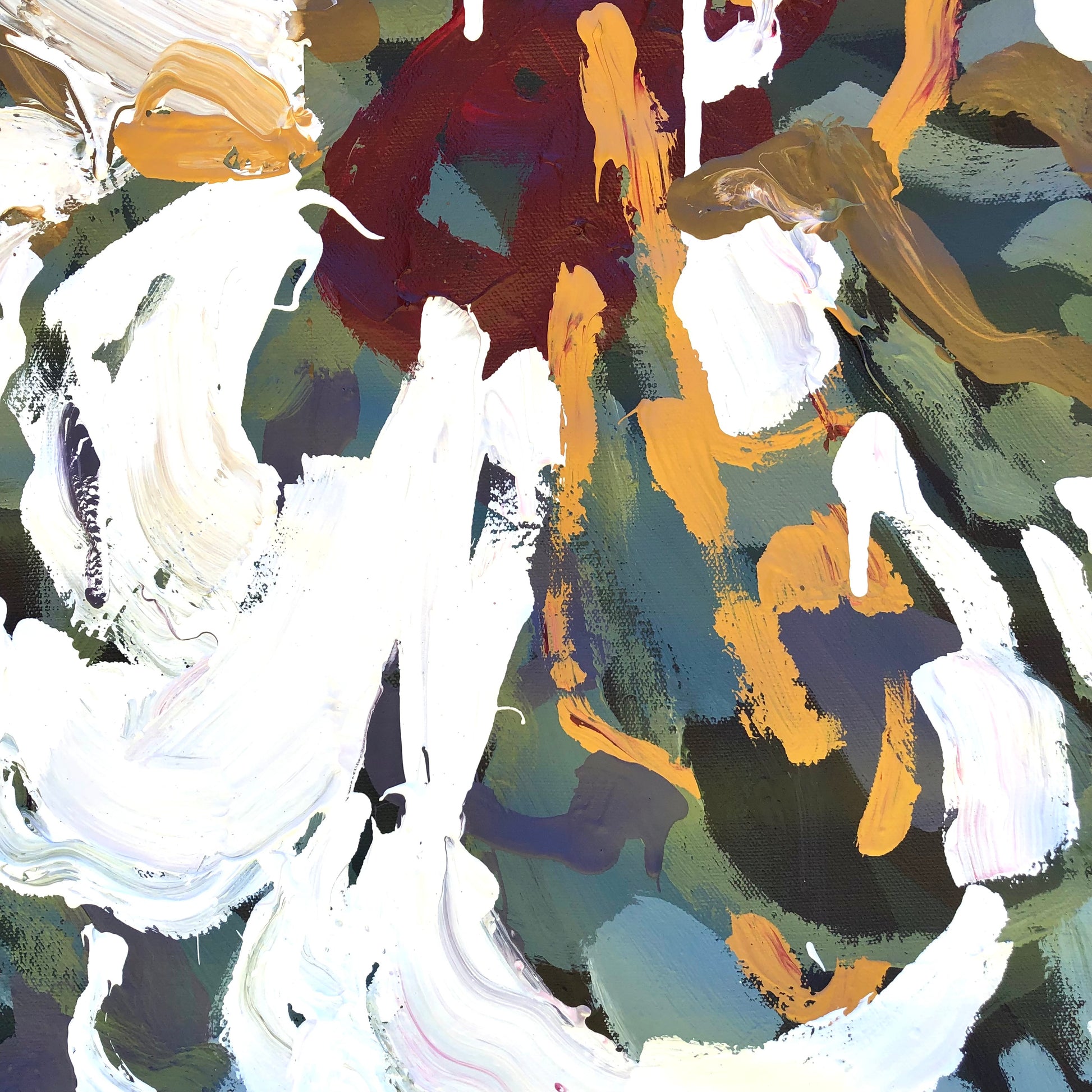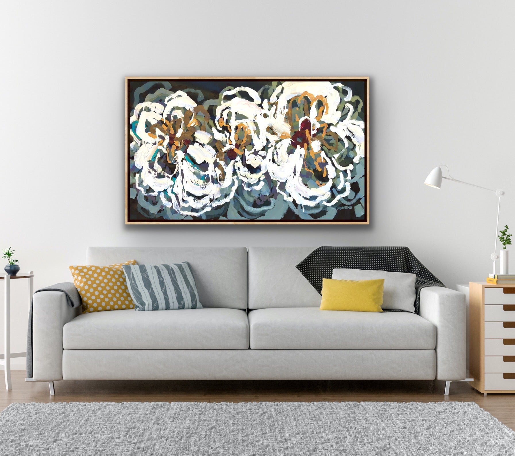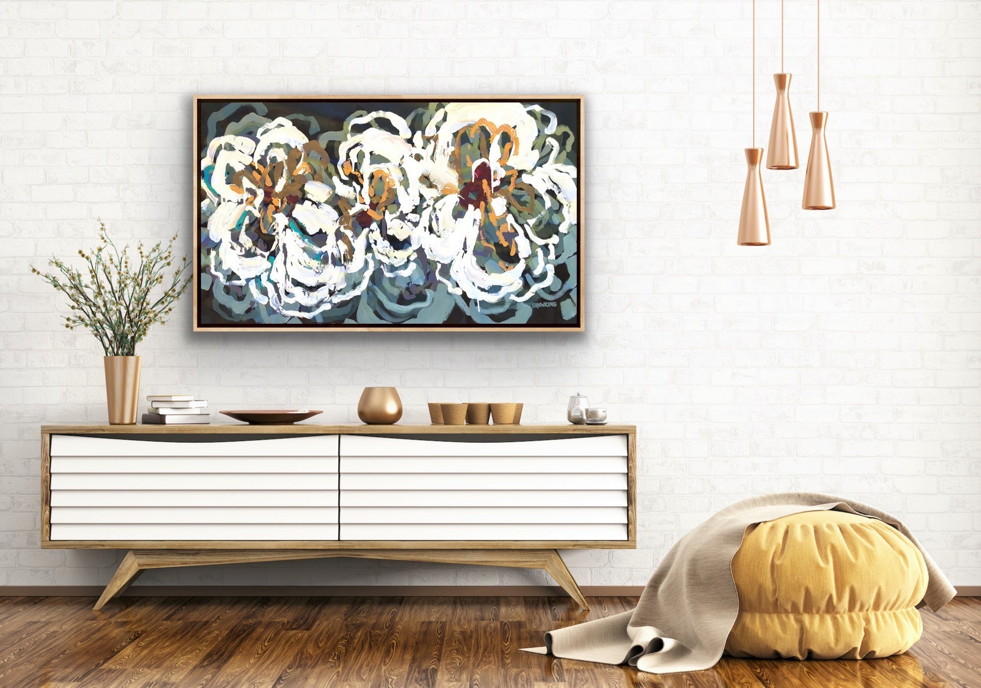 You're My Everything was inspired by the warm earth, blue and green tones found in the Australian native trees and landscape. I painted the flowers in an abstract expressive style in bright white with gum tree blue, sage green and bursts of deep crimson and a hint of turquoise in the foliage. This painting would suit a range of different decors.