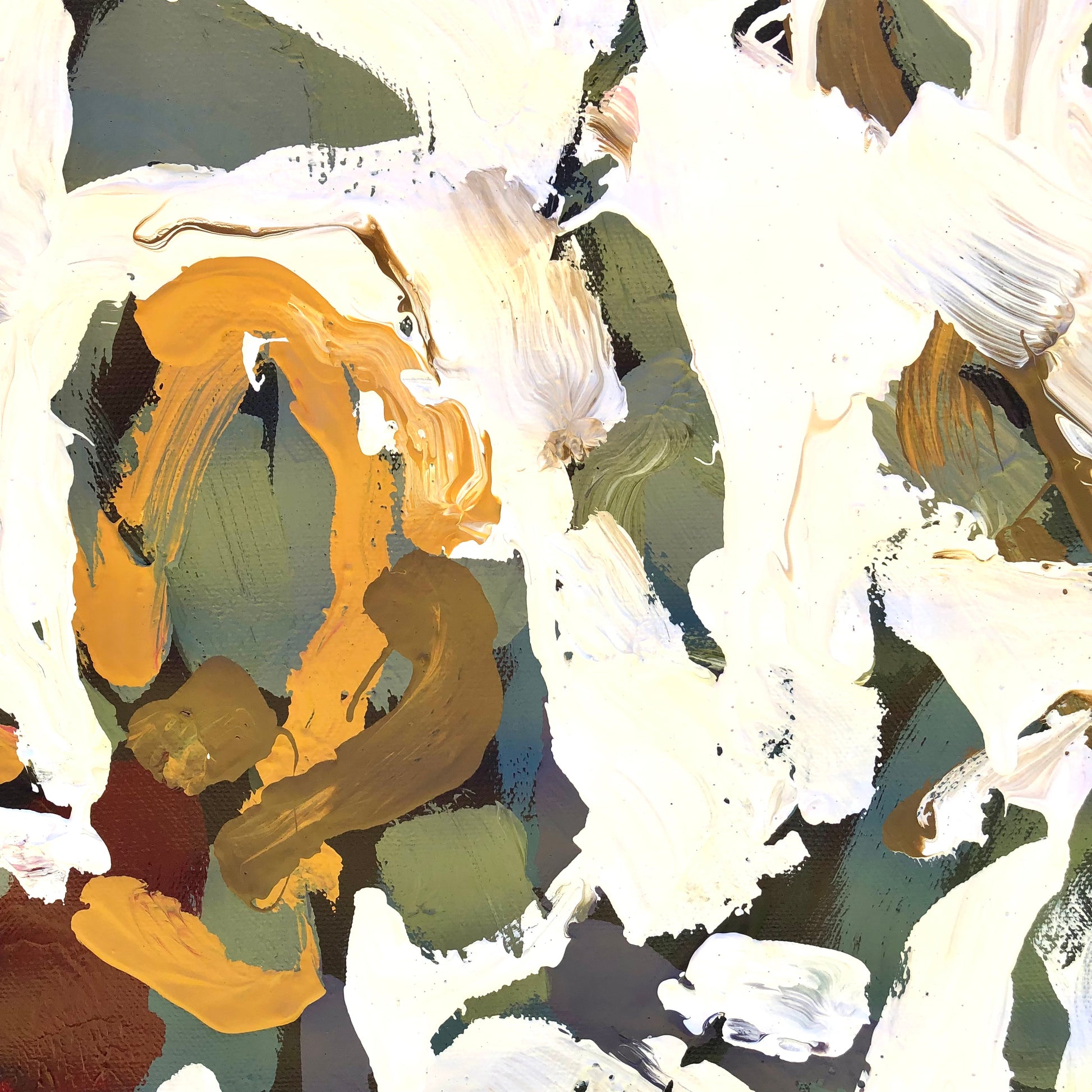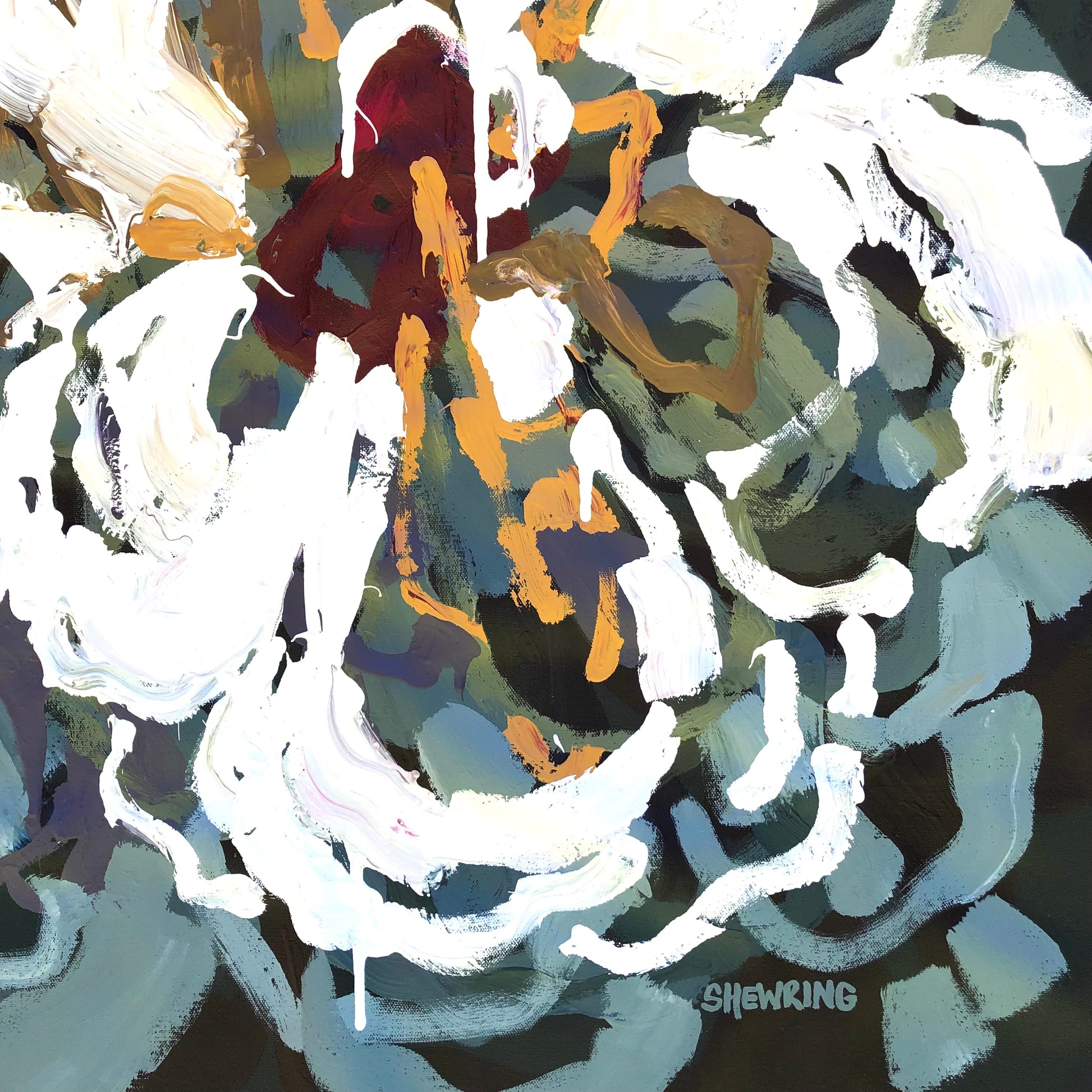 My artwork is full of life, movement and colour with loose organic shapes taken from nature. In this painting I place their beauty over a dramatic warm charcoal background.